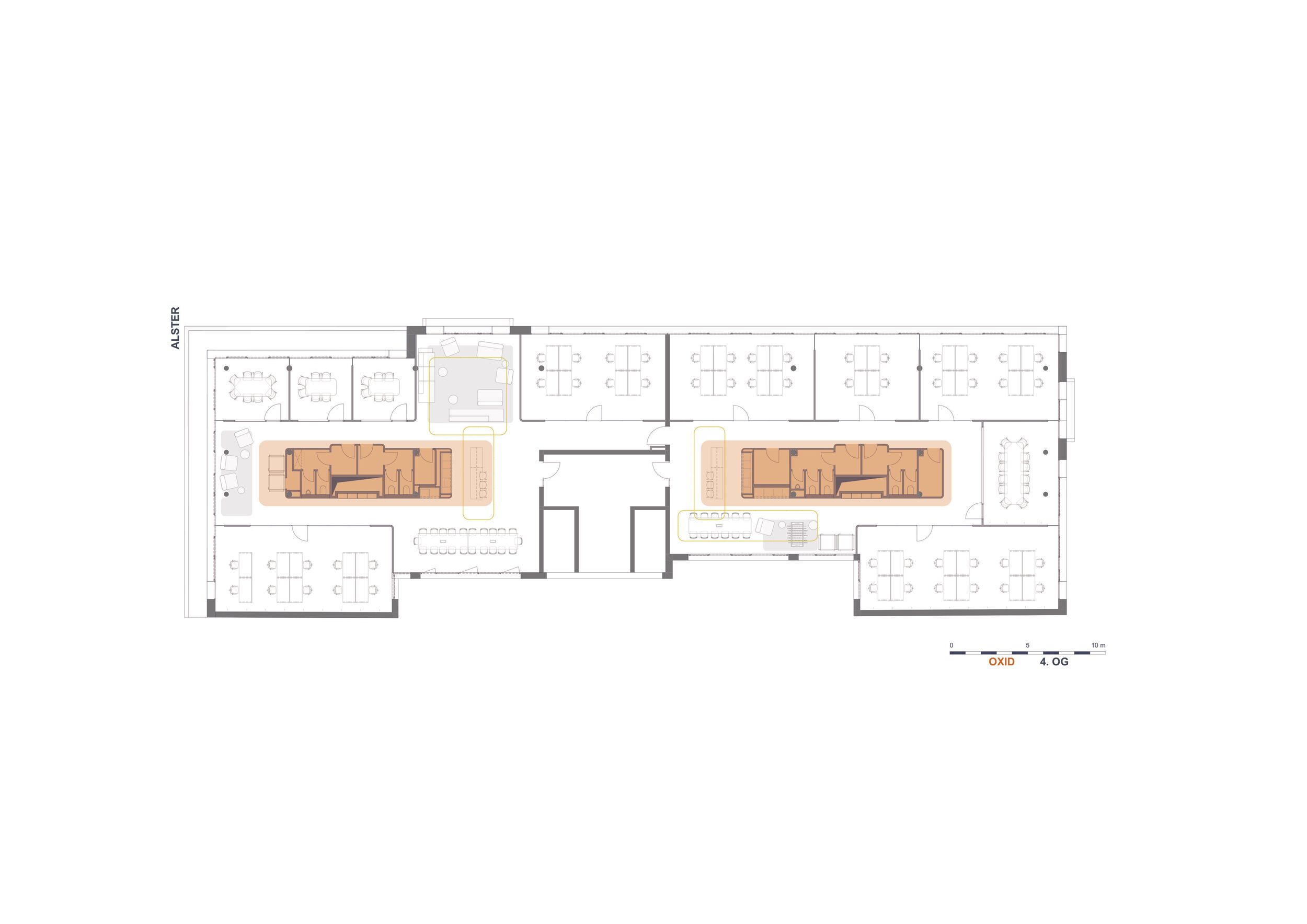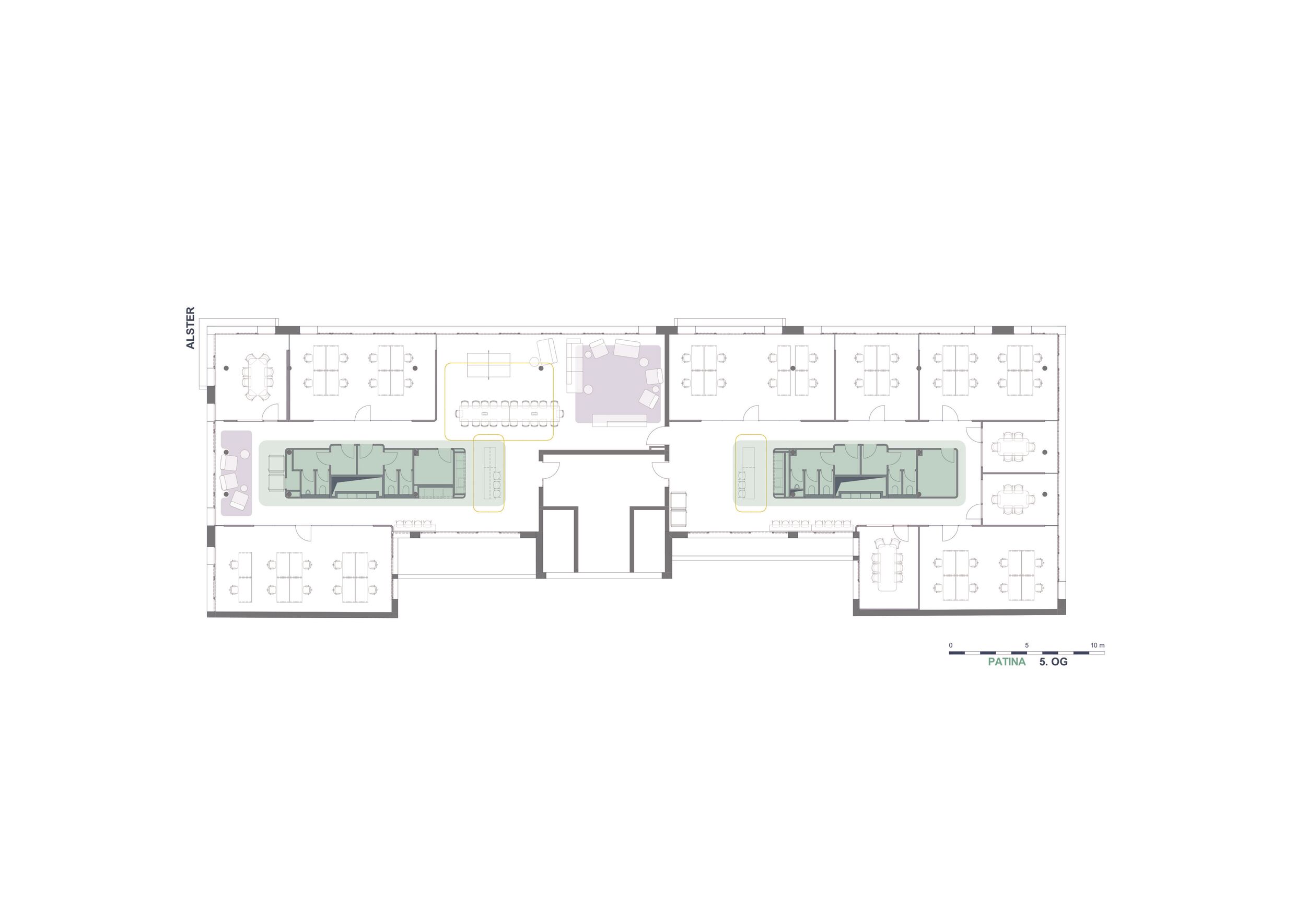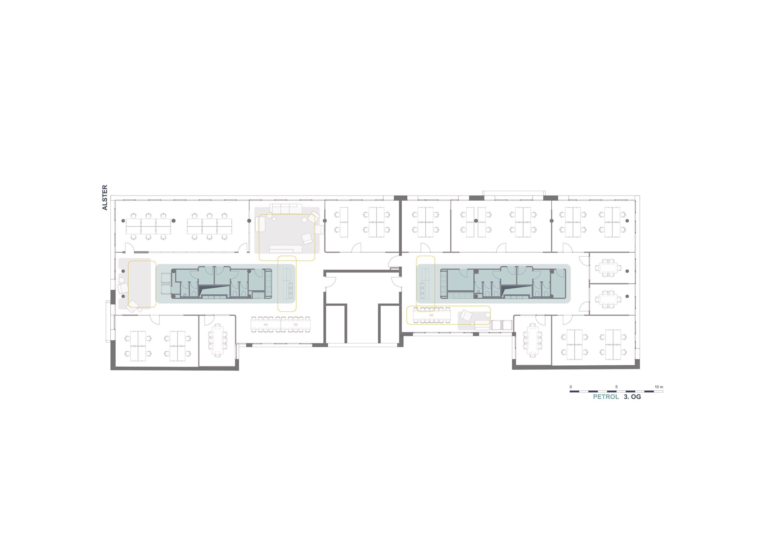 Beizubehalten wurden die als „Kreativgaragen“ bezeichneten hellen, puristischen Arbeitsräume, die ein ungestörtes Arbeiten für 6-8 Personen ermöglichen, und hier wie dort entlang der Fassade angeordnet sind.