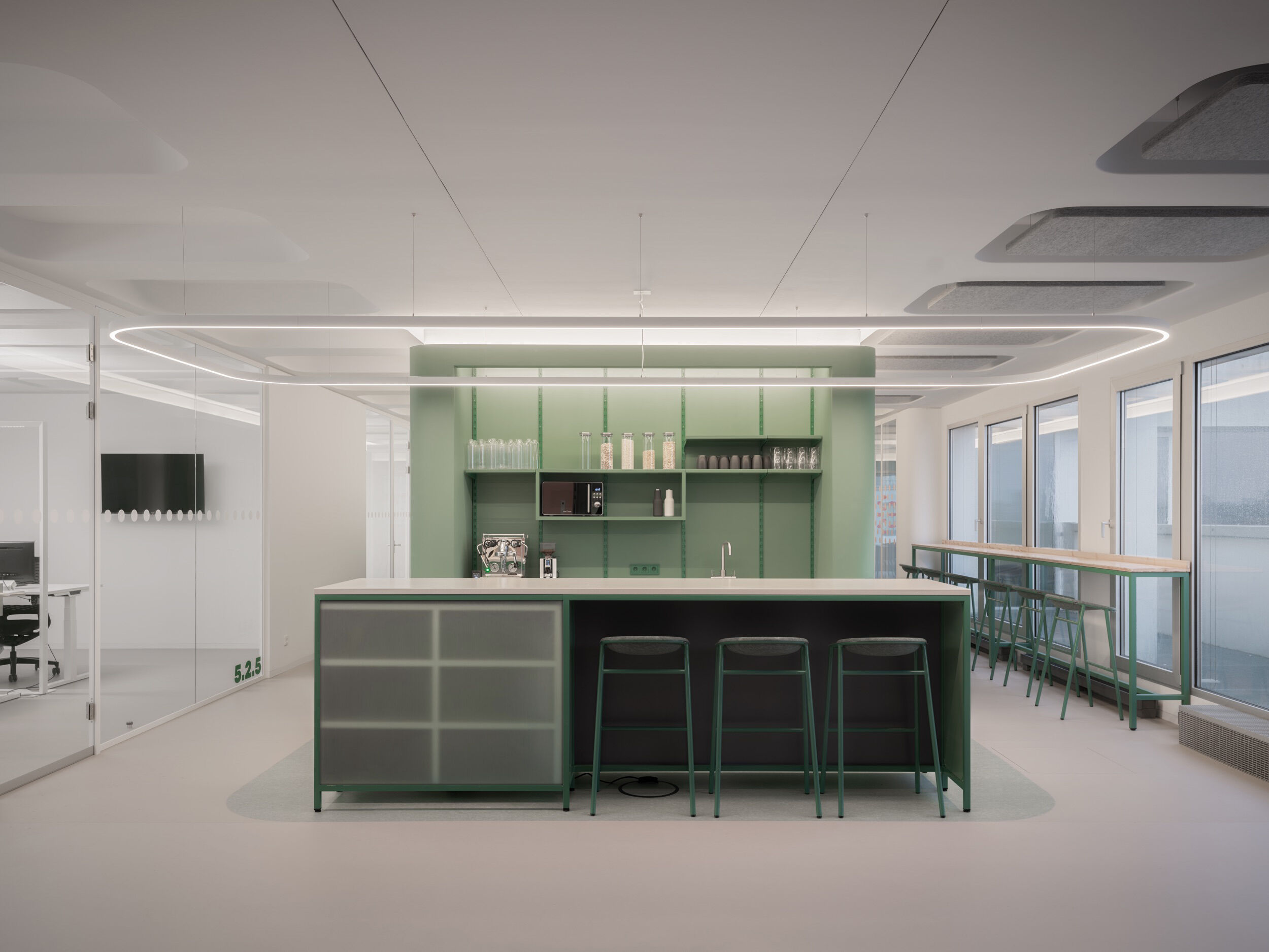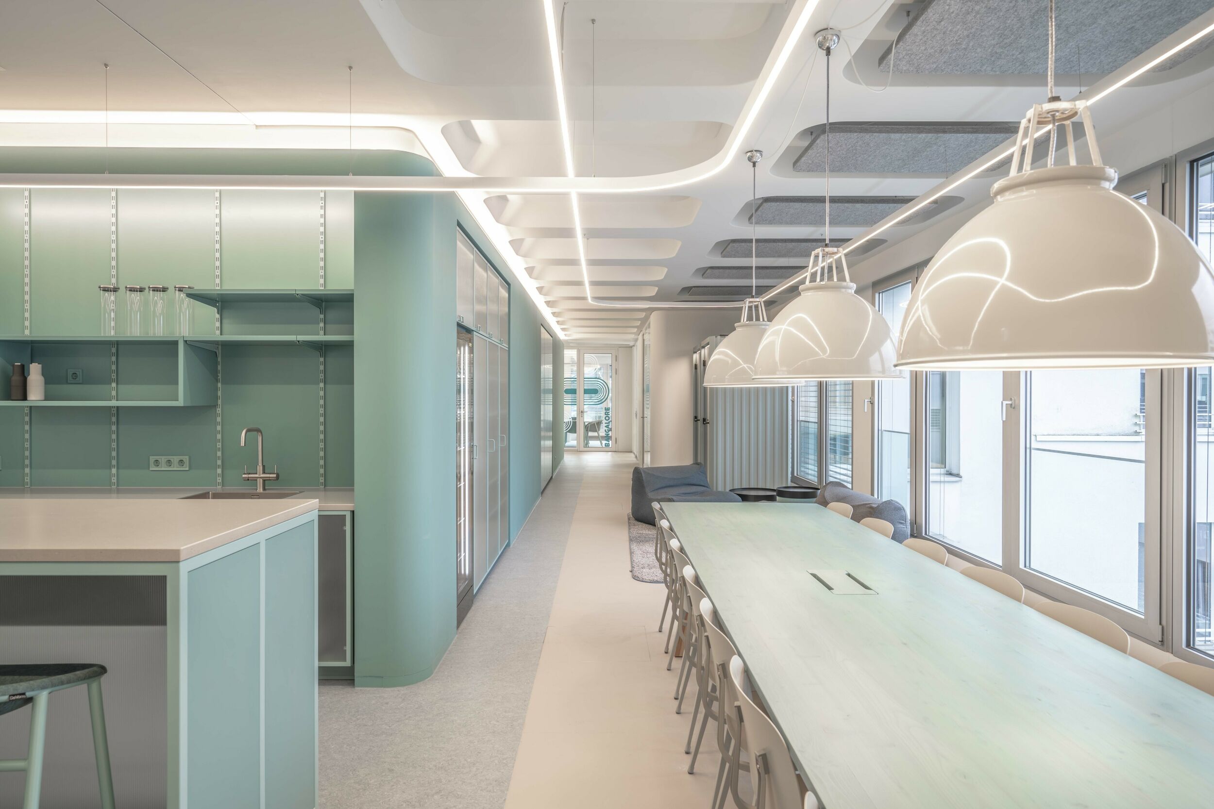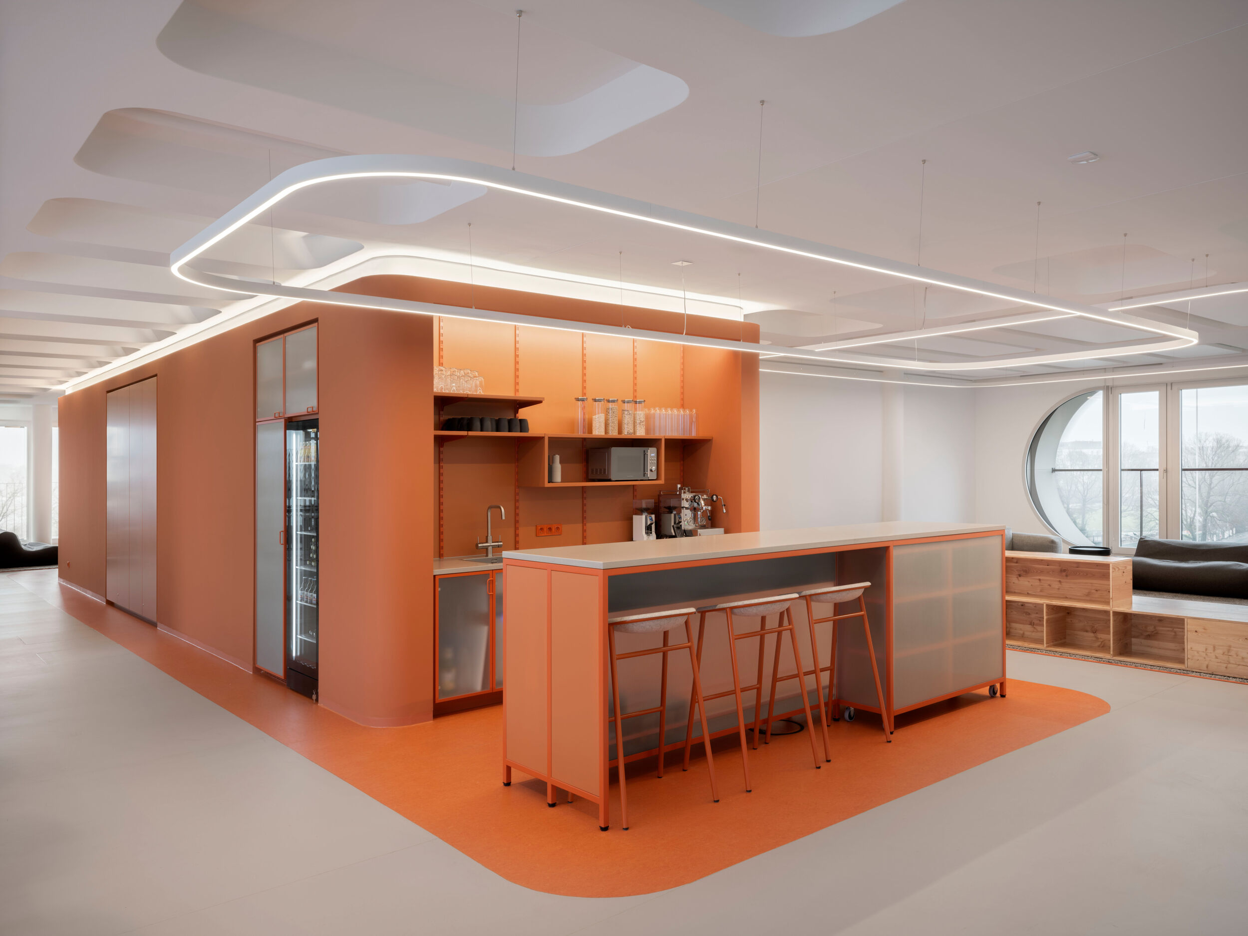 Die drei Etagen mit jeweils um die 800 Quadratmeter Fläche verfügen über eine ausgewogene Mischung aus Arbeits- und Rückzugszonen für die Mitarbeiter. Neben den weißen, lichtdurchfluteten, beruhigten Bereichen für konzentriertes Arbeiten, den „Kreativgaragen“, sind große, farbig markierte, anregende Bereiche dem intensiven Austausch gewidmet: Die Loungeflächen sind jeweils an den Kreuzungspunkten, Eingangsbereichen und Funktionskernen zusammengefasst angeordnet. Teeküche, Loungeflächen und Essbereich für gemeinsame Mahlzeiten oder Feiern sind offen, großzügig und „ehrlich und ruppig“ gestaltet. Dem Werkstattcharakter entsprechen in der Materialität die „Werkstattfarben“, Petrol, Patina und Oxid, Stahlrahmen, Riffelglas und unbehandelte Holzoberflächen. Tresen, Esstische und Tribünen der Loungebereiche wurden eigens von BAID für den Ausbau entworfen und von einer Tischlerei angefertigt. Ess- und Loungebereiche sind von Lichtringen überfangen, die einander überlagern und dadurch die einzelnen Bereiche zusammenfassen.