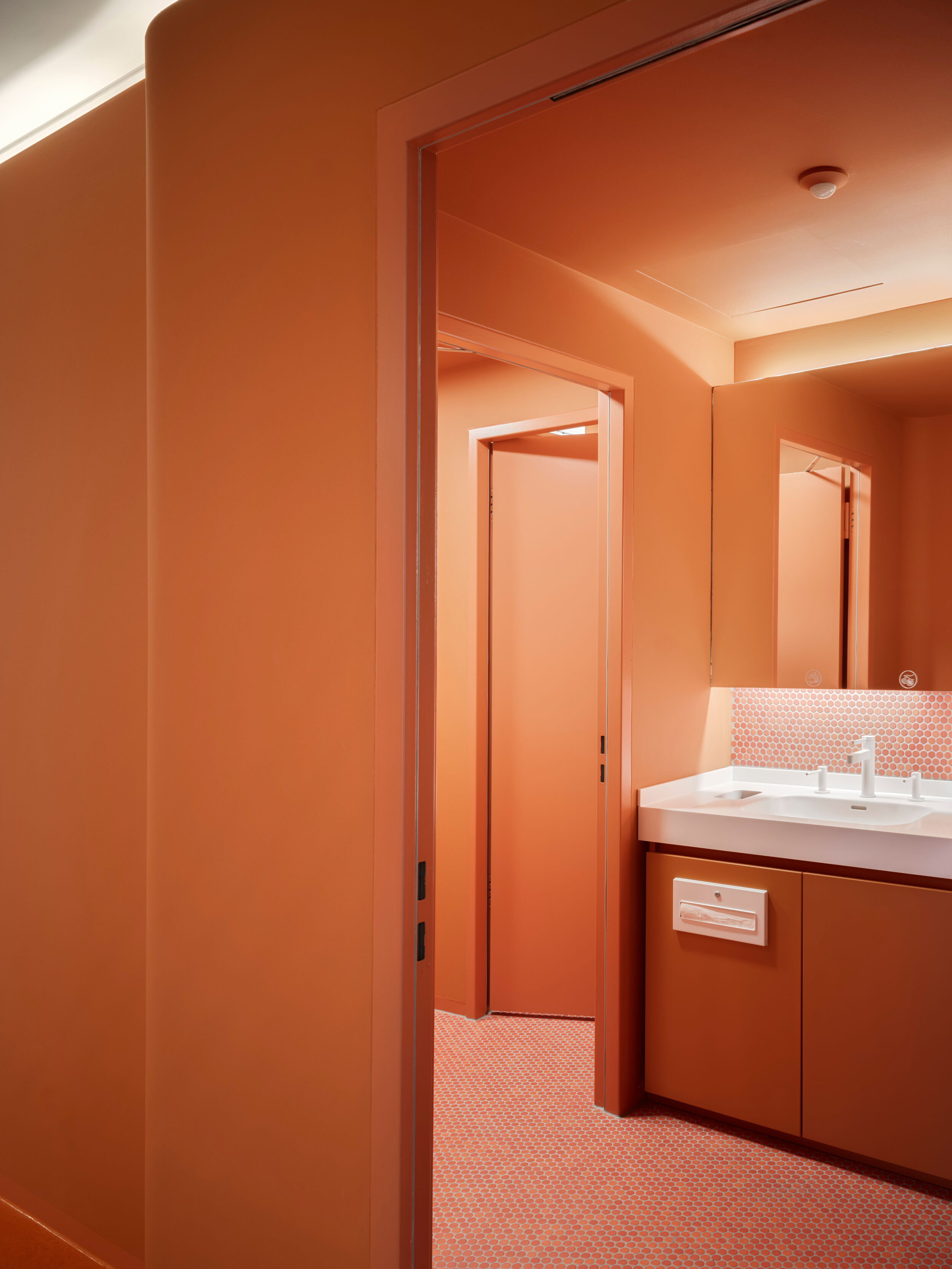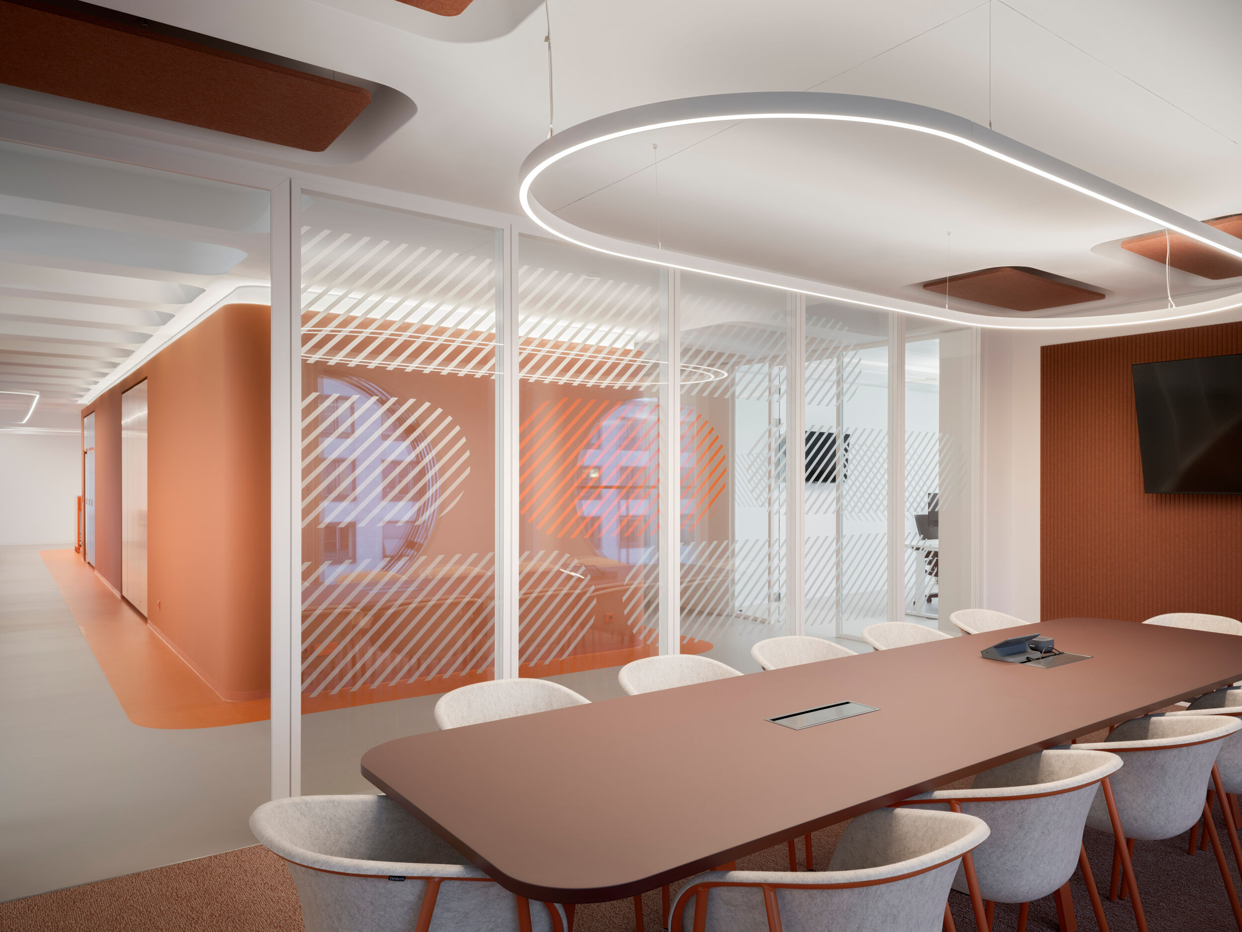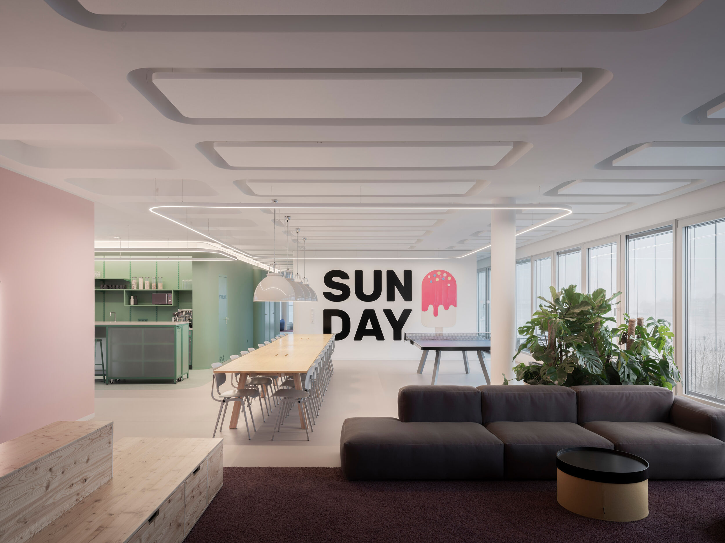 Die drei Etagen mit jeweils um die 800 Quadratmeter Fläche verfügen über eine ausgewogene Mischung aus Arbeits- und Rückzugszonen für die Mitarbeiter. Neben den weißen, lichtdurchfluteten, beruhigten Bereichen für konzentriertes Arbeiten, den „Kreativgaragen“, sind große, farbig markierte, anregende Bereiche dem intensiven Austausch gewidmet: Die Loungeflächen sind jeweils an den Kreuzungspunkten, Eingangsbereichen und Funktionskernen zusammengefasst angeordnet. Teeküche, Loungeflächen und Essbereich für gemeinsame Mahlzeiten oder Feiern sind offen, großzügig und „ehrlich und ruppig“ gestaltet. Dem Werkstattcharakter entsprechen in der Materialität die „Werkstattfarben“, Petrol, Patina und Oxid, Stahlrahmen, Riffelglas und unbehandelte Holzoberflächen. Tresen, Esstische und Tribünen der Loungebereiche wurden eigens von BAID für den Ausbau entworfen und von einer Tischlerei angefertigt. Ess- und Loungebereiche sind von Lichtringen überfangen, die einander überlagern und dadurch die einzelnen Bereiche zusammenfassen.