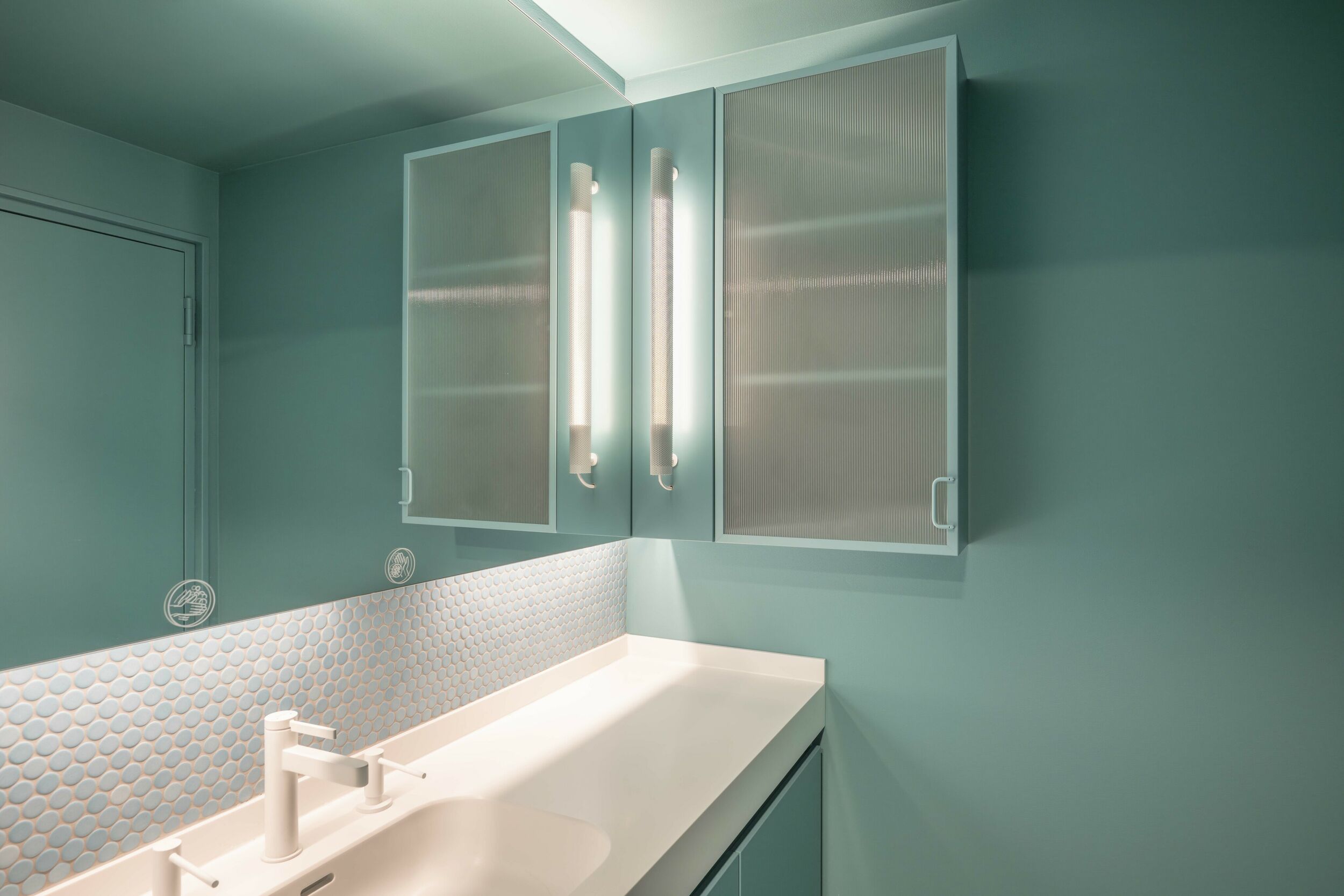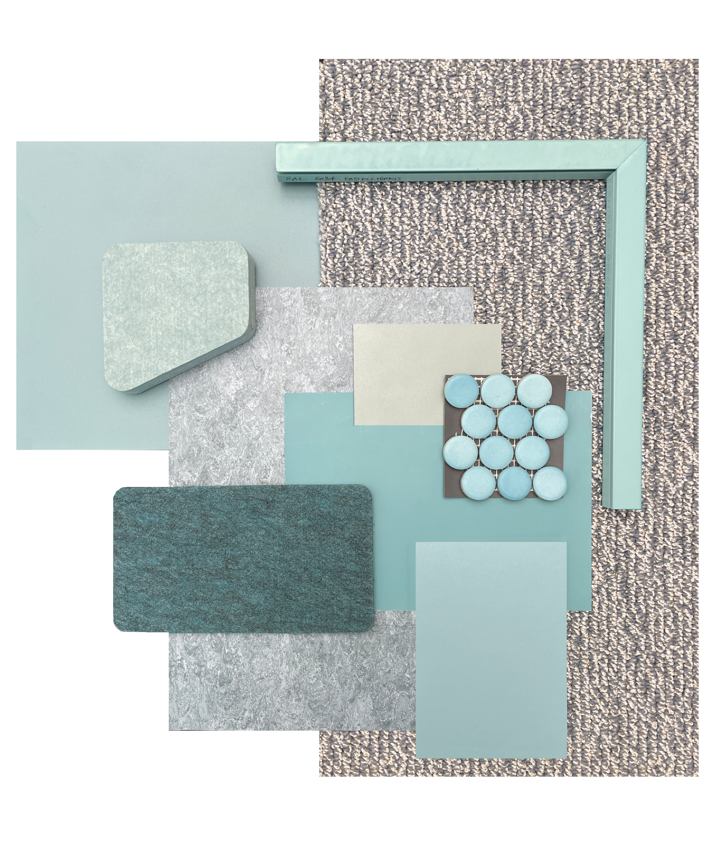 Ein weiteres Augenmerk des Konzeptes lag auf den innenliegenden Funktionskernen sowie attraktiven Begegnungsflächen („Kreativwerkstatt“), die einheitlich monochrom in den von BAID entwickelten, drei Farbwelten eingefärbt das Erscheinungsbild der drei Geschosse prägen und Orientierung bieten. Der zentrale Entwurfsgedanke dieser „Kreativwerkstatt“ findet Entsprechung in den drei Farbwelten, „Patina“ „Petrol“ und „Oxid“, die unterschiedlichen Werkstätten und Verarbeitungsformen der Industrie zuzuordnen sind. Diese Farben ziehen sich einheitlich über sämtliche Gestaltungselemente vom Sanitärbereich bis zur Teeküche über die Wände bis hin zum Türgriff und einige Produkte wurden extra für das Projekt in diesen drei Tönen hergestellt. Dabei wurde sehr umweltschonend mit recycelten Materialien gearbeitet und sogar die großflächigen Bestands-Glastrennwände ausgebaut, vor Ort gelagert und wiederverwendet.