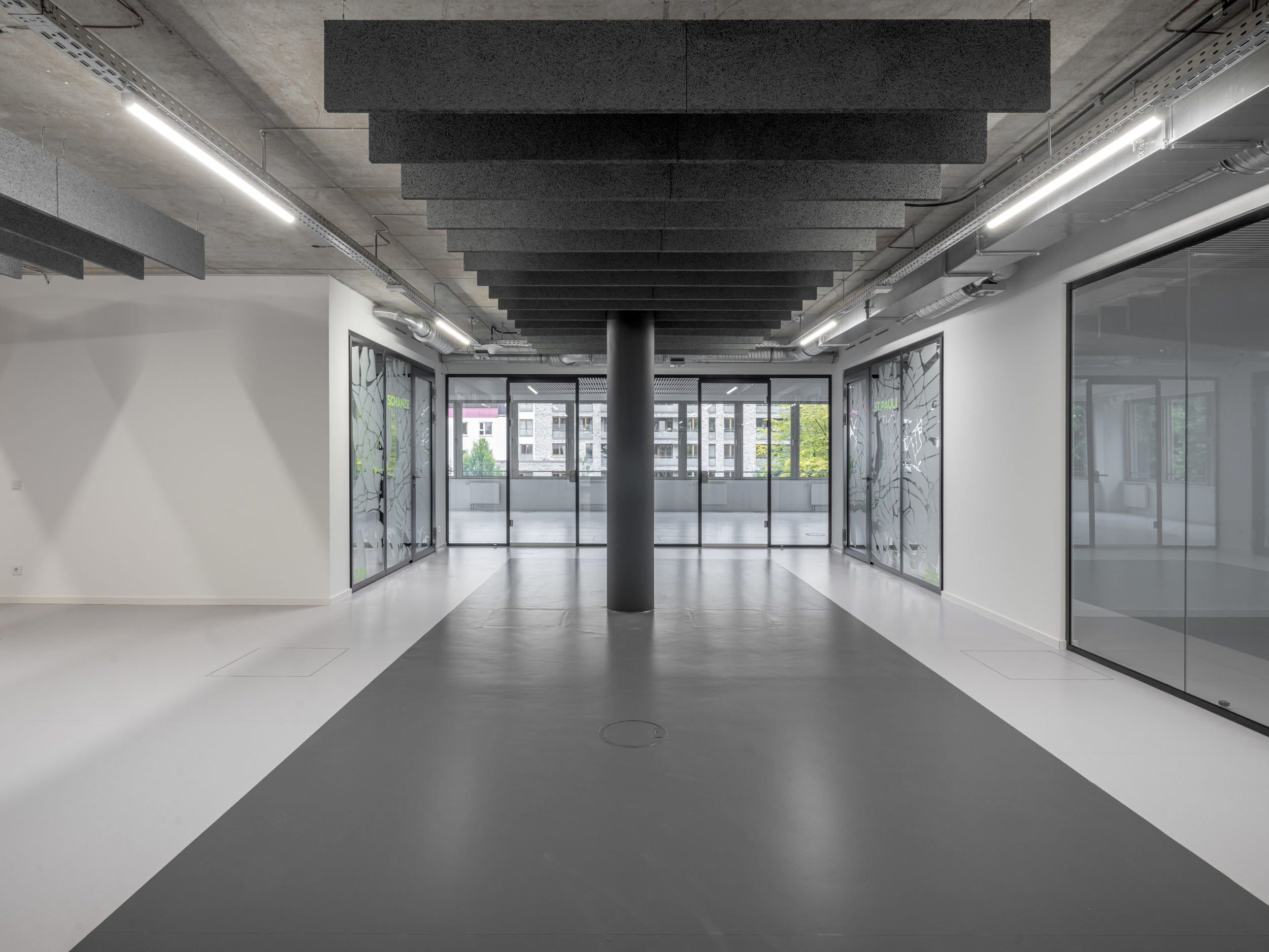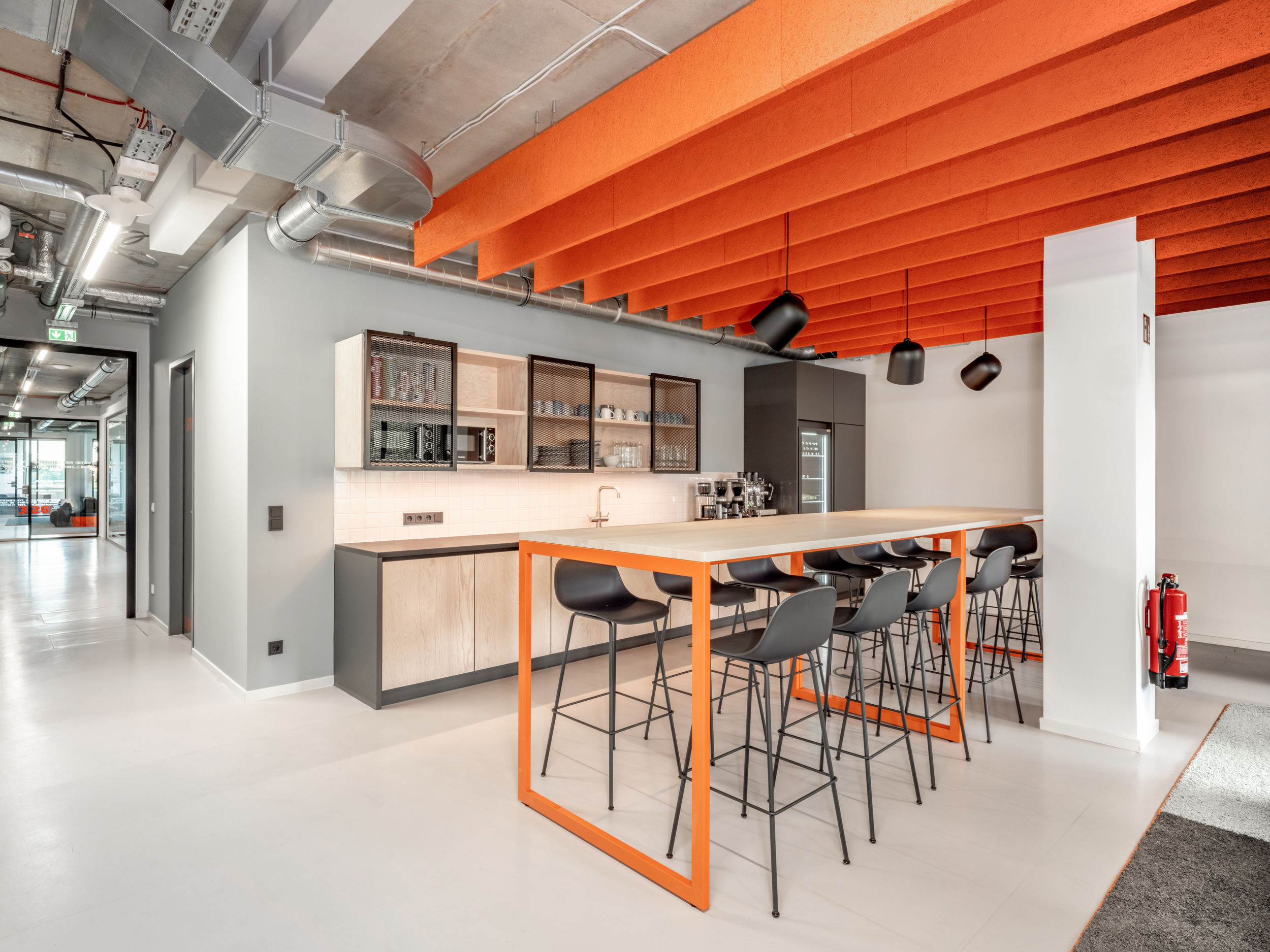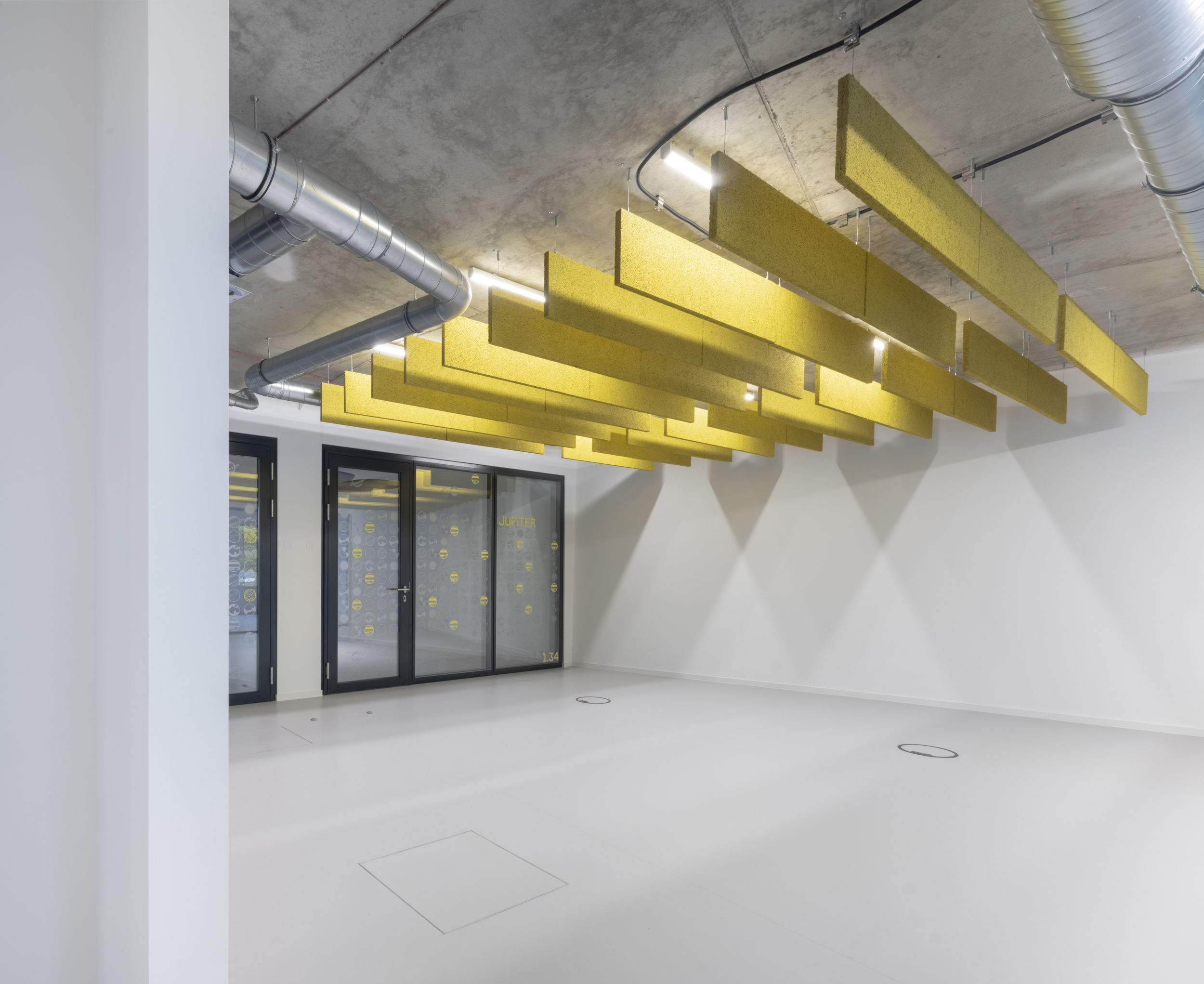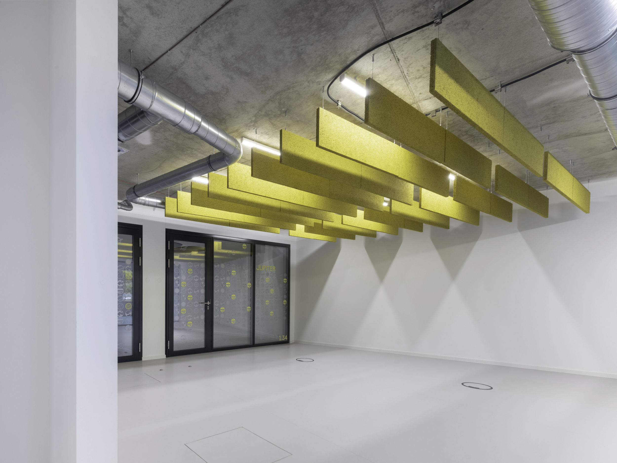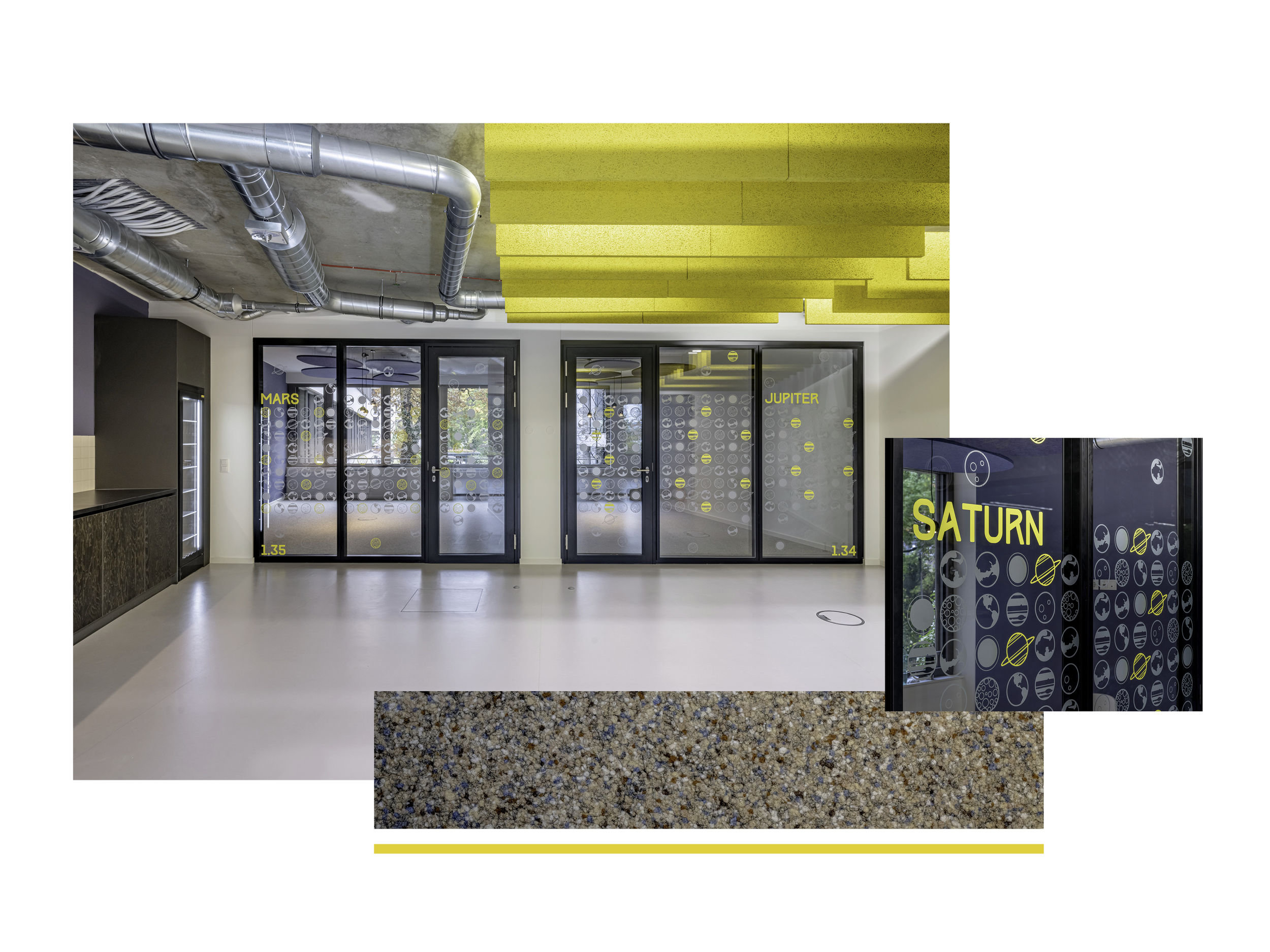 Für die auf 3 Etagen verteilten Start-ups wurden jeweils individuelle Material-, Farb- und Grafikwelten entwickelt, die mit angepassten Nutzungs- und Entspannungsangeboten werben und sich inspirierend auf die kreative Arbeit auswirken. Die neue Bürowelt hält eine ausgewogene und anspruchsvolle Mischung aus unterschiedlichsten Arbeitszonen und diversen Rückzugsbereichen bereit. Das Raumangebot wird um zahlreiche Konferenz- und Projekträumen ergänzt. Für größere Zusammenkünfte und besondere Anlässe steht eine „Aula“ mit einer raumfüllenden Tribüne zur Verfügung. Das Ambiente ist insgesamt nicht überladen, sondern orientiert sich an den objektiven Erfordernissen ergänzt um coole Gestaltungsdetails. Auch technisch wurde das Projekt auf dem neuesten Stand entwickelt, um den spezifischen Anforderungen des Geschäftsfeldes und denen an die Flexibilität der Arbeitsplätze gerecht zu werden.