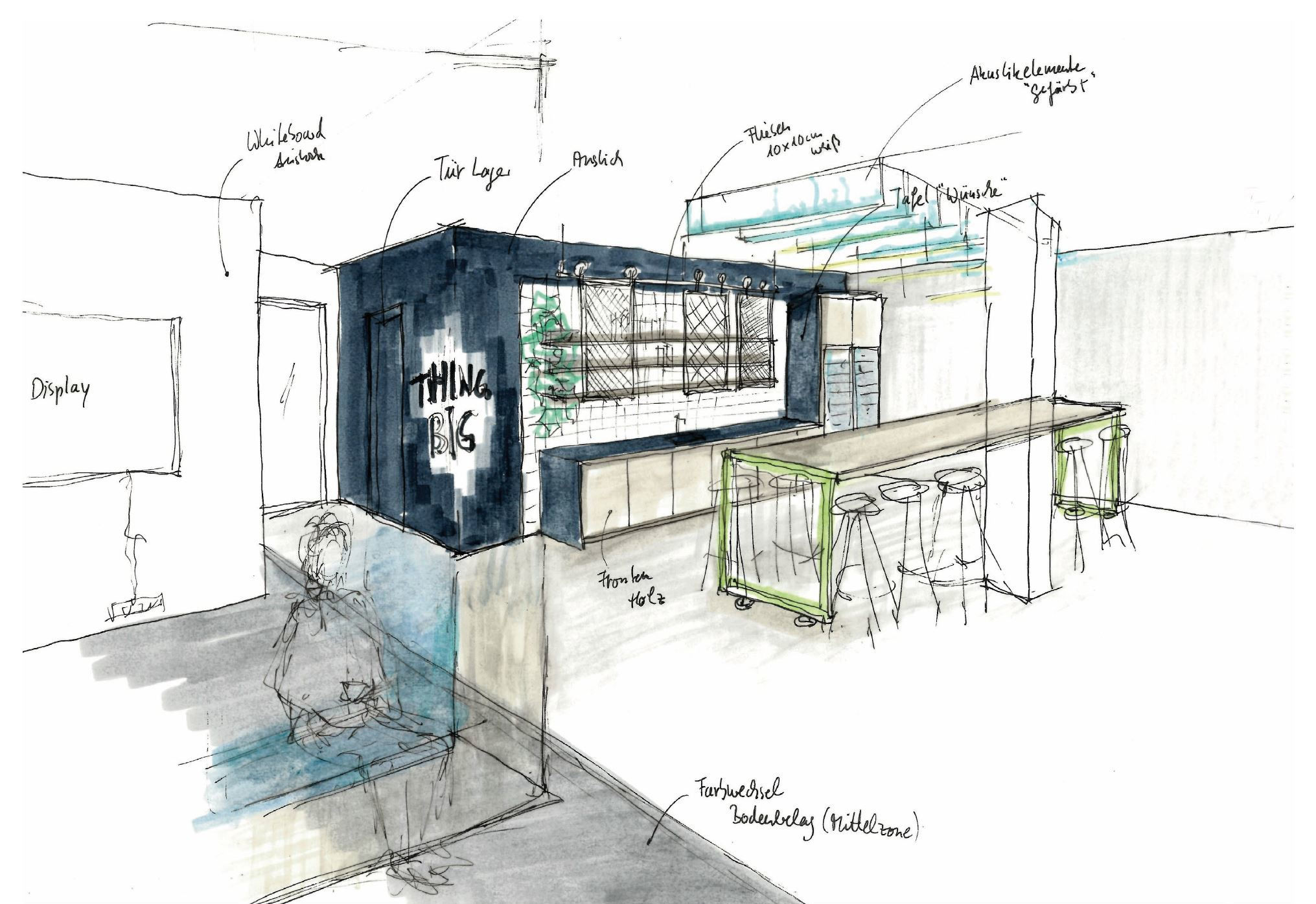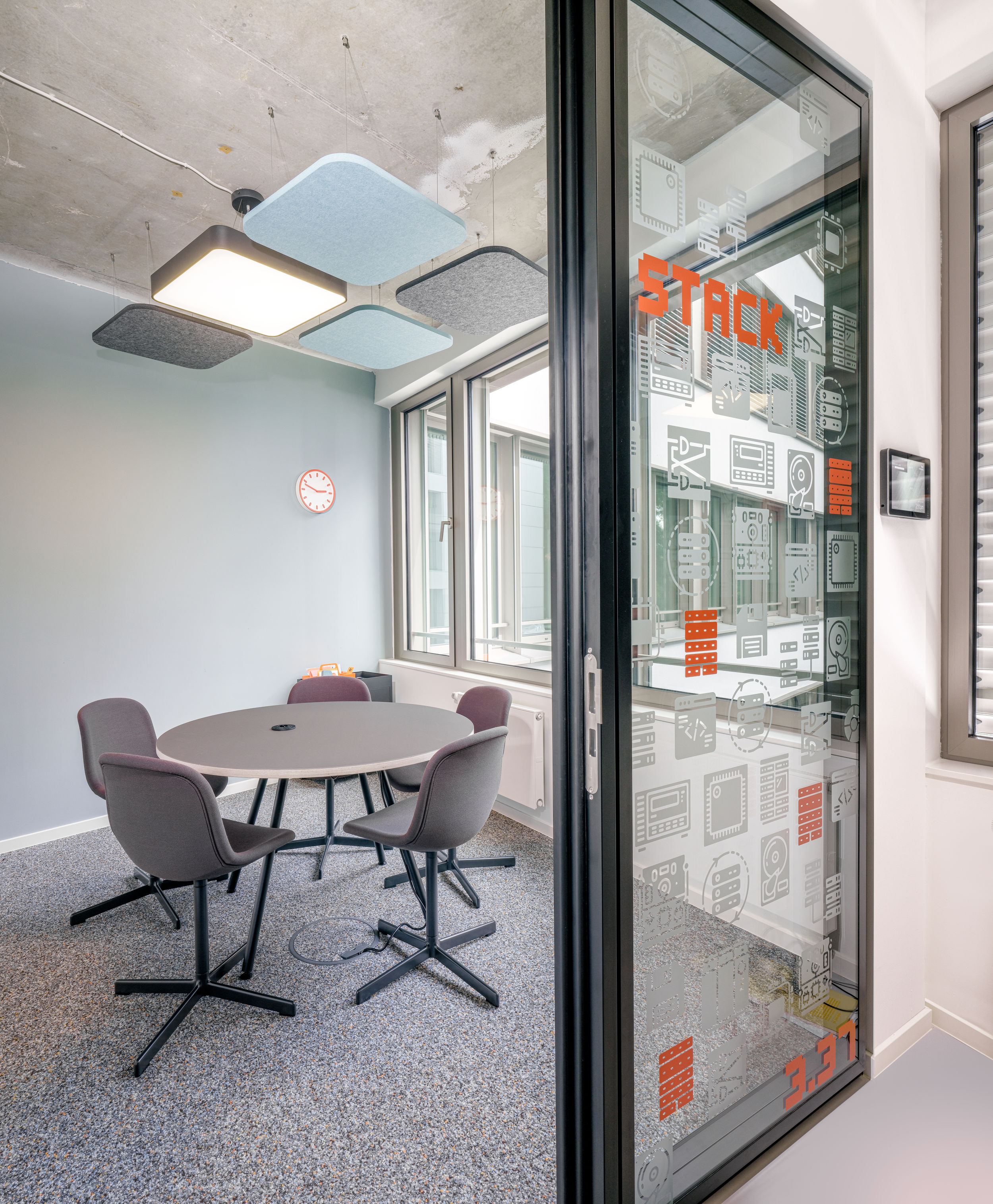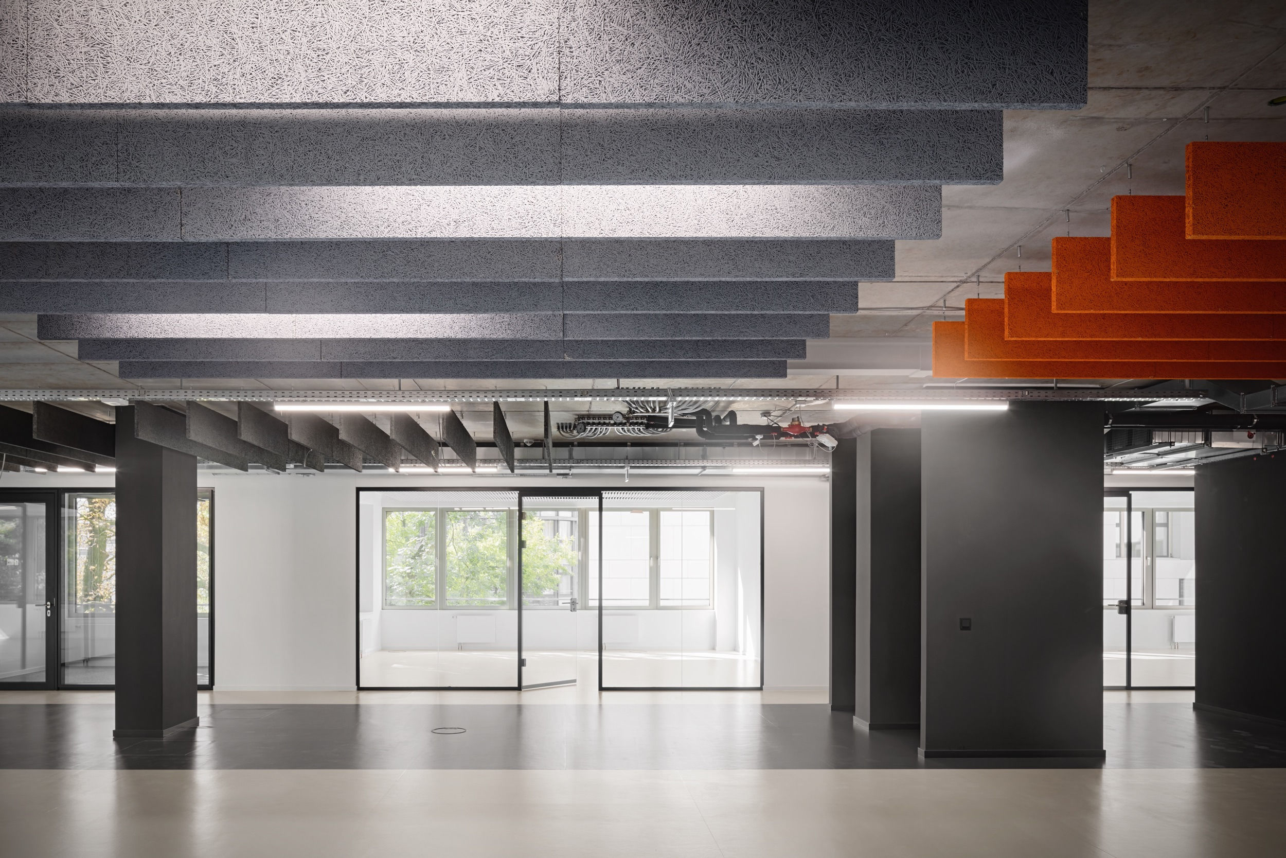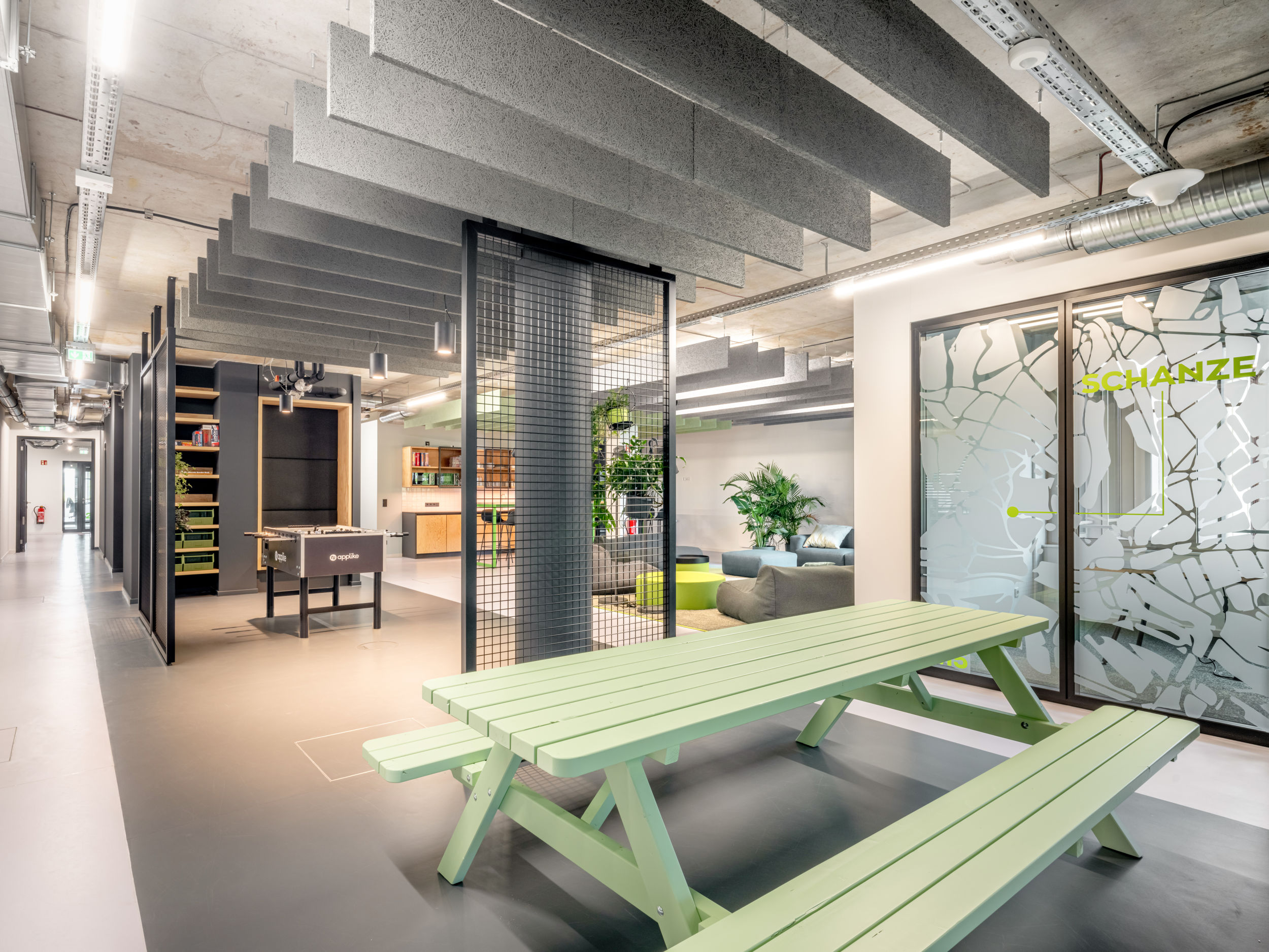 Für die auf 3 Etagen verteilten Start-ups wurden jeweils individuelle Material-, Farb- und Grafikwelten entwickelt, die mit angepassten Nutzungs- und Entspannungsangeboten werben und sich inspirierend auf die kreative Arbeit auswirken. Die neue Bürowelt hält eine ausgewogene und anspruchsvolle Mischung aus unterschiedlichsten Arbeitszonen und diversen Rückzugsbereichen bereit. Das Raumangebot wird um zahlreiche Konferenz- und Projekträumen ergänzt. Für größere Zusammenkünfte und besondere Anlässe steht eine „Aula“ mit einer raumfüllenden Tribüne zur Verfügung. Das Ambiente ist insgesamt nicht überladen, sondern orientiert sich an den objektiven Erfordernissen ergänzt um coole Gestaltungsdetails. Auch technisch wurde das Projekt auf dem neuesten Stand entwickelt, um den spezifischen Anforderungen des Geschäftsfeldes und denen an die Flexibilität der Arbeitsplätze gerecht zu werden.