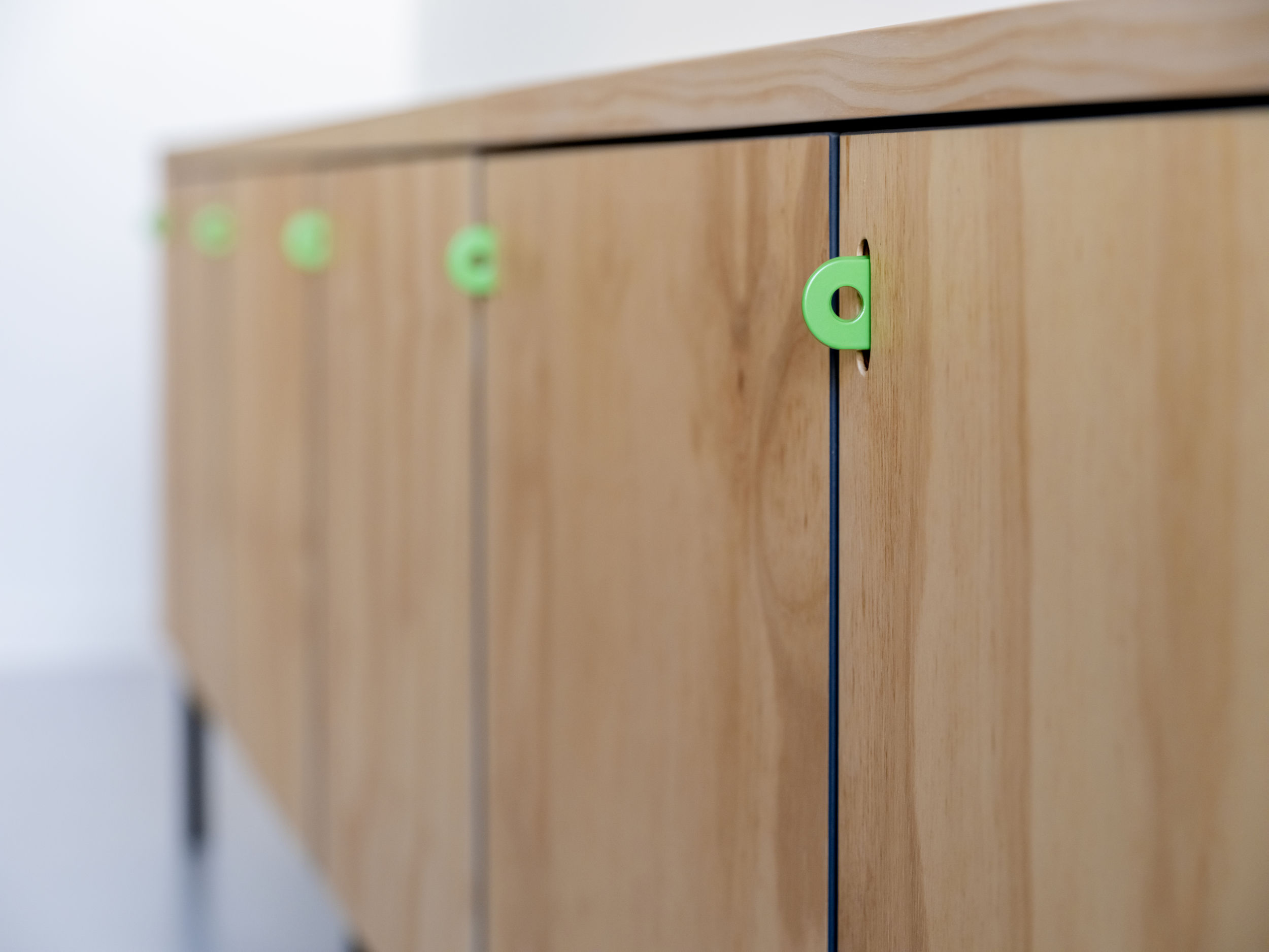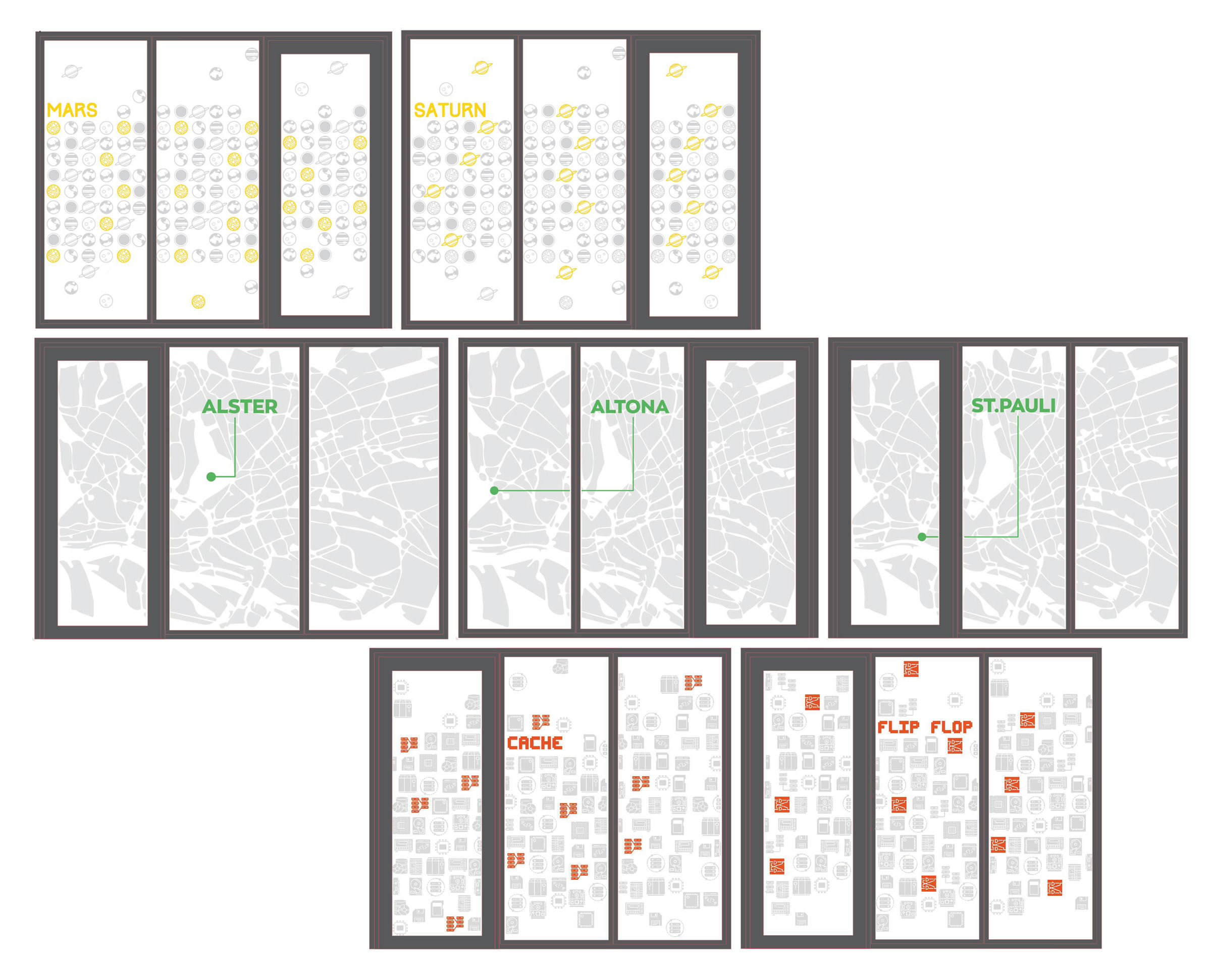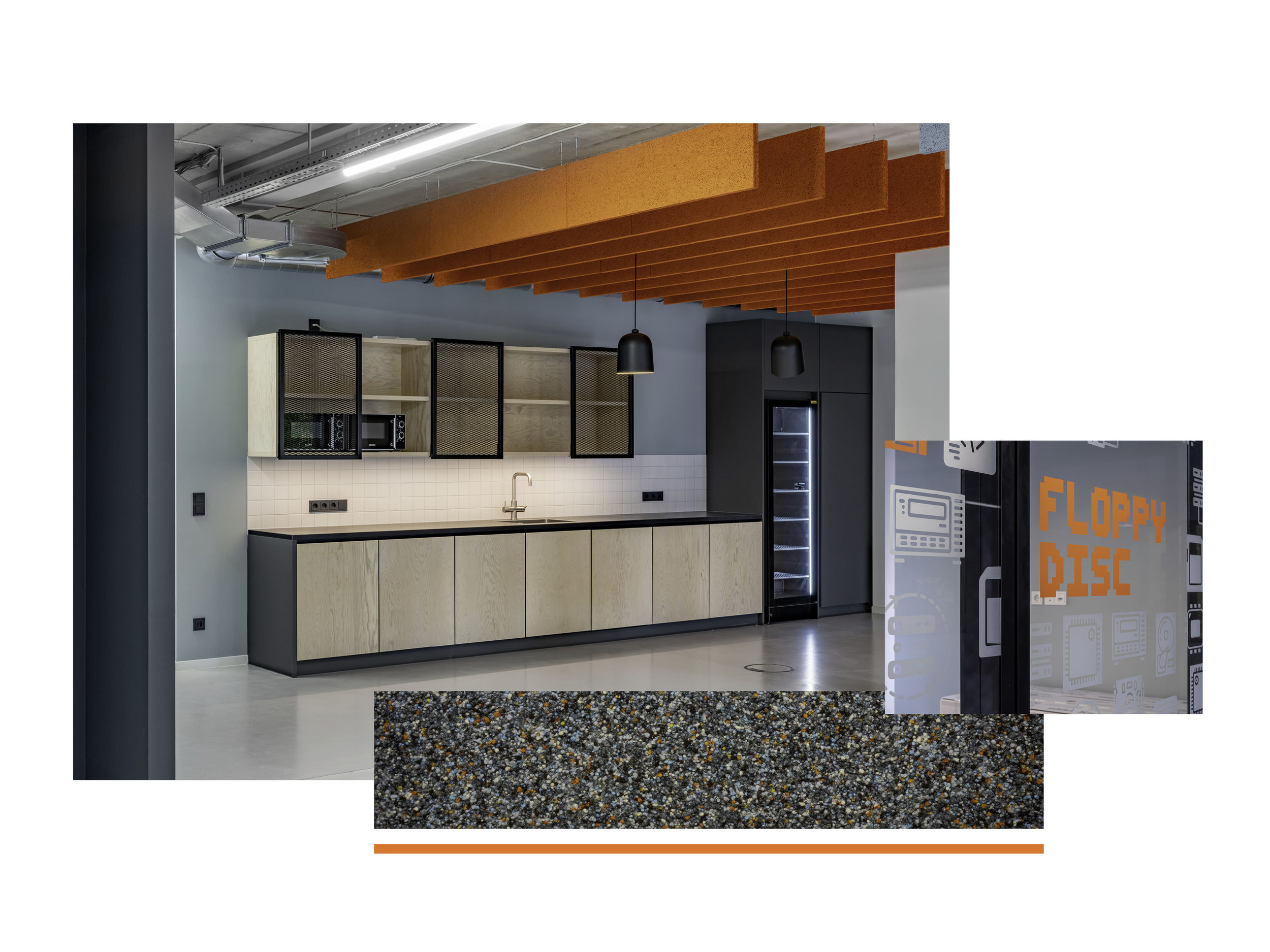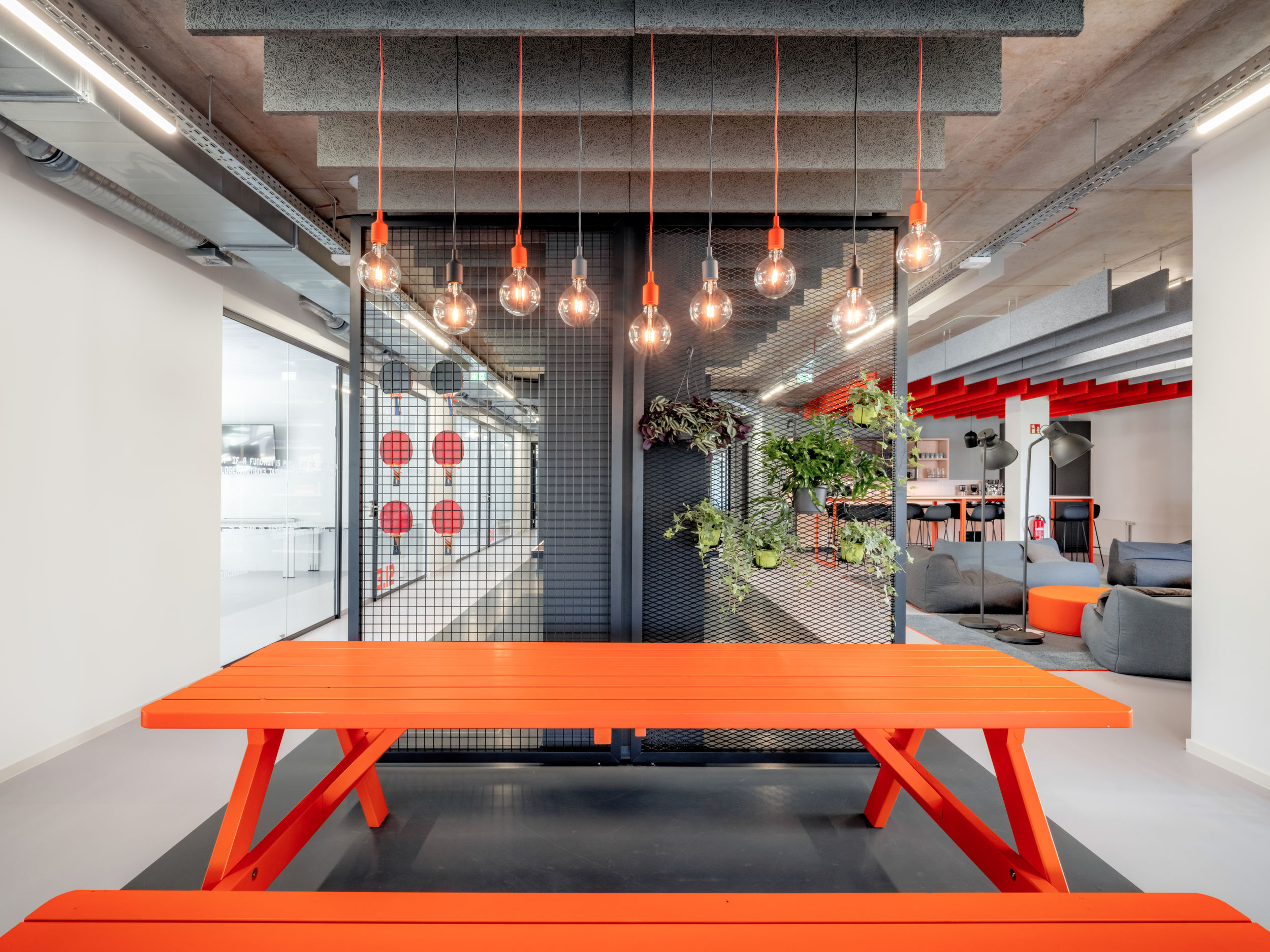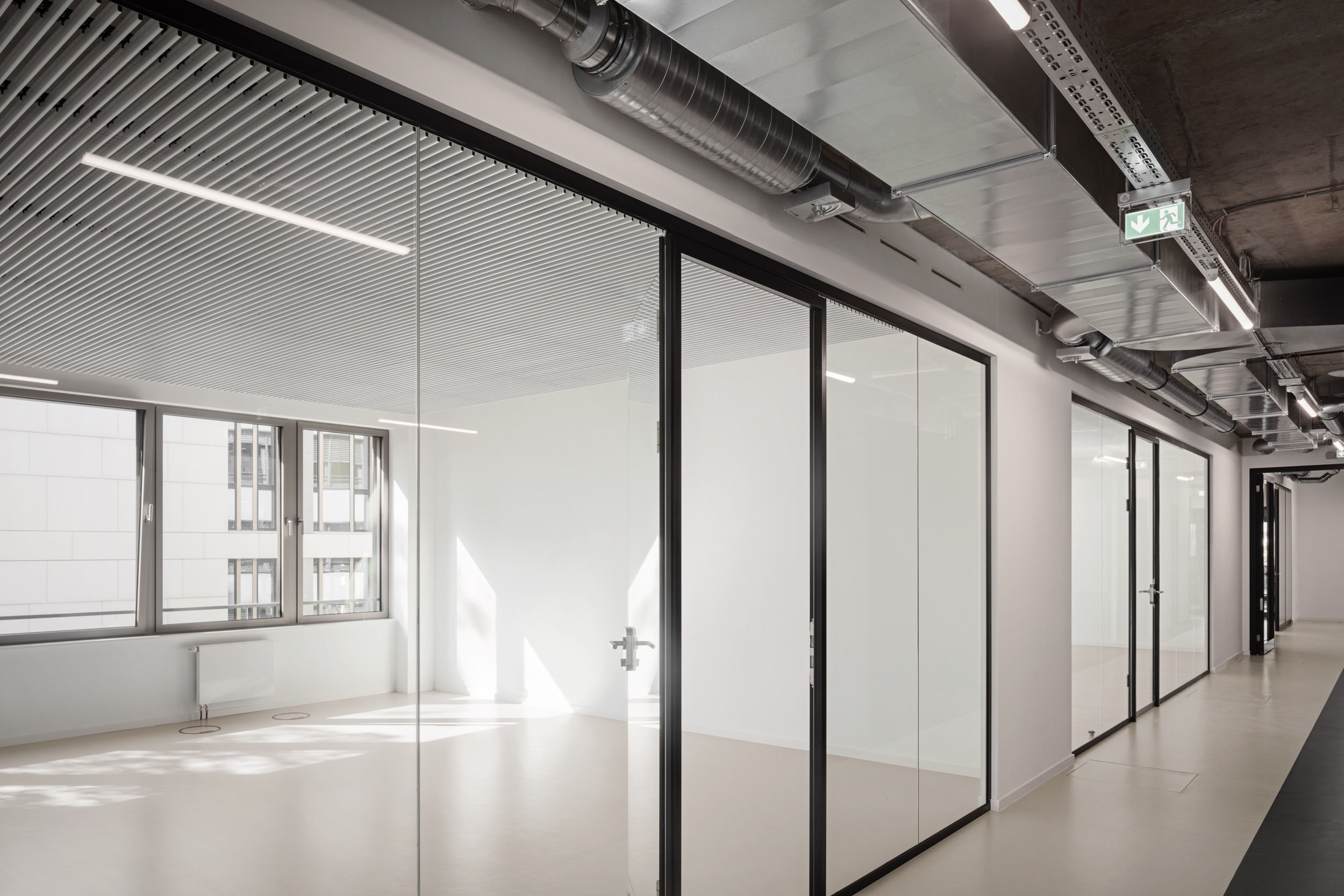 Für die auf 3 Etagen verteilten Start-ups wurden jeweils individuelle Material-, Farb- und Grafikwelten entwickelt, die mit angepassten Nutzungs- und Entspannungsangeboten werben und sich inspirierend auf die kreative Arbeit auswirken. Die neue Bürowelt hält eine ausgewogene und anspruchsvolle Mischung aus unterschiedlichsten Arbeitszonen und diversen Rückzugsbereichen bereit. Das Raumangebot wird um zahlreiche Konferenz- und Projekträumen ergänzt. Für größere Zusammenkünfte und besondere Anlässe steht eine „Aula“ mit einer raumfüllenden Tribüne zur Verfügung. Das Ambiente ist insgesamt nicht überladen, sondern orientiert sich an den objektiven Erfordernissen ergänzt um coole Gestaltungsdetails. Auch technisch wurde das Projekt auf dem neuesten Stand entwickelt, um den spezifischen Anforderungen des Geschäftsfeldes und denen an die Flexibilität der Arbeitsplätze gerecht zu werden.
