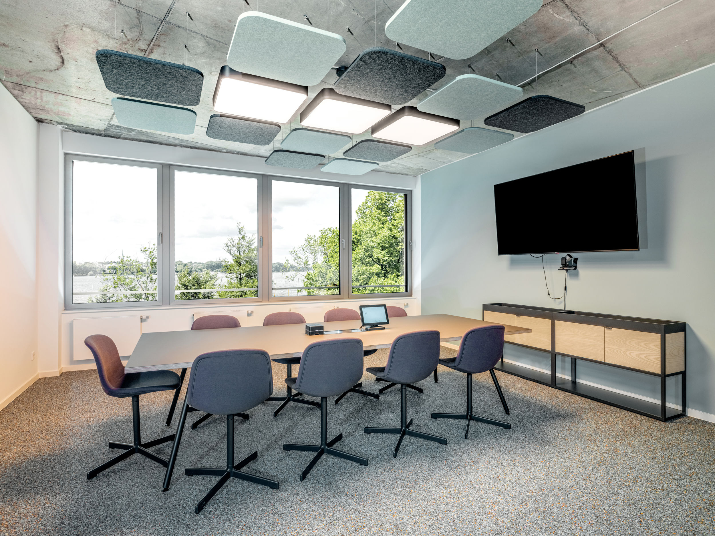 Die dezidiert offene, funktionale und flexible Raumgestaltung legt den Fokus auf die spezifischen Bedürfnisse der Mitarbeiter ebenso, wie auf die Abbildung der notwendigen Kooperationsstrukturen. Kommunikation und Diskurs finden ihre architektonische Entsprechung in einer Art „Garagenstruktur“ mit großen, dunkel gefassten Glasflächen und den beeindruckenden Blickachsen nach innen, wie nach außen auf die Weite der Alster.
