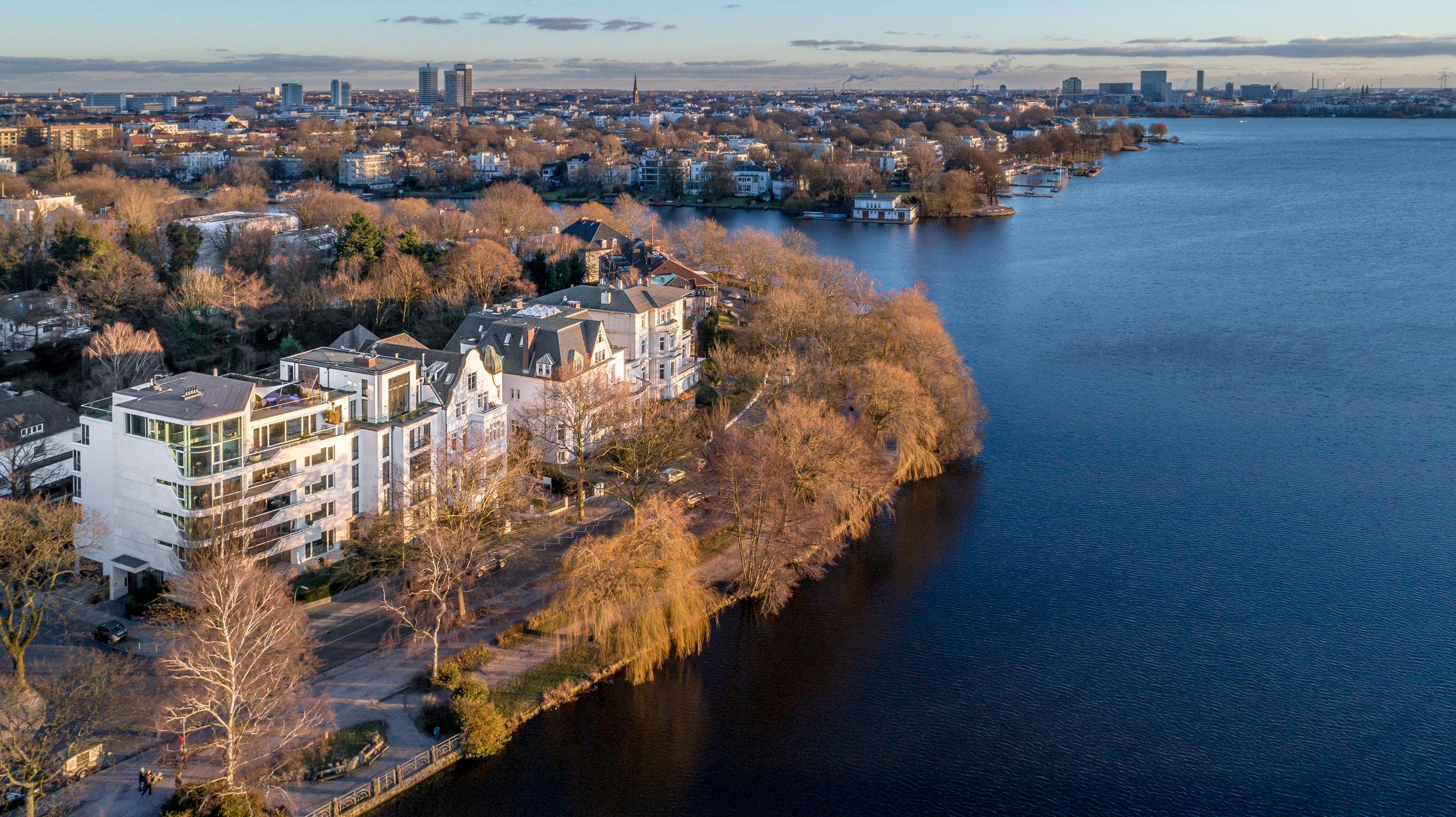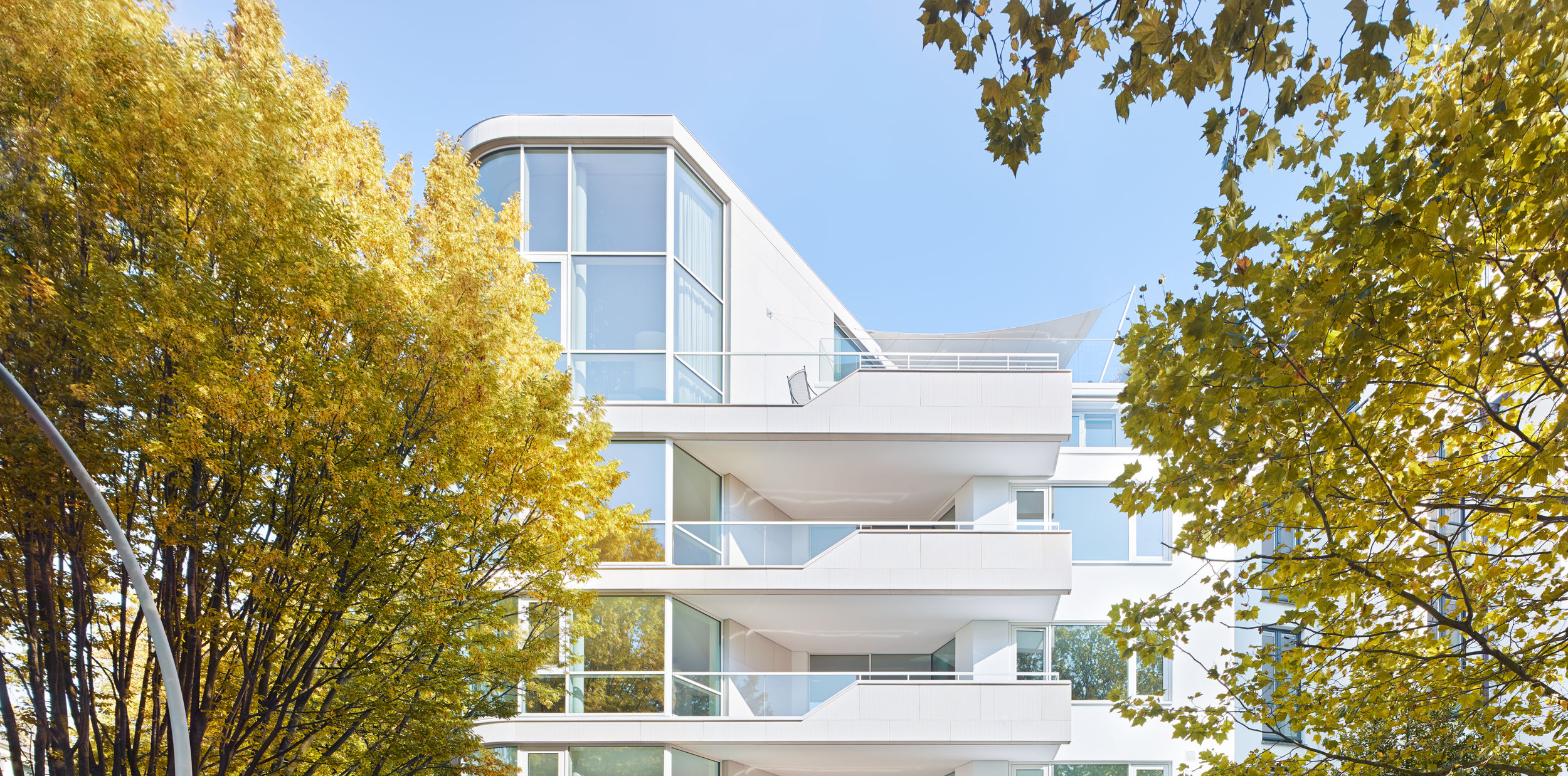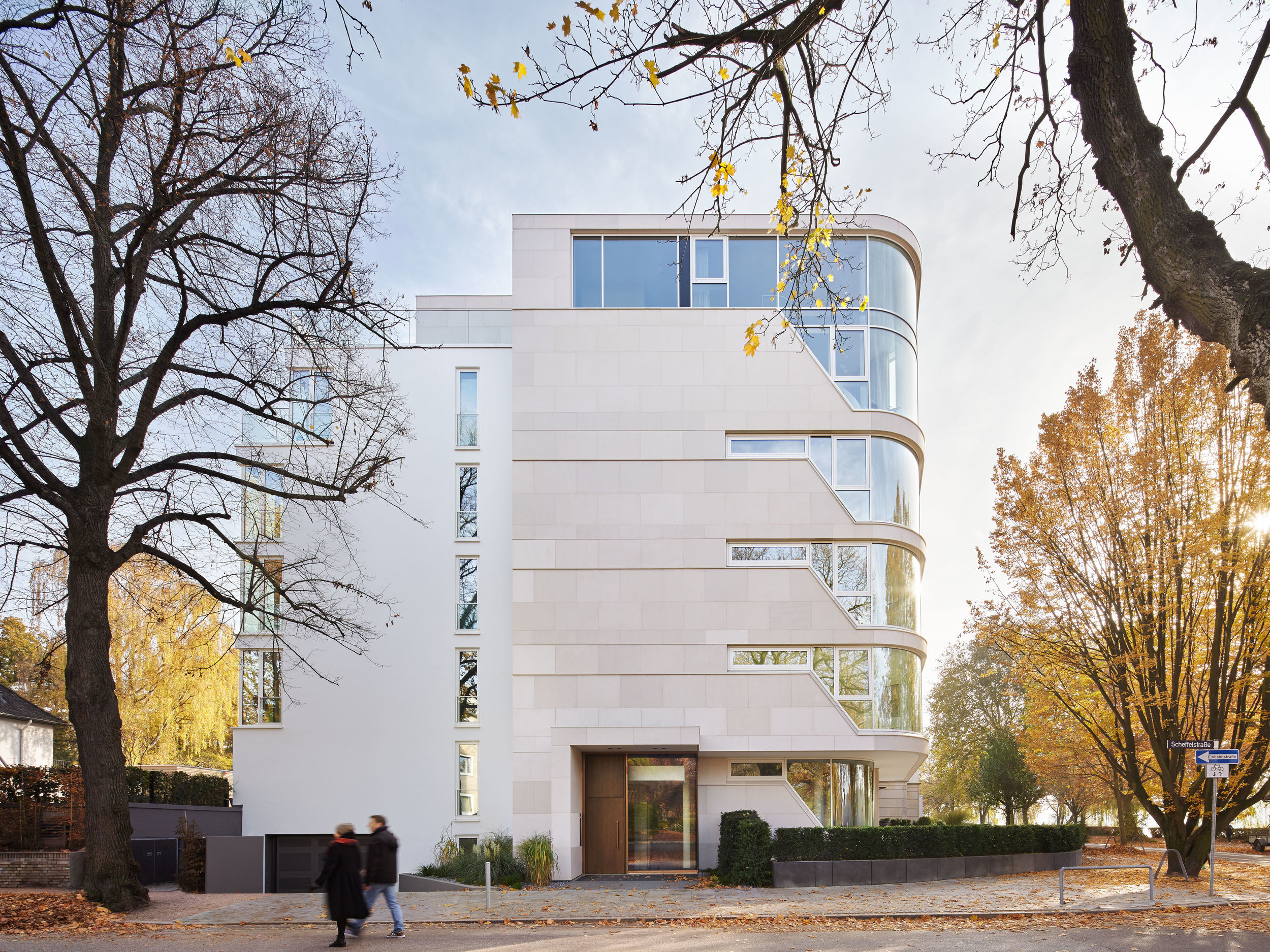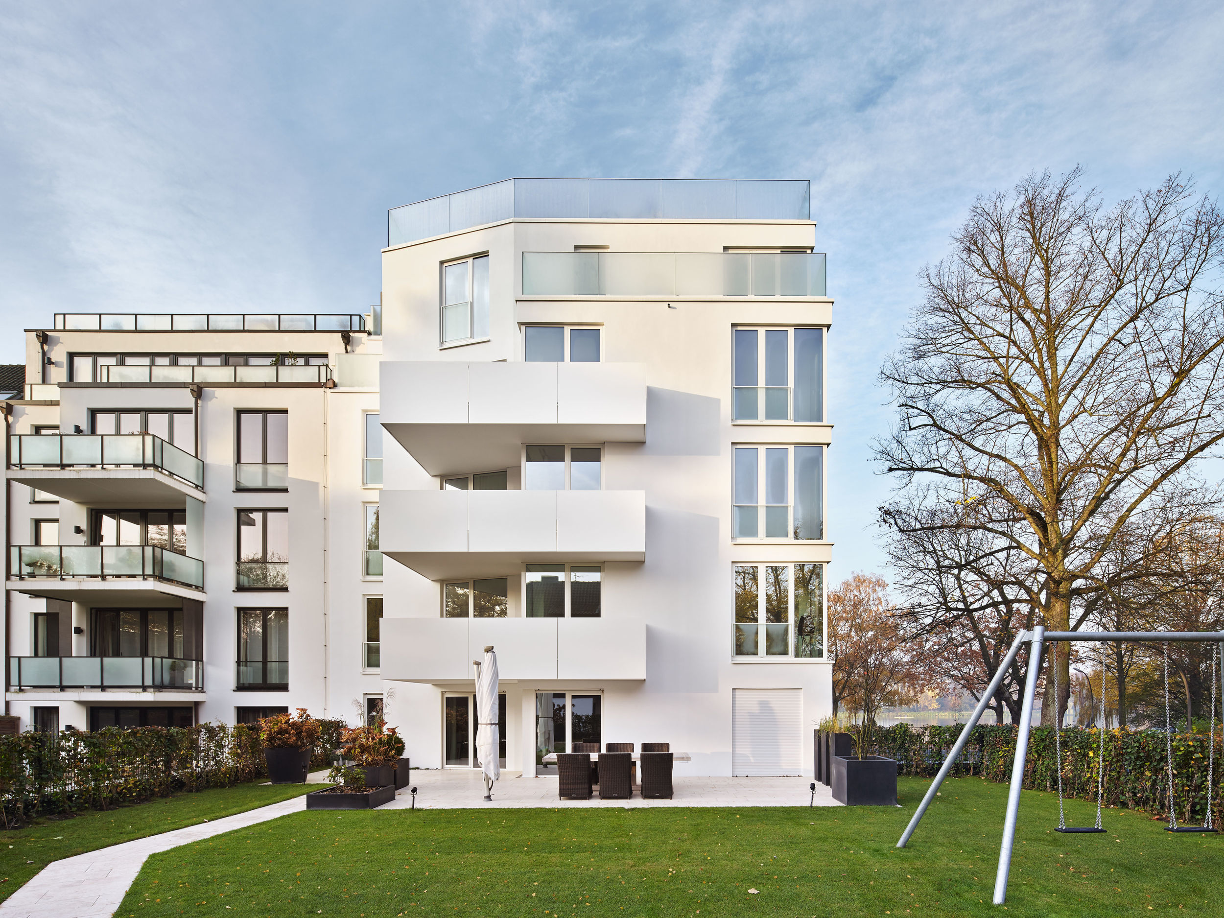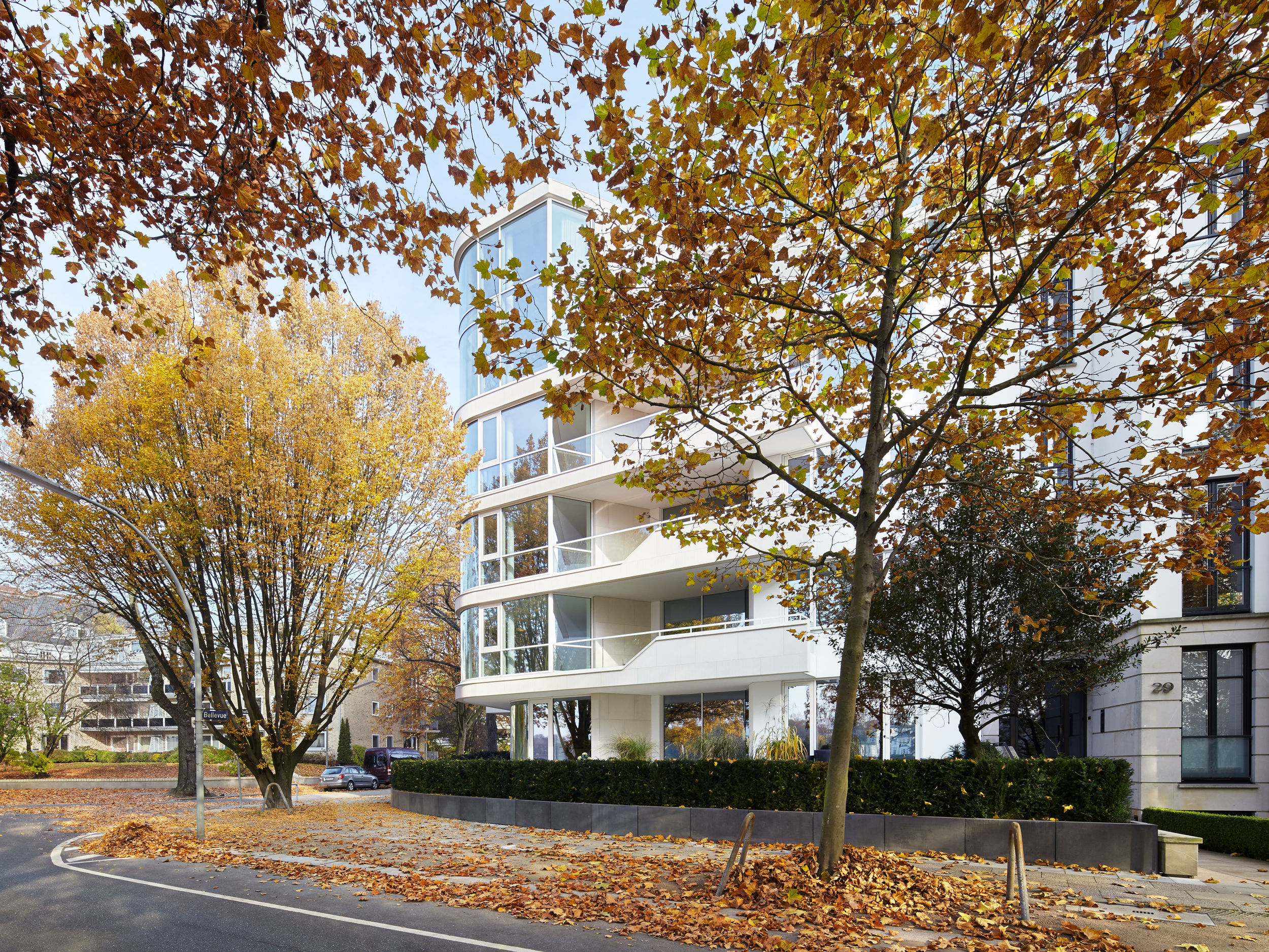 Auf dem Eckgrundstück in direkter Außenalsterlage, entstand ein Neubau mit fünf großzügigen, luxuriösen Eigentumswohnungen. Sowohl die repräsentative Frontfassade als auch die Gartenseite nehmen die vorhandenen Baufluchten und Traufhöhen auf, so dass sich das Gebäude harmonisch in das heterogene Bestandsgefüge eingliedert. Die Ecke wird bewusst durch eine Überhöhung und ihre imposante Öffnung aufgewertet. Das runde Panoramafenster ermöglicht einen malerischen Rundumblick aus den Wohnbereichen auf das Alsterpanorama und die Stadtsilhouette. Das Galeriegeschoss wird durch diese Betonung auch von der gegenüberliegenden Alsterseite zum einzigartigen Blickfang.