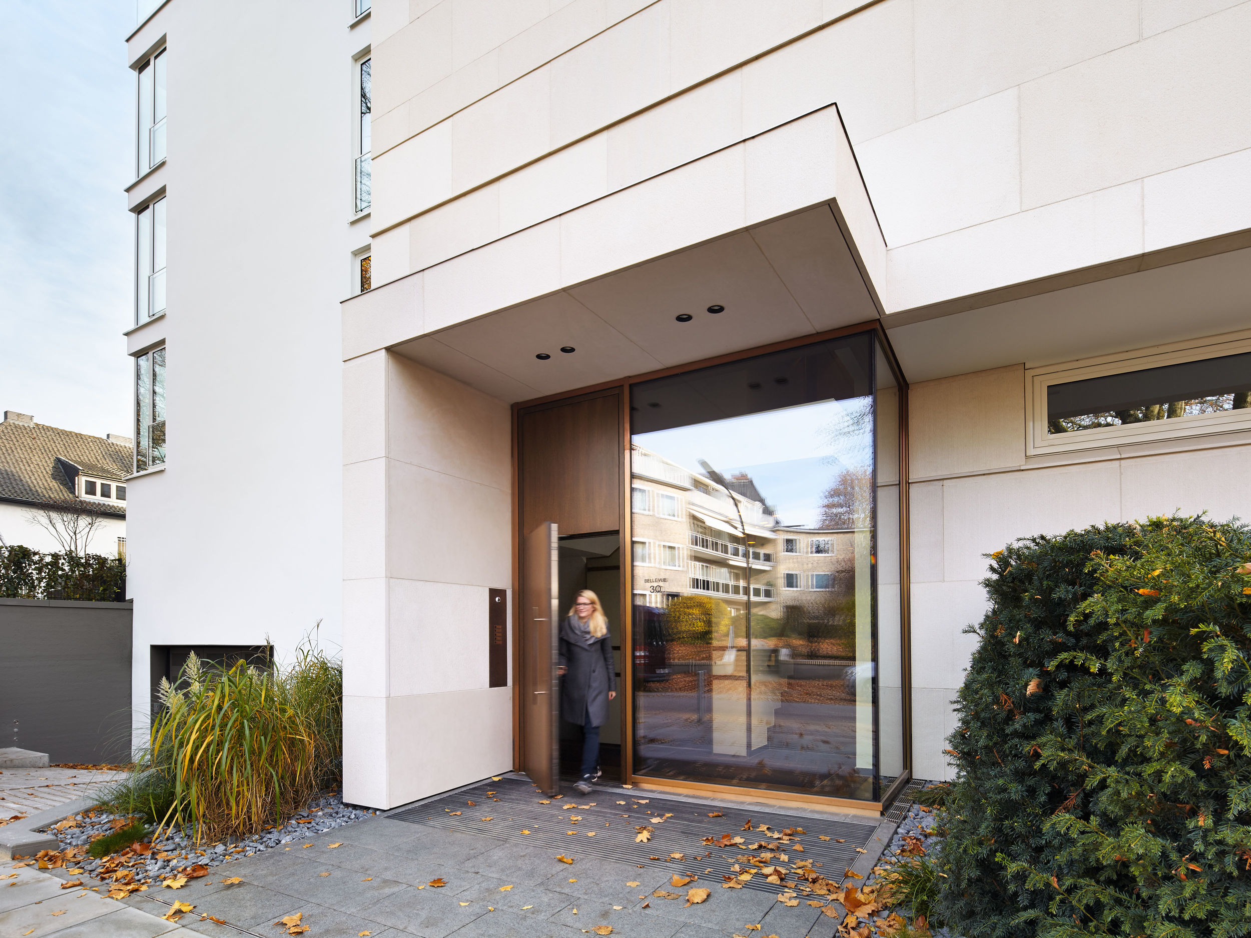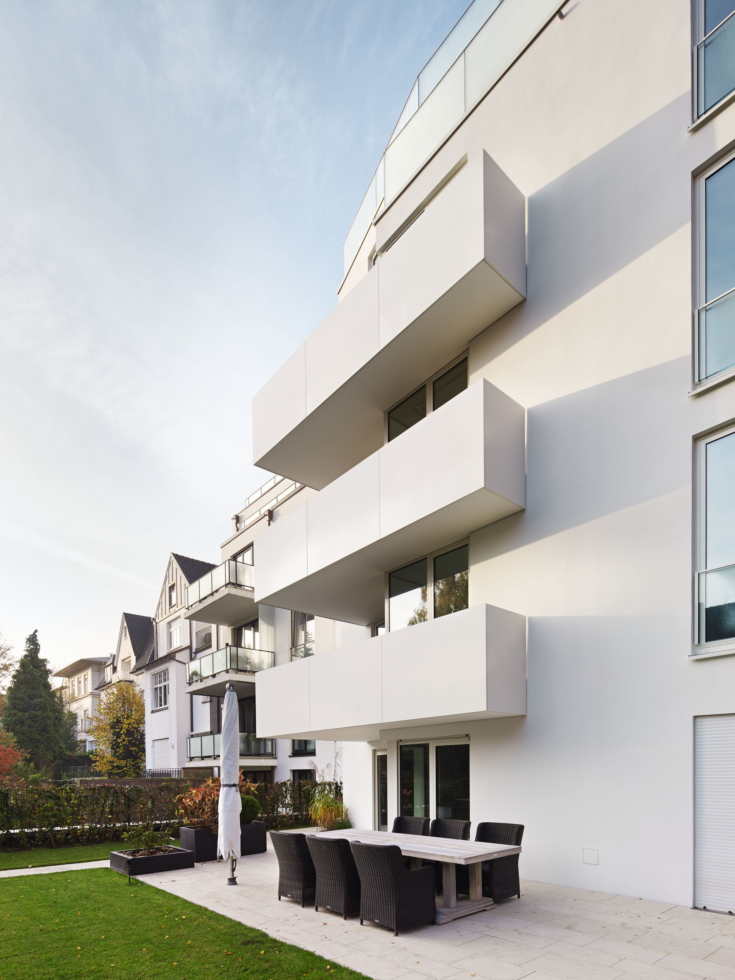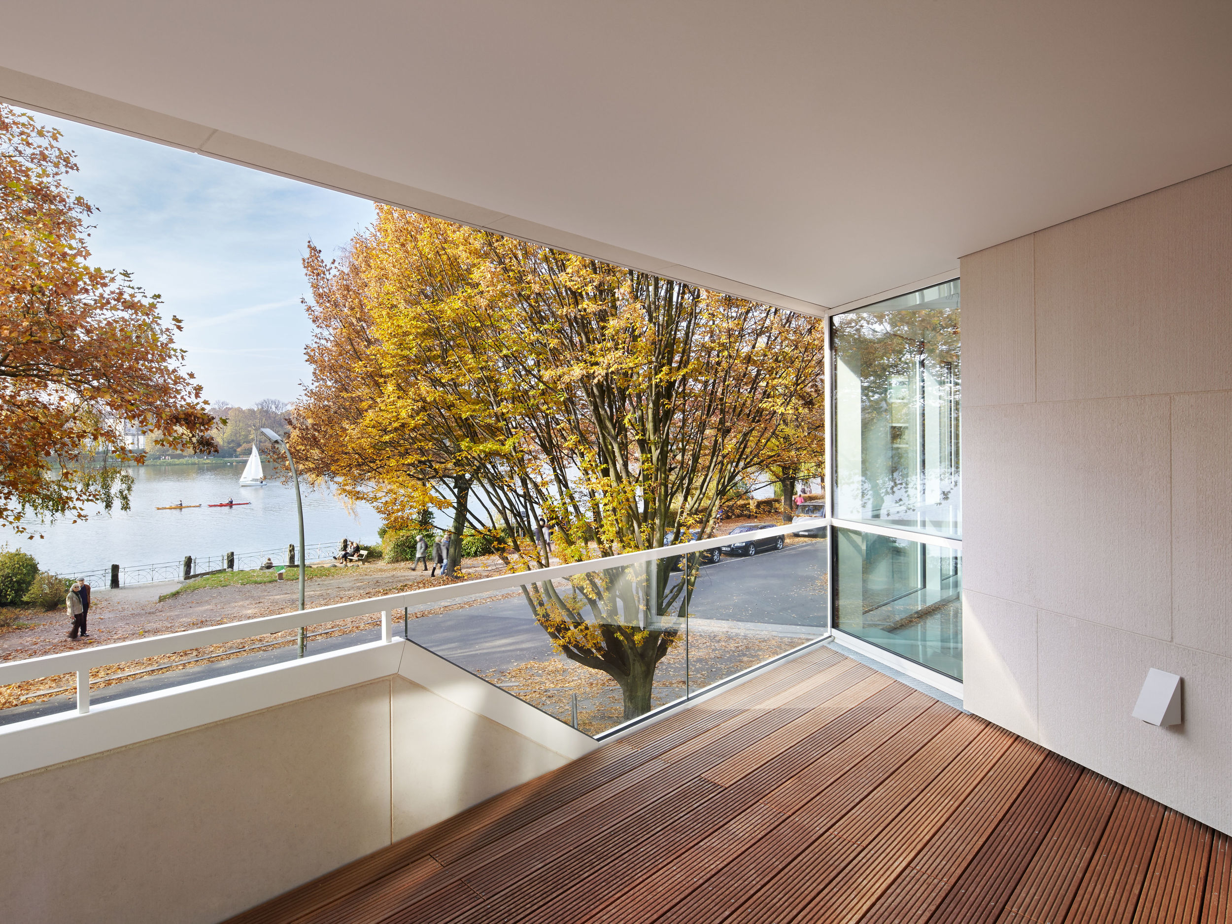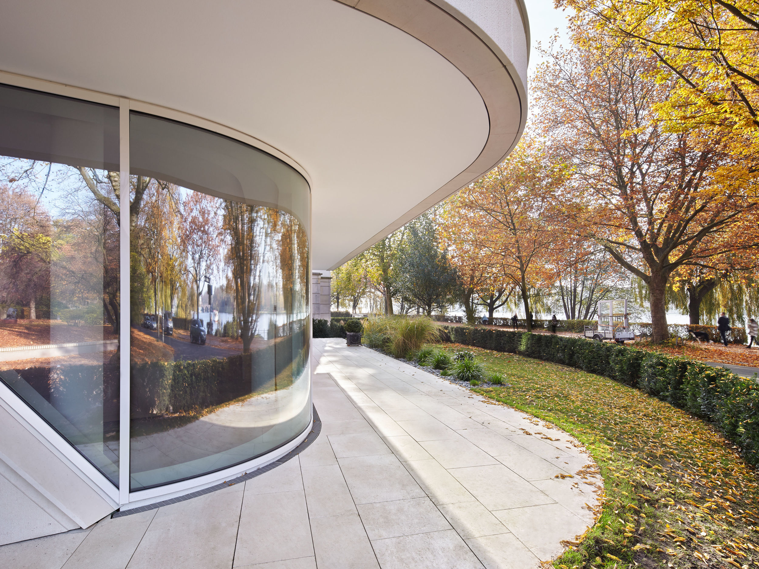 Auf dem Eckgrundstück in direkter Außenalsterlage, entstand ein Neubau mit fünf großzügigen, luxuriösen Eigentumswohnungen. Sowohl die repräsentative Frontfassade als auch die Gartenseite nehmen die vorhandenen Baufluchten und Traufhöhen auf, so dass sich das Gebäude harmonisch in das heterogene Bestandsgefüge eingliedert. Die Ecke wird bewusst durch eine Überhöhung und ihre imposante Öffnung aufgewertet. Das runde Panoramafenster ermöglicht einen malerischen Rundumblick aus den Wohnbereichen auf das Alsterpanorama und die Stadtsilhouette. Das Galeriegeschoss wird durch diese Betonung auch von der gegenüberliegenden Alsterseite zum einzigartigen Blickfang.