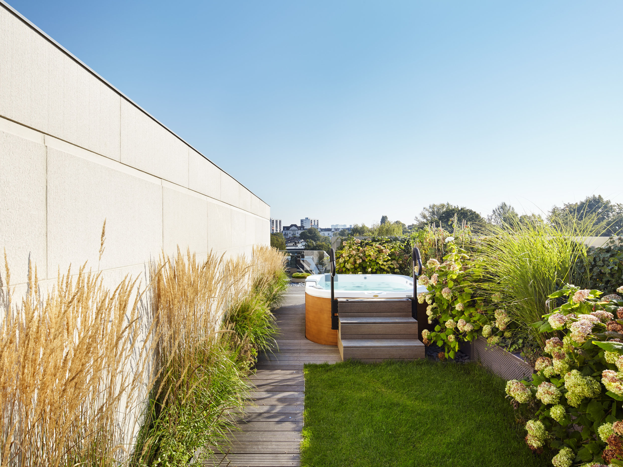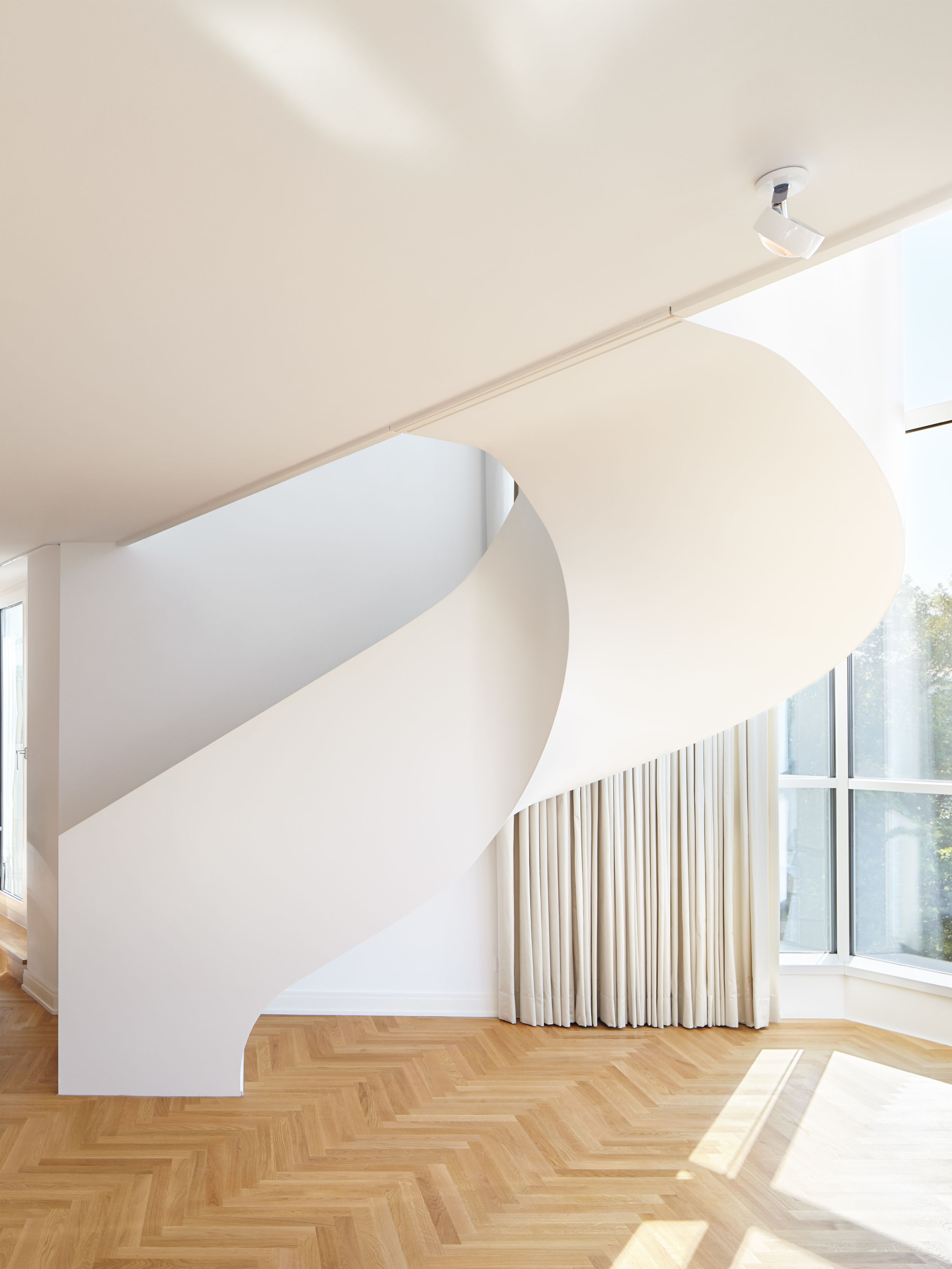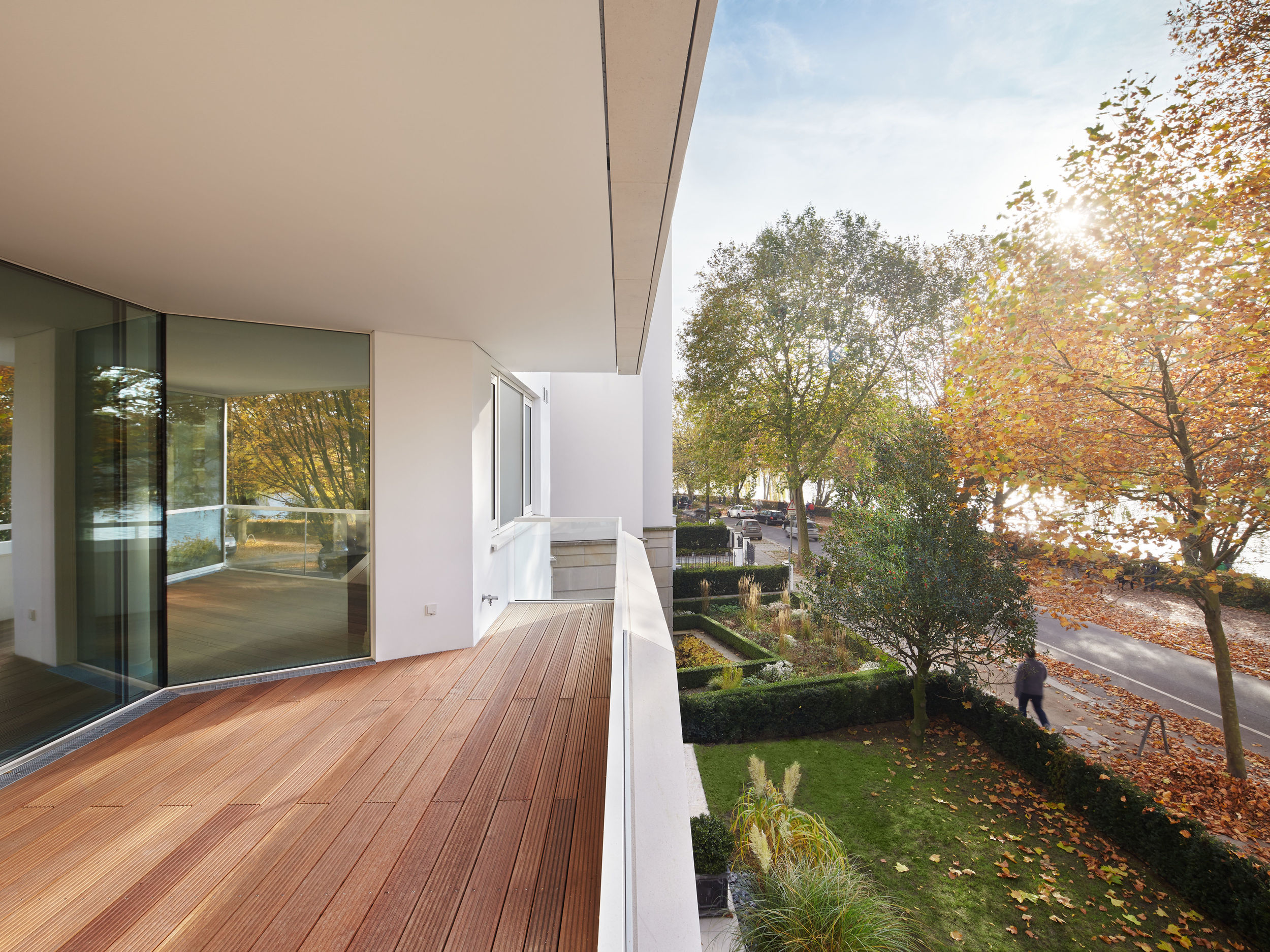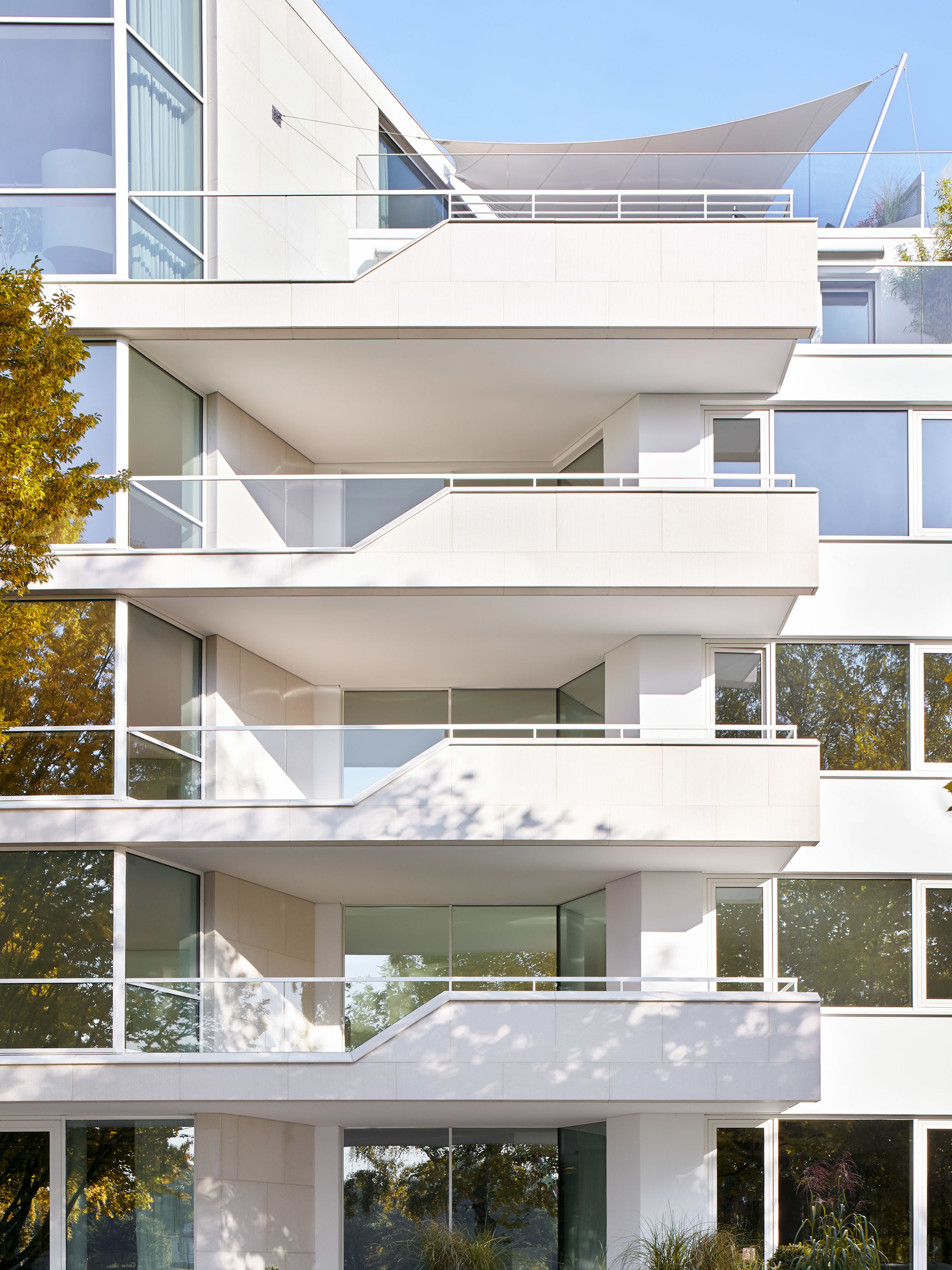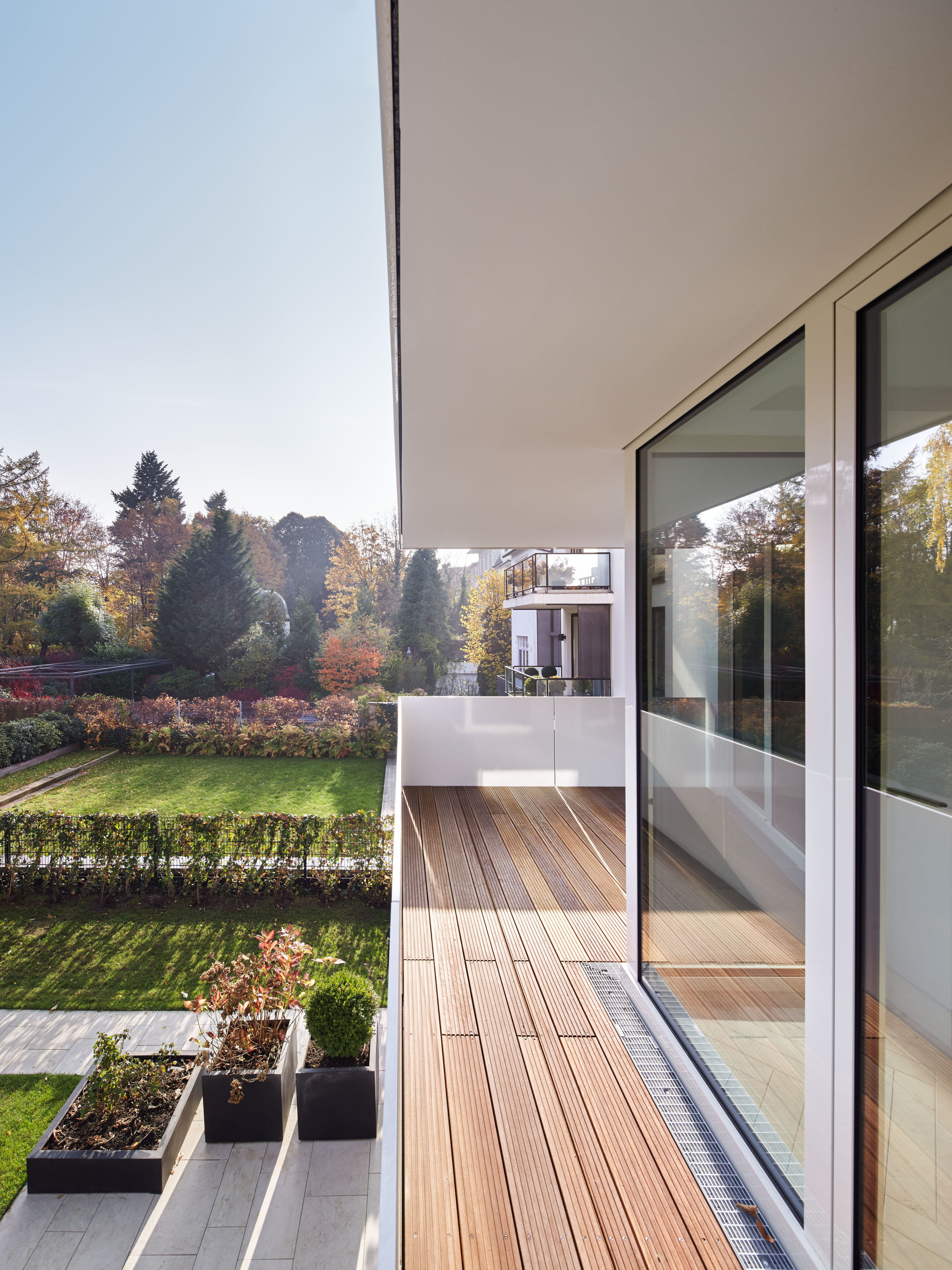 Auf dem Eckgrundstück in direkter Außenalsterlage, entstand ein Neubau mit fünf großzügigen, luxuriösen Eigentumswohnungen. Sowohl die repräsentative Frontfassade als auch die Gartenseite nehmen die vorhandenen Baufluchten und Traufhöhen auf, so dass sich das Gebäude harmonisch in das heterogene Bestandsgefüge eingliedert. Die Ecke wird bewusst durch eine Überhöhung und ihre imposante Öffnung aufgewertet. Das runde Panoramafenster ermöglicht einen malerischen Rundumblick aus den Wohnbereichen auf das Alsterpanorama und die Stadtsilhouette. Das Galeriegeschoss wird durch diese Betonung auch von der gegenüberliegenden Alsterseite zum einzigartigen Blickfang.