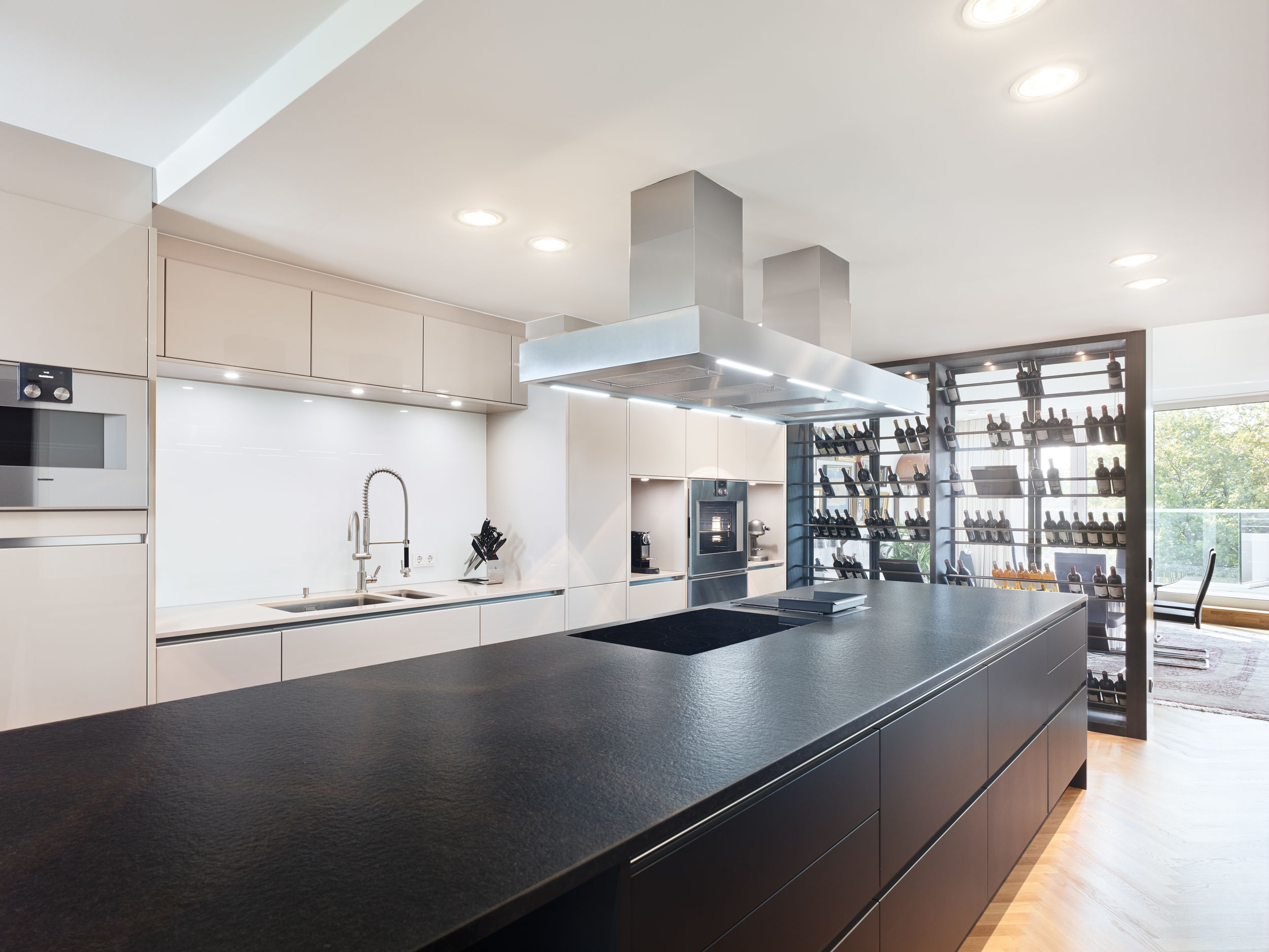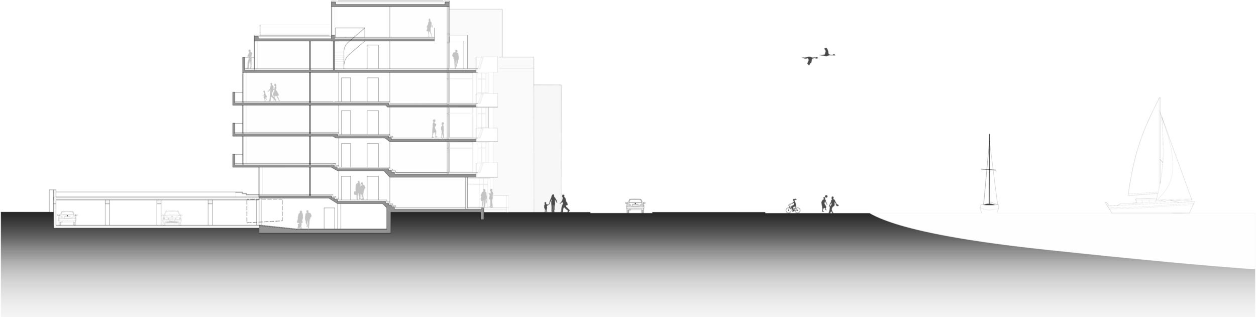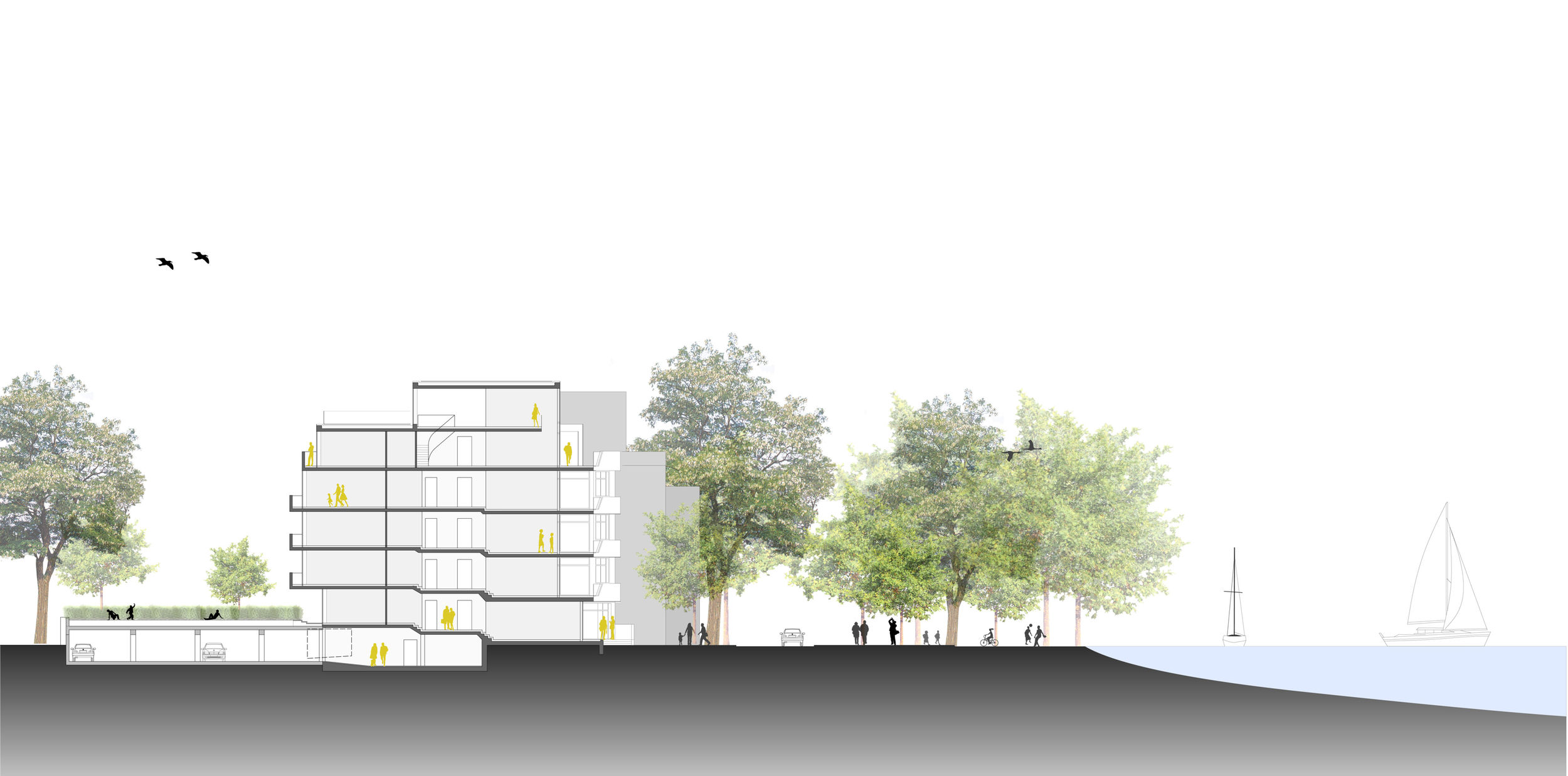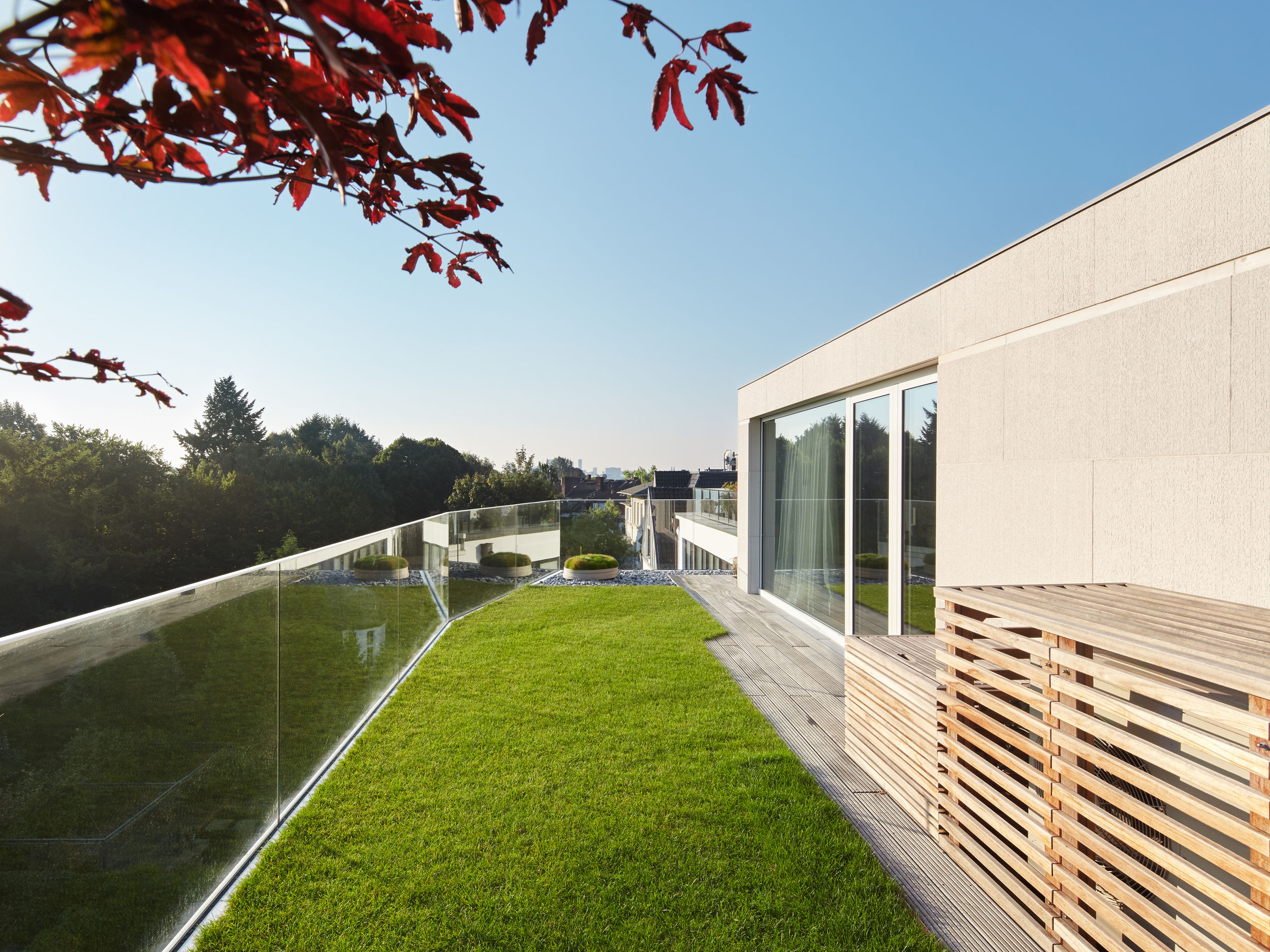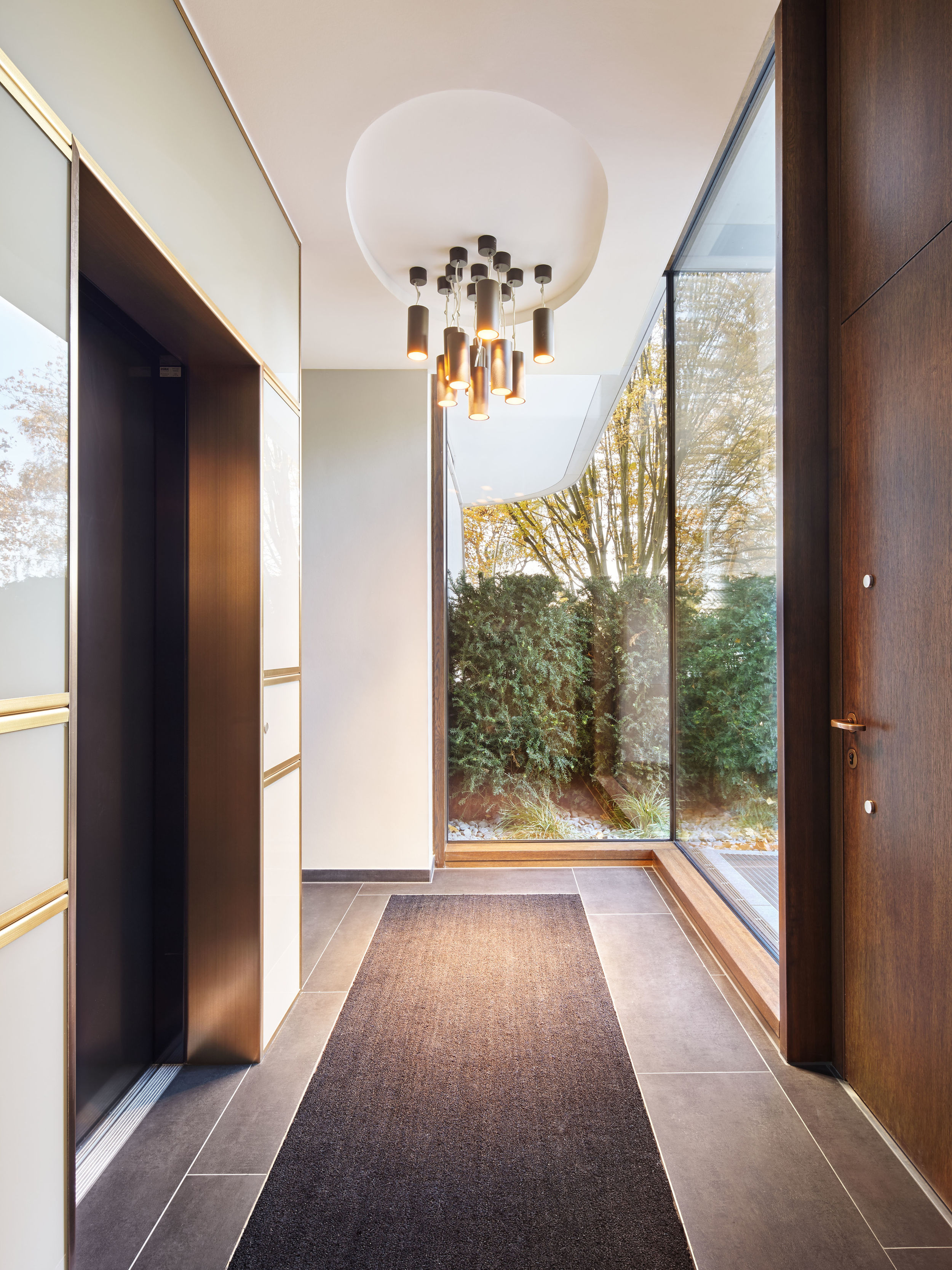 Auf dem Eckgrundstück in direkter Außenalsterlage, entstand ein Neubau mit fünf großzügigen, luxuriösen Eigentumswohnungen. Sowohl die repräsentative Frontfassade als auch die Gartenseite nehmen die vorhandenen Baufluchten und Traufhöhen auf, so dass sich das Gebäude harmonisch in das heterogene Bestandsgefüge eingliedert. Die Ecke wird bewusst durch eine Überhöhung und ihre imposante Öffnung aufgewertet. Das runde Panoramafenster ermöglicht einen malerischen Rundumblick aus den Wohnbereichen auf das Alsterpanorama und die Stadtsilhouette. Das Galeriegeschoss wird durch diese Betonung auch von der gegenüberliegenden Alsterseite zum einzigartigen Blickfang.
