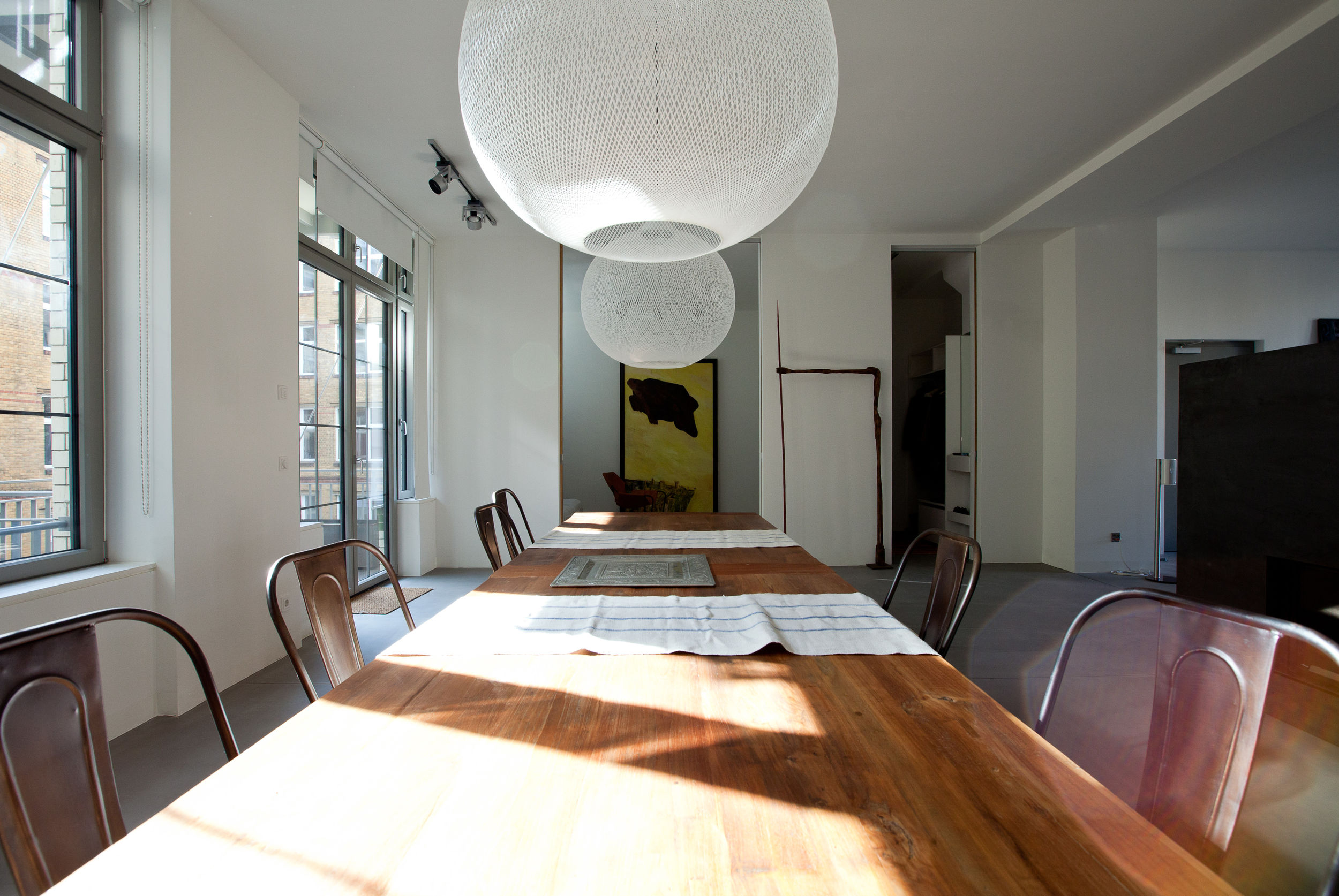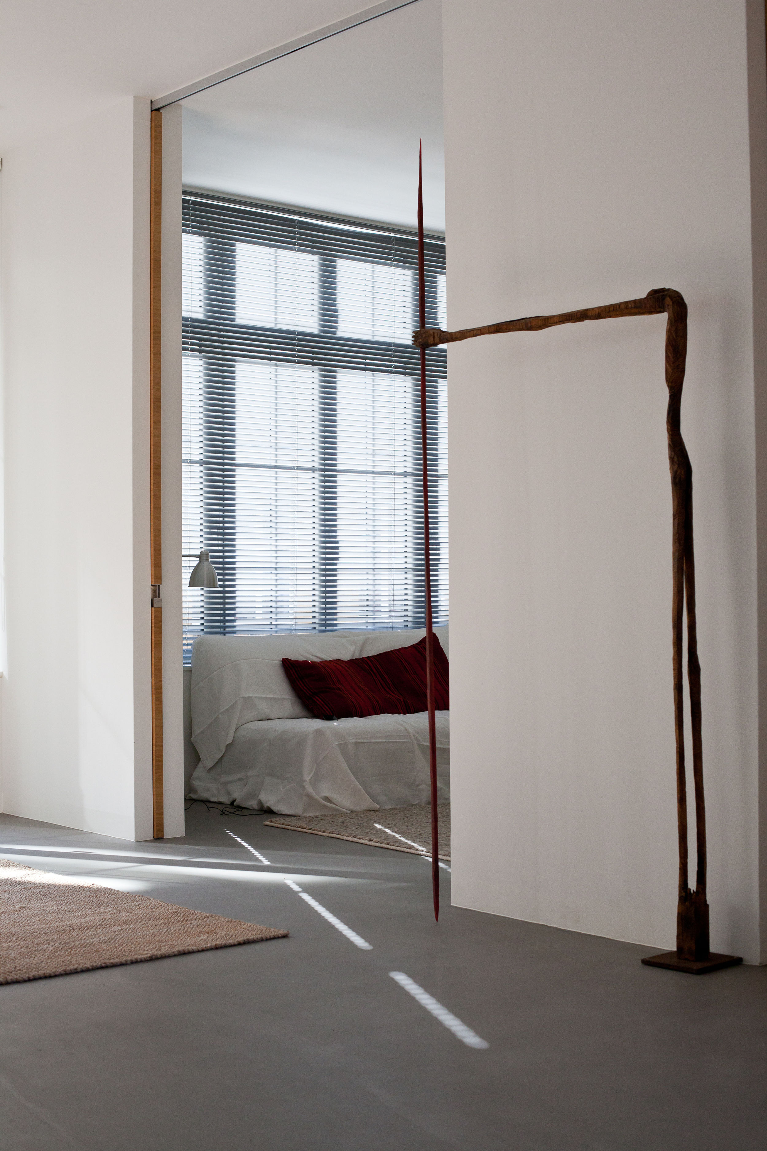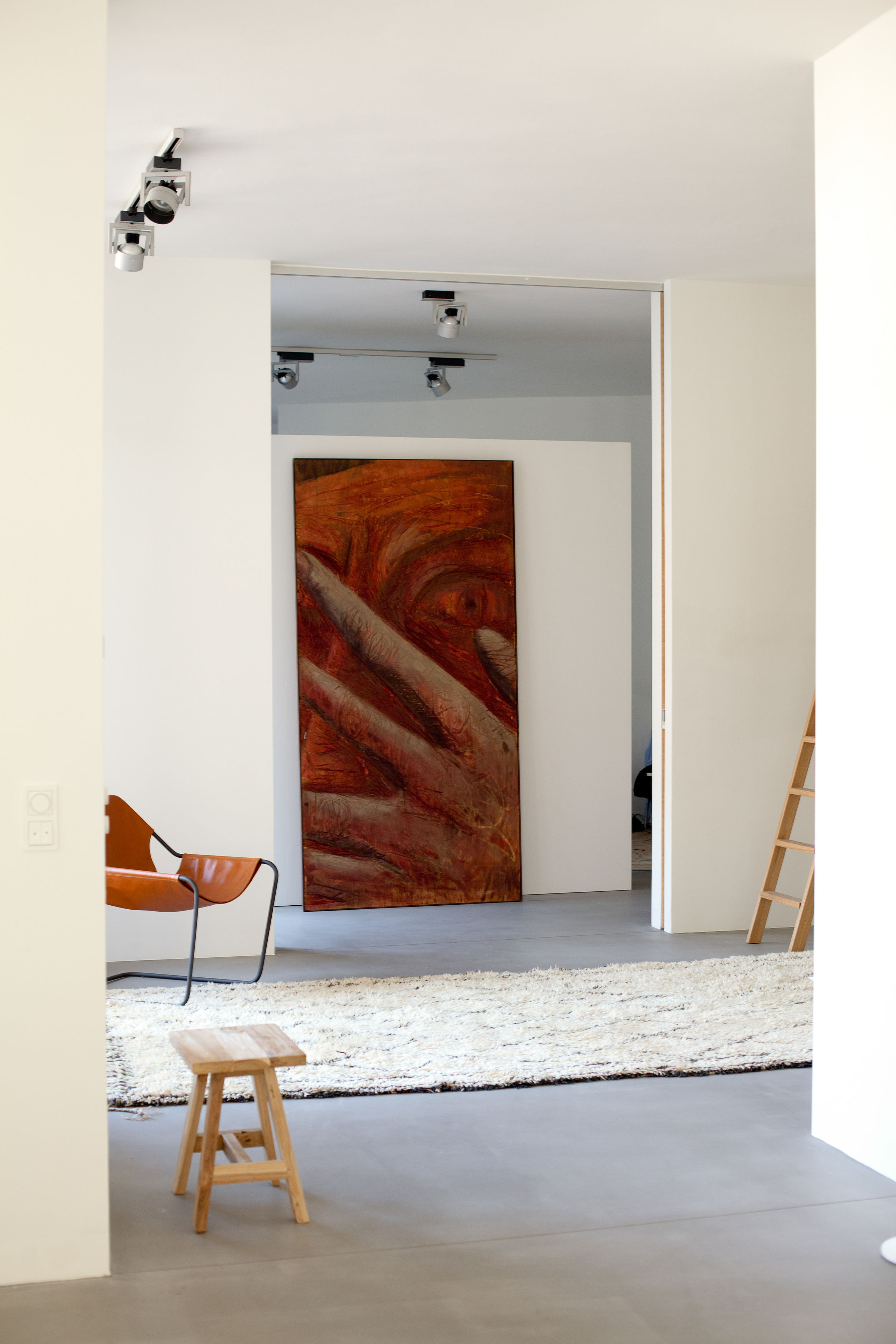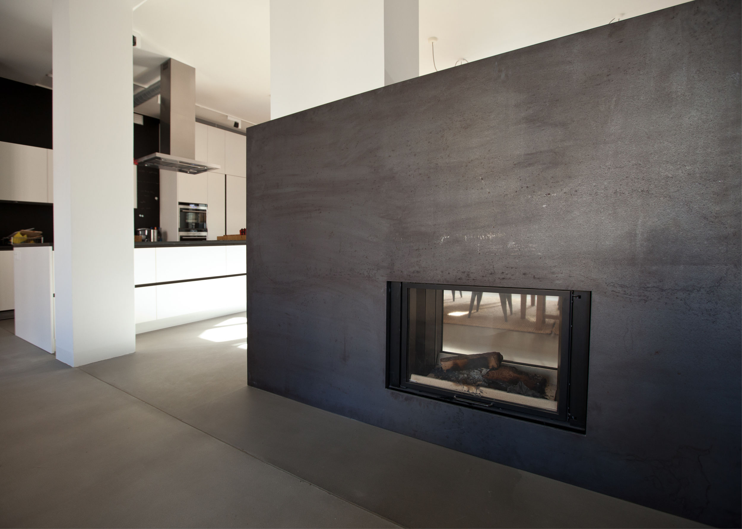 Ein loftartiger Ausbau in einem historischen Industriegebäude einer ehemaligen Schokoladenfabrik im Berliner Szenestadtteil Prenzlauer Berg ist hier entstanden. Lebensmittelpunkt ist ein großer Raum, der gleichzeitig dem Aufenthalt der Bewohner dient, als auch die offene Küche beherbergt. Wie eine Skulptur steht der stählerne Kamin mit durchgehender Brennkammer im Zentrum des Raums. Die privaten Bereiche, wie Schlafzimmer, Gästezimmer und Sanitärbereiche, schließen sich weitläufig links und rechts der Küche an. Der zurückhaltende Innenausbau schafft den angemessenen Rahmen für die expressiven Kunstwerke des Künstlers Trak Wendisch.