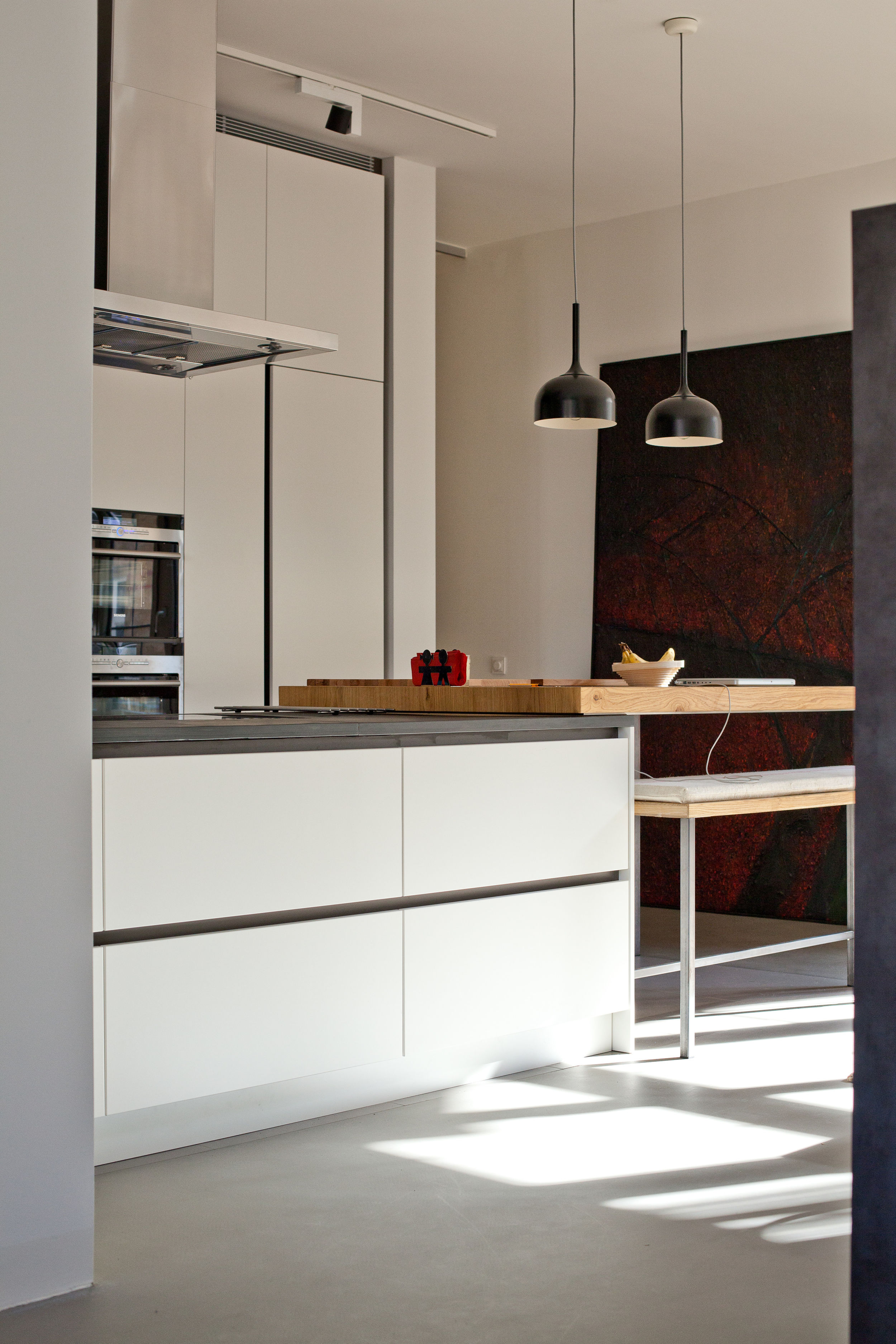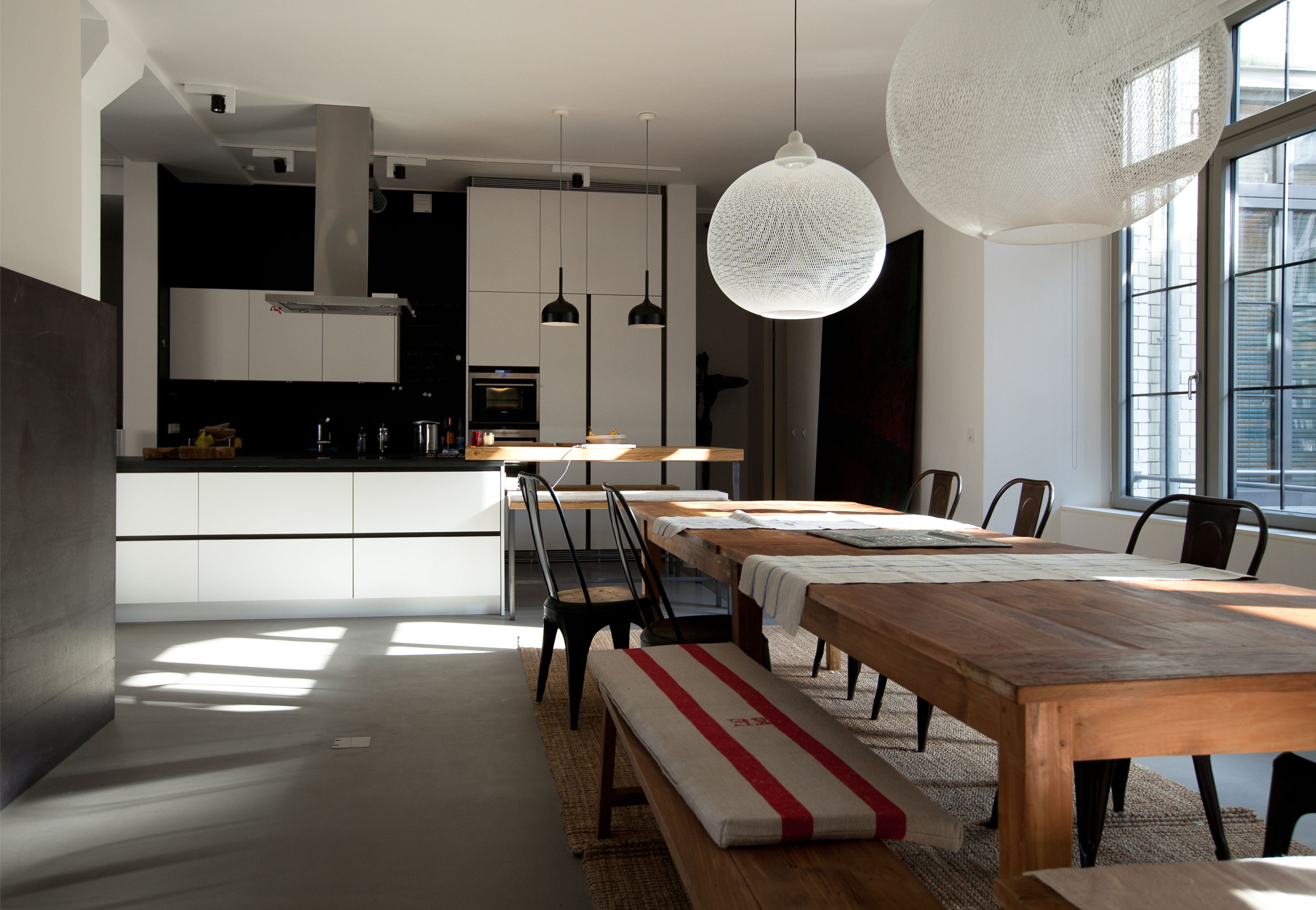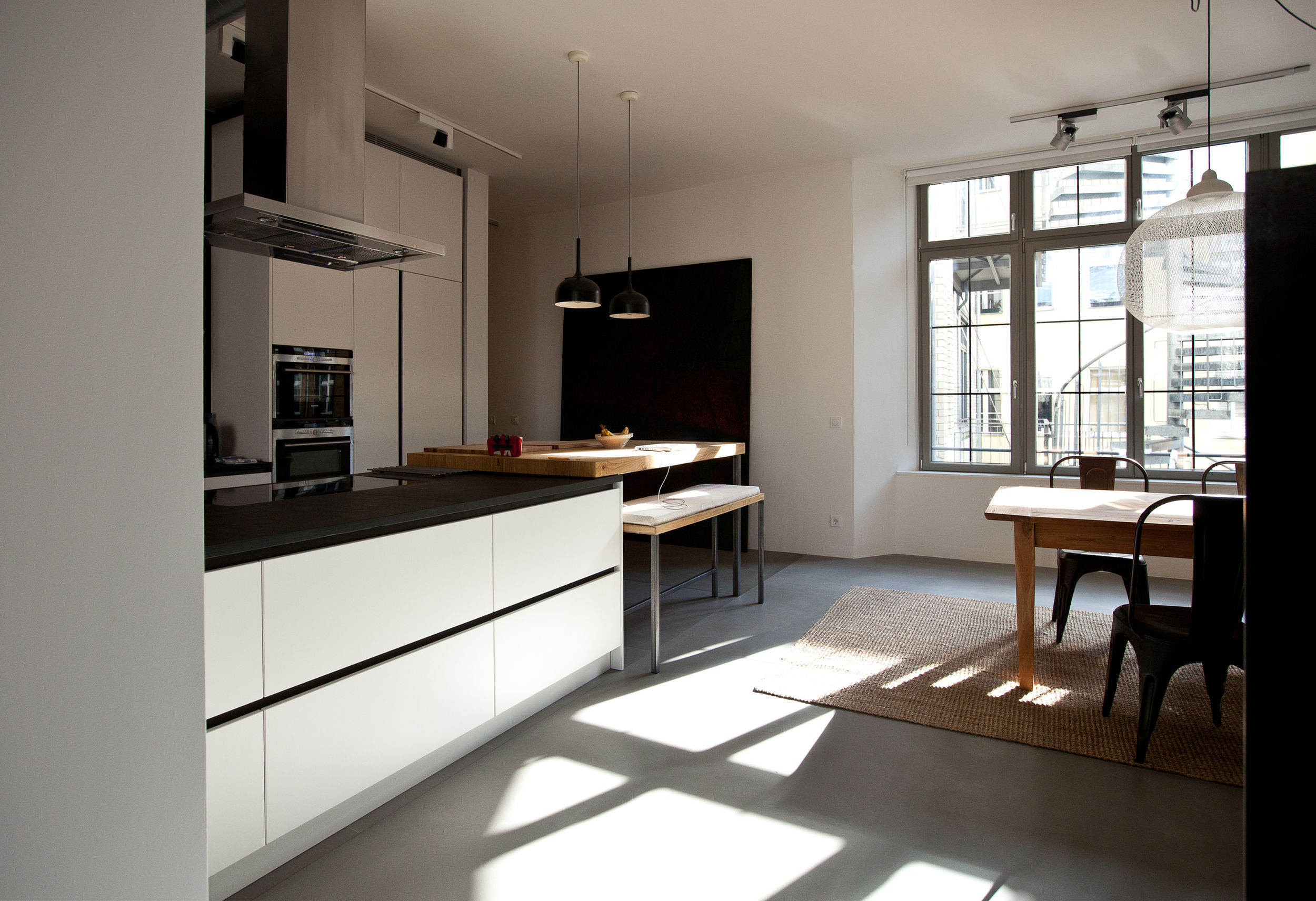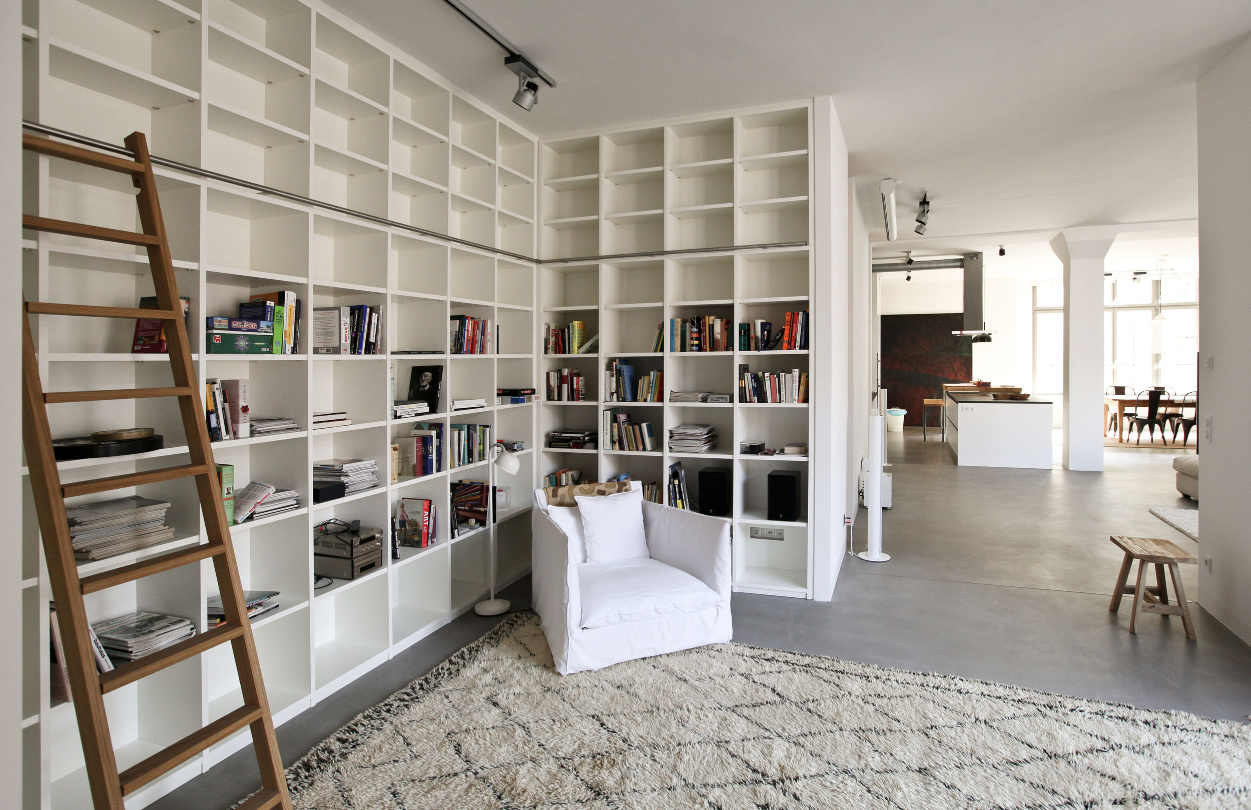 Ein loftartiger Ausbau in einem historischen Industriegebäude einer ehemaligen Schokoladenfabrik im Berliner Szenestadtteil Prenzlauer Berg ist hier entstanden. Lebensmittelpunkt ist ein großer Raum, der gleichzeitig dem Aufenthalt der Bewohner dient, als auch die offene Küche beherbergt. Wie eine Skulptur steht der stählerne Kamin mit durchgehender Brennkammer im Zentrum des Raums. Die privaten Bereiche, wie Schlafzimmer, Gästezimmer und Sanitärbereiche, schließen sich weitläufig links und rechts der Küche an. Der zurückhaltende Innenausbau schafft den angemessenen Rahmen für die expressiven Kunstwerke des Künstlers Trak Wendisch.