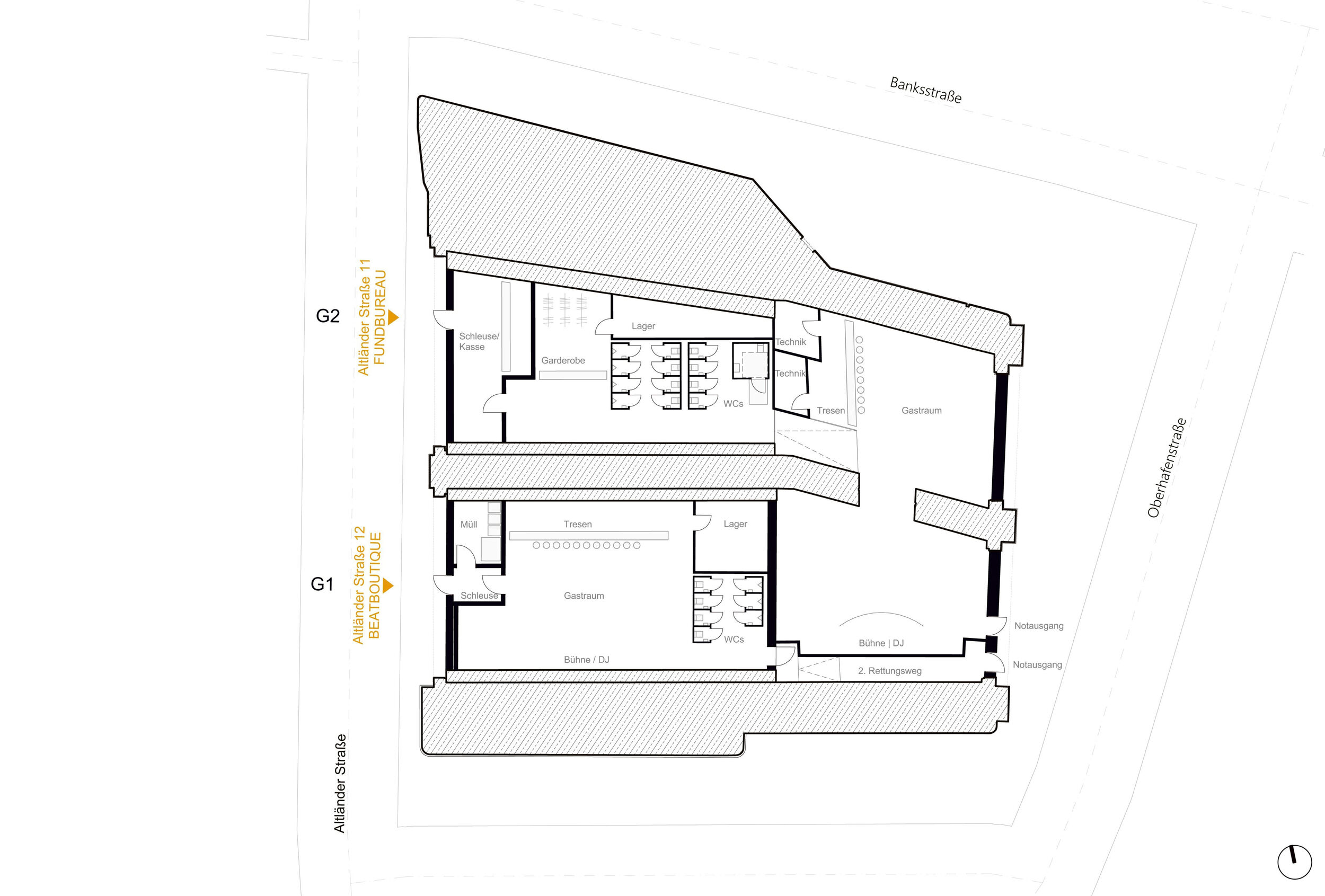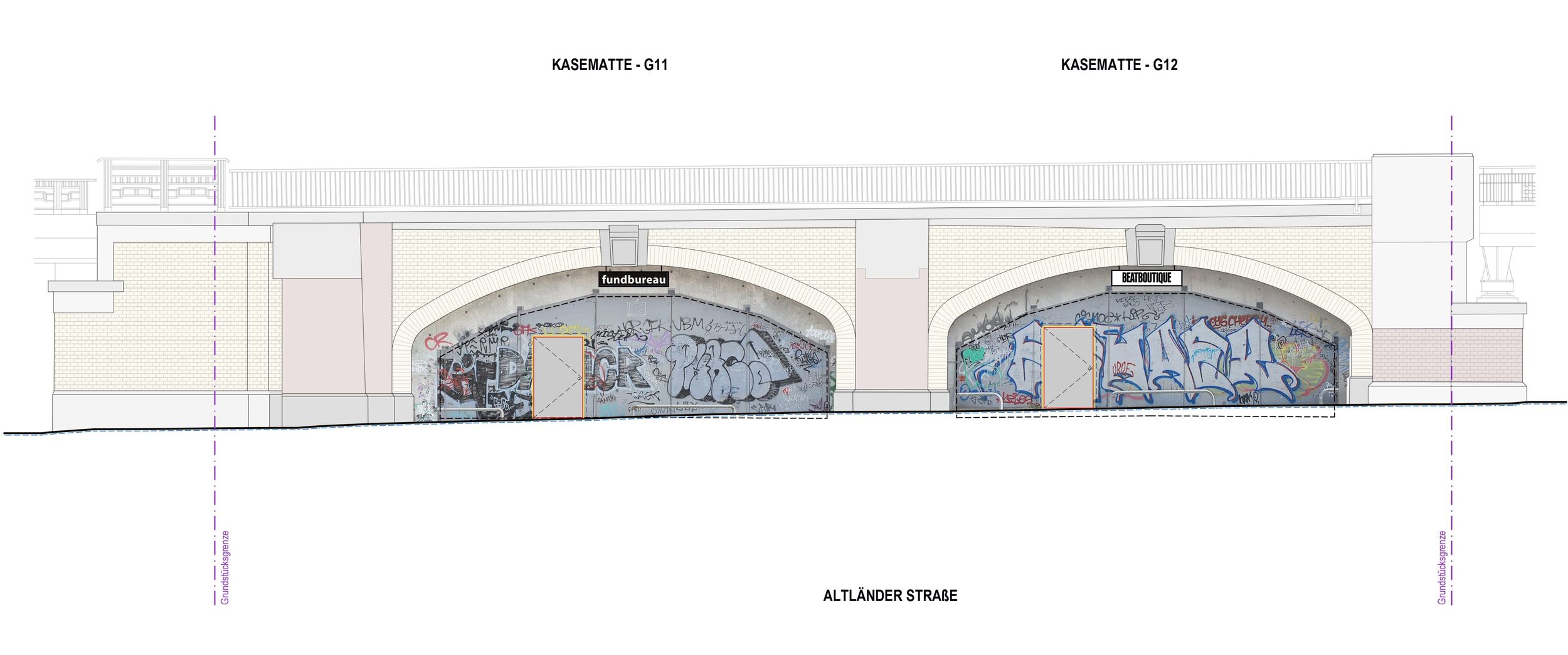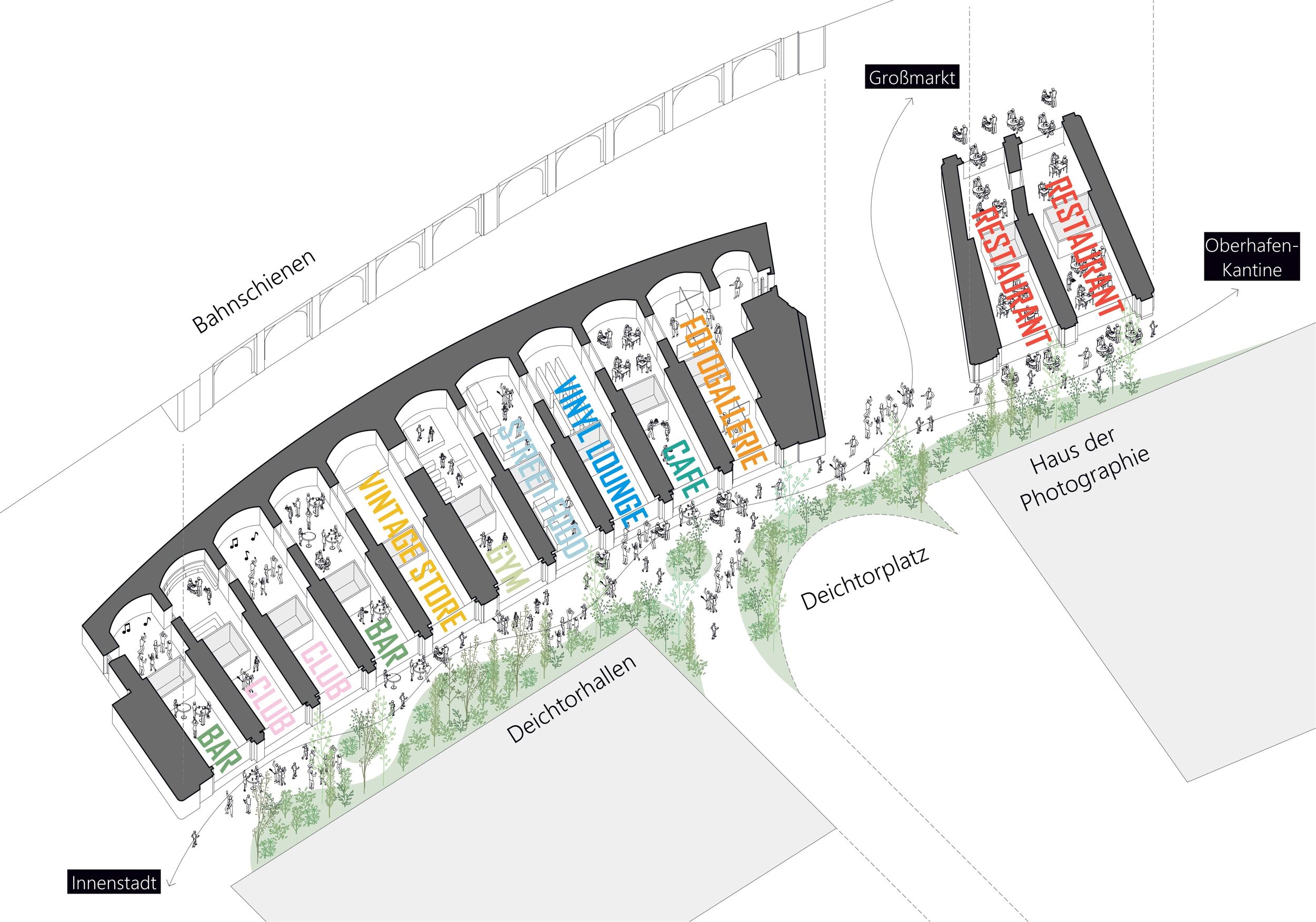 Die Kasematten an den Deichtorhallen wurden auf der Basis unserer Planung und nach umfangreichen Sanierungsarbeiten durch die Sprinkenhof GmbH zum Interimsstandort für die Szene-Clubs Beat Boutique und Fundbureau. Diese mussten ihre angestammte Heimat im Schanzenviertel infolge des Neubaus der Sternbrücke verlassen. Die roughe Industriearchitektur der historischen Bahngewölbe bietet den Clubs eine neue und angemessene Heimat - und der Stadt Hamburg einen neuen, lebendigen Kulturort.
