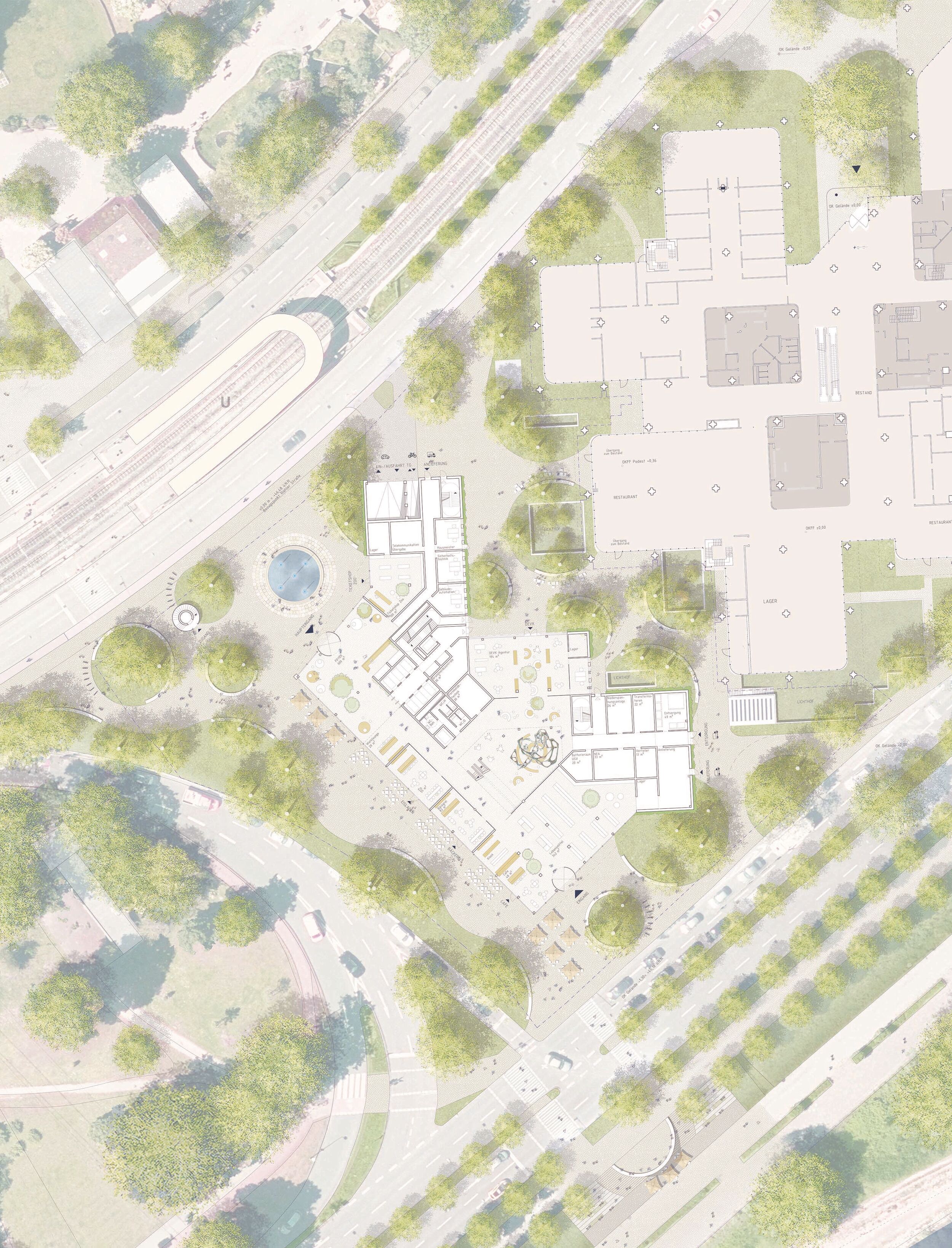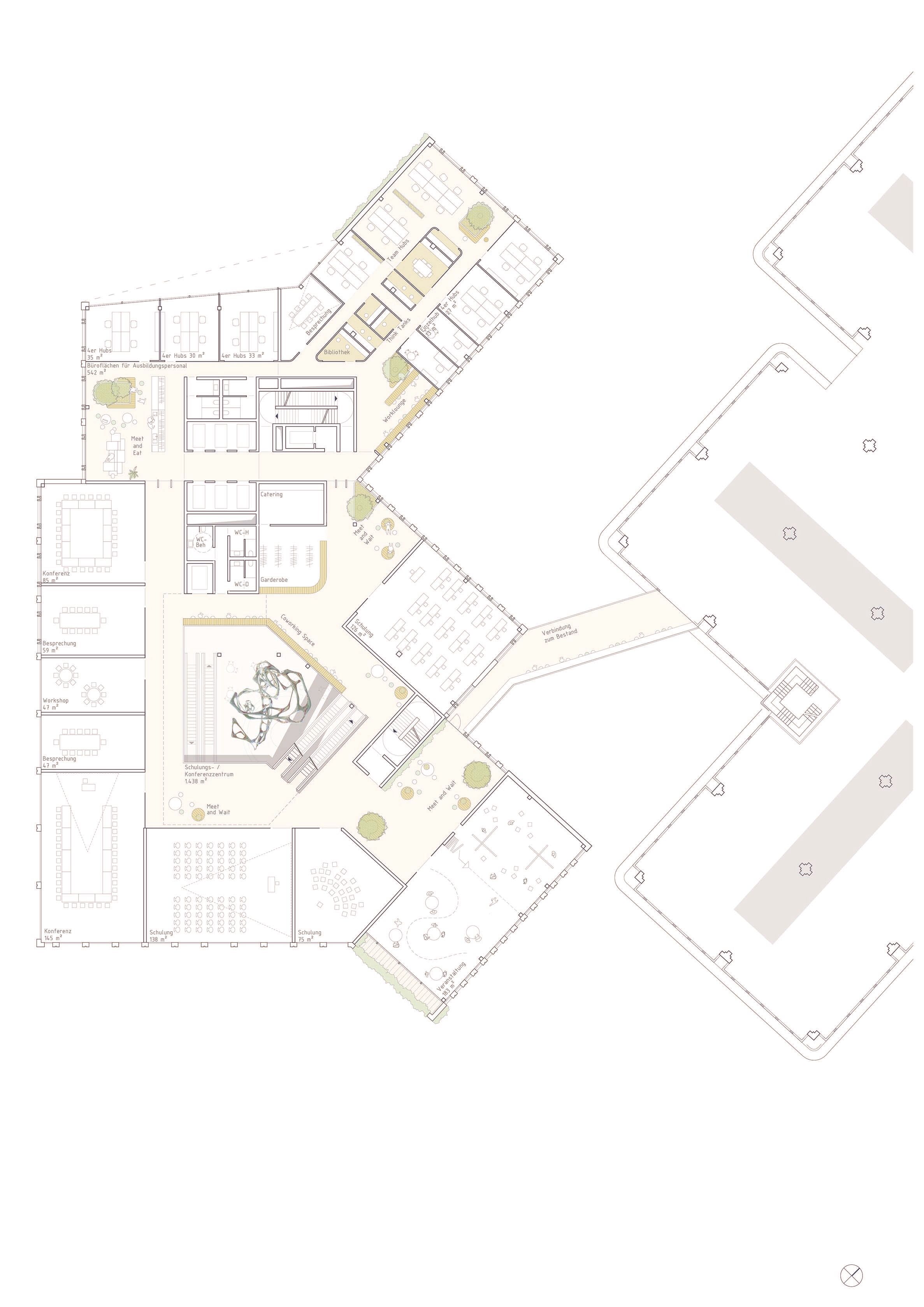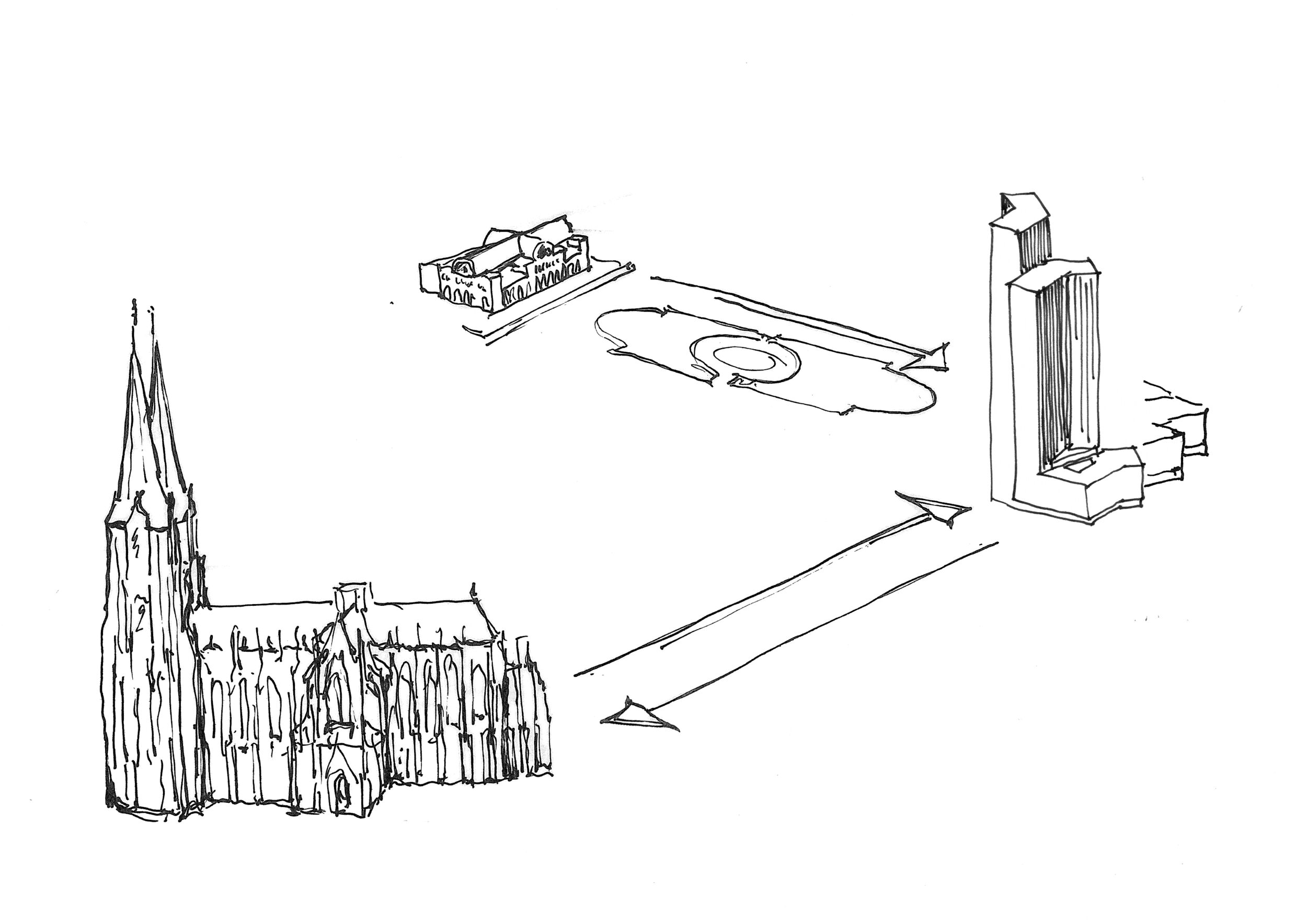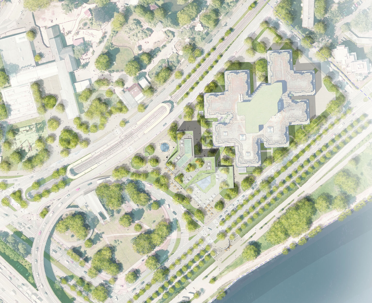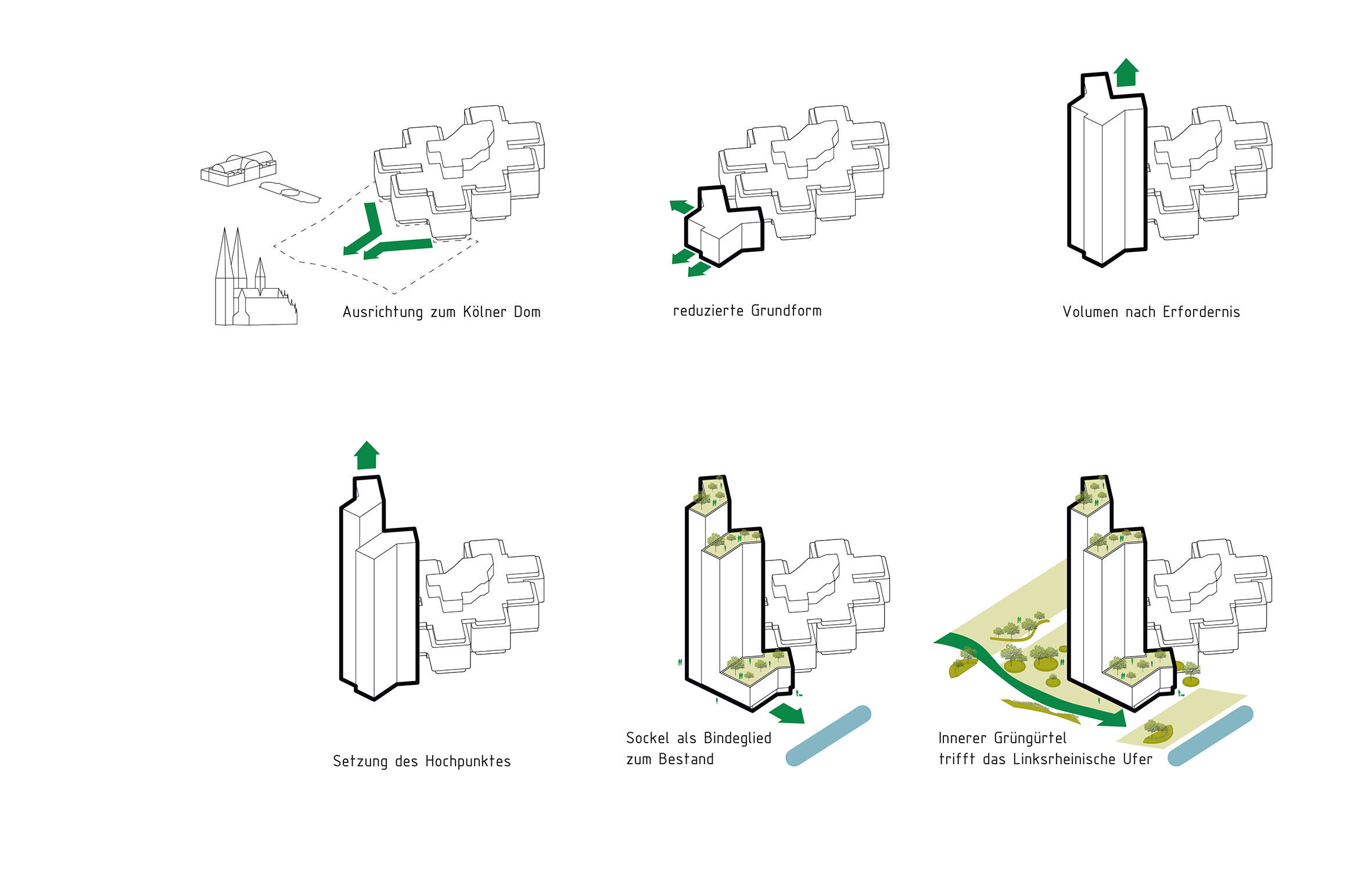 Insbesondere die Gebäudeausrichtung wurde so gewählt, dass sich die schmalste, und zusätzlich in zwei Scheiben teilende Gebäudeseite, in Richtung Dom und Innenstadt orientiert. Dieser Aspekt erfährt im Gebäude durch ein in den obersten Etagen in Richtung Innenstadt angeordnetes Panoramafenster seine gestalterische Entsprechung und darf als Geste der Würdigung verstanden werden. Überzeugen konnte BAID durch eine Vergrößerung der Außenanlagen und damit eine größtmögliche Grünverbindung zum Rhein, die dadurch parallel zum Kölner Grüngürtel eine neue fußläufige grüne Anbindung der umliegenden Kölner Stadtteile an die Rheinaue mit seinen Wander- und Pilgerwegen ermöglicht.