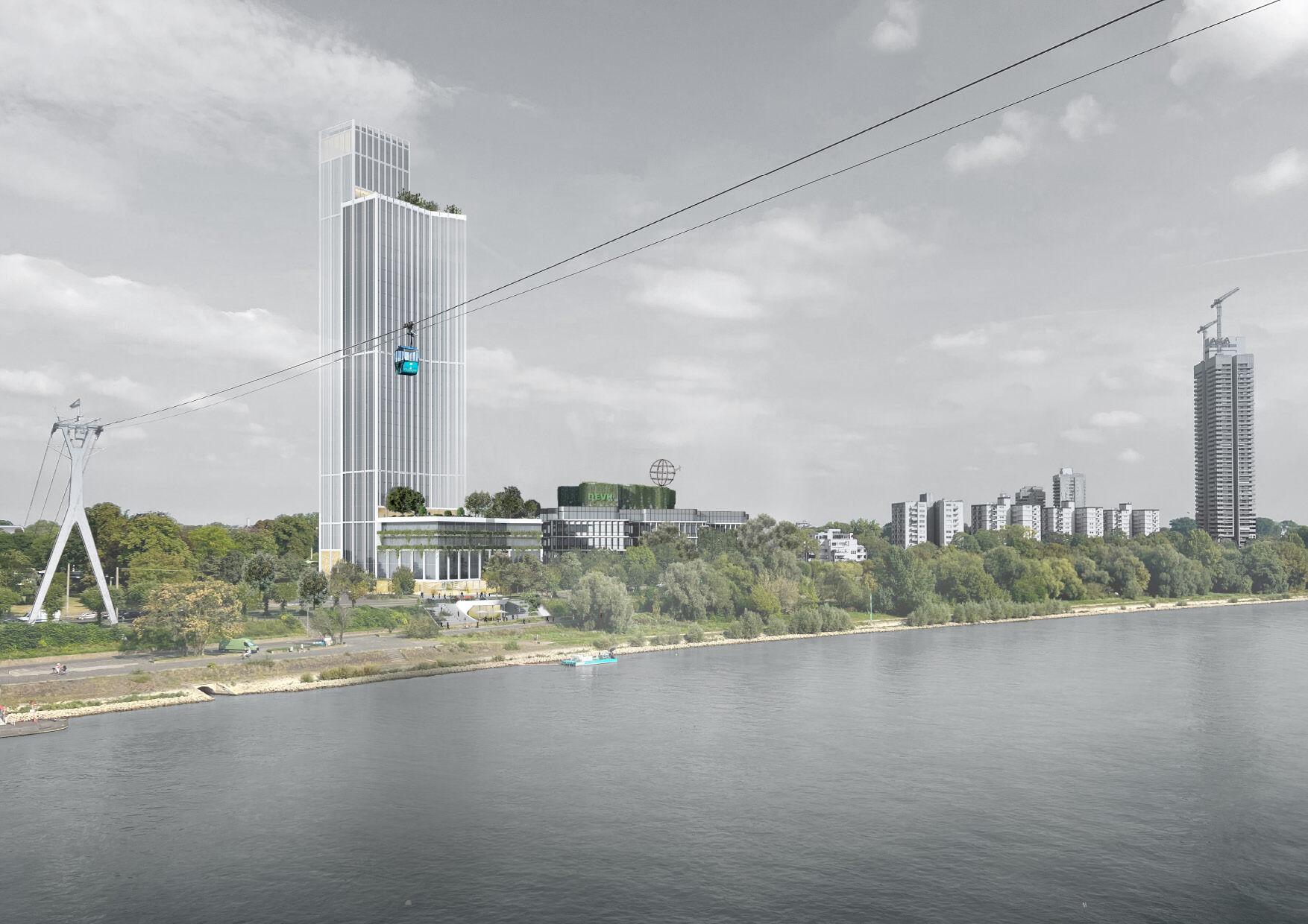 Das in der Höhe differenzierte Scheibenhochhaus orientiert sich mit seinem Volumen an der gewünschten 100 Meter Grenze der Stadt und setzt einen markanten Hochpunkt zum Niederländer Ufer in Köln. Dennoch reiht sich der Neubau auf dem ehemaligen Gelände des Parkhauses am Zoo städtebaulich in die umgebende Wohnbebauung ein und vermittelt zu den Höhen der umliegenden Hochpunkte entlang des Rheinufers. Dabei bleiben die wesentlichen Sichtachsen und der Raum zum Dom frei. Der Gebäudesockel wurde auf ein Mindestmaß reduziert, um einen landschaftlichen Raum als Verbindung zwischen Flora, Zoo und dem Rheinufer zu schaffen.
