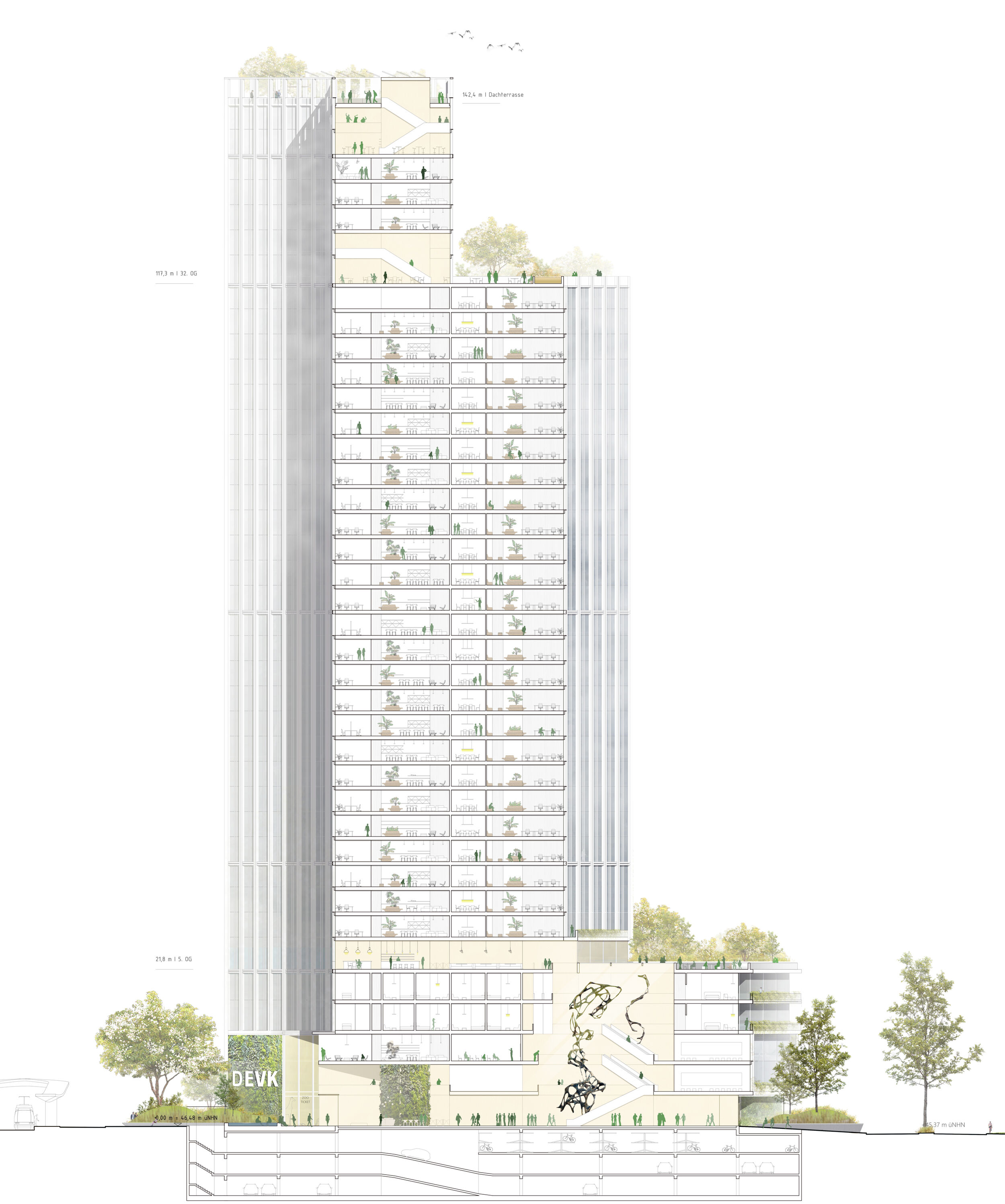 Zum Einladungswettbewerb des Versicherungsunternehmen DEVK für den Neubau und das Areal der neuen Hauptzentrale waren acht internationale Büros eingeladen, von denen nur fünf in die entscheidende zweite Phase gekommen sind.