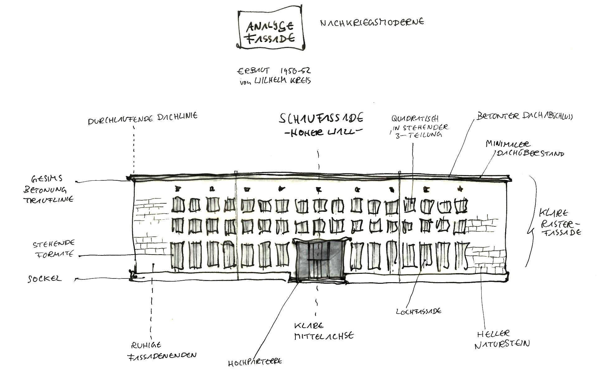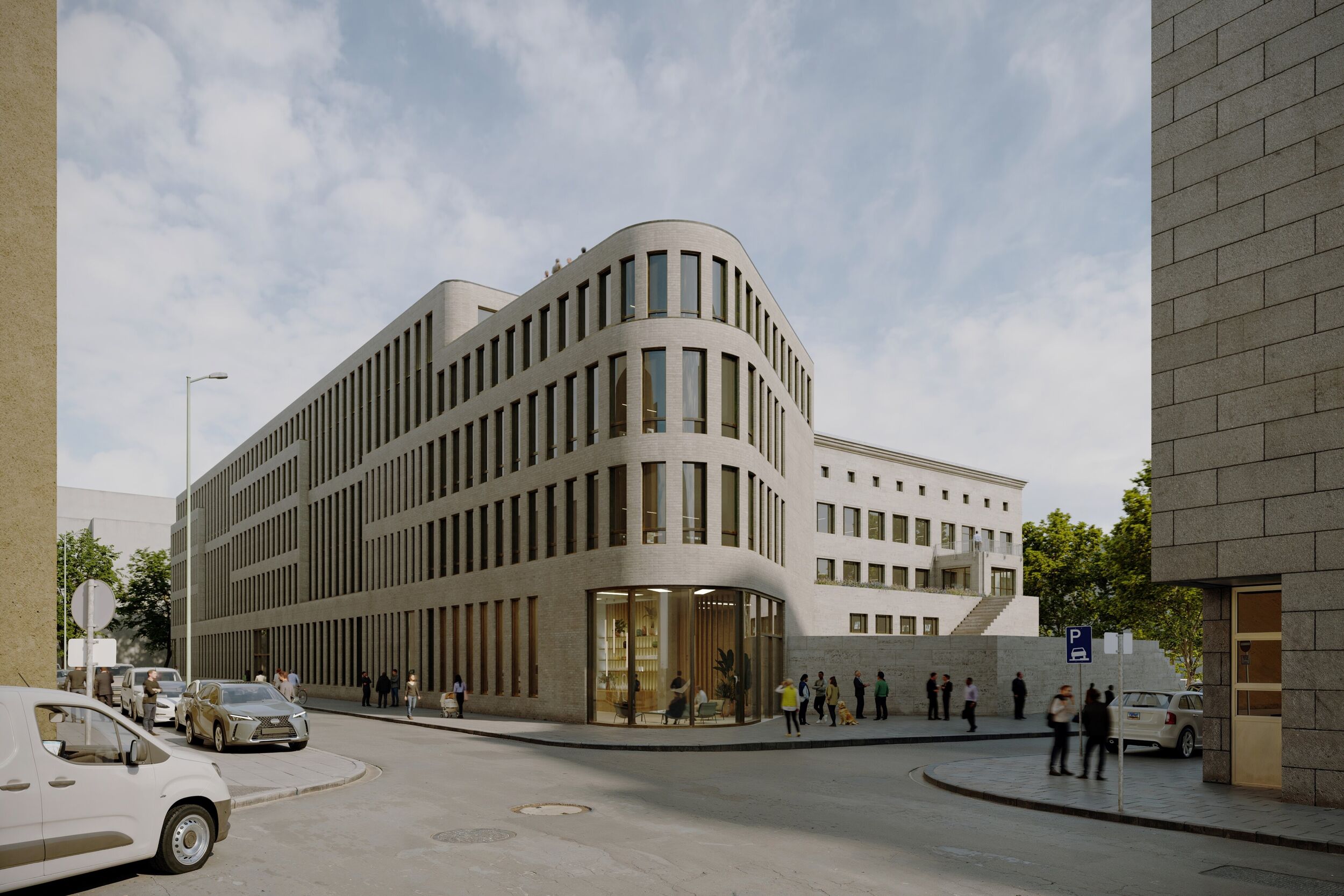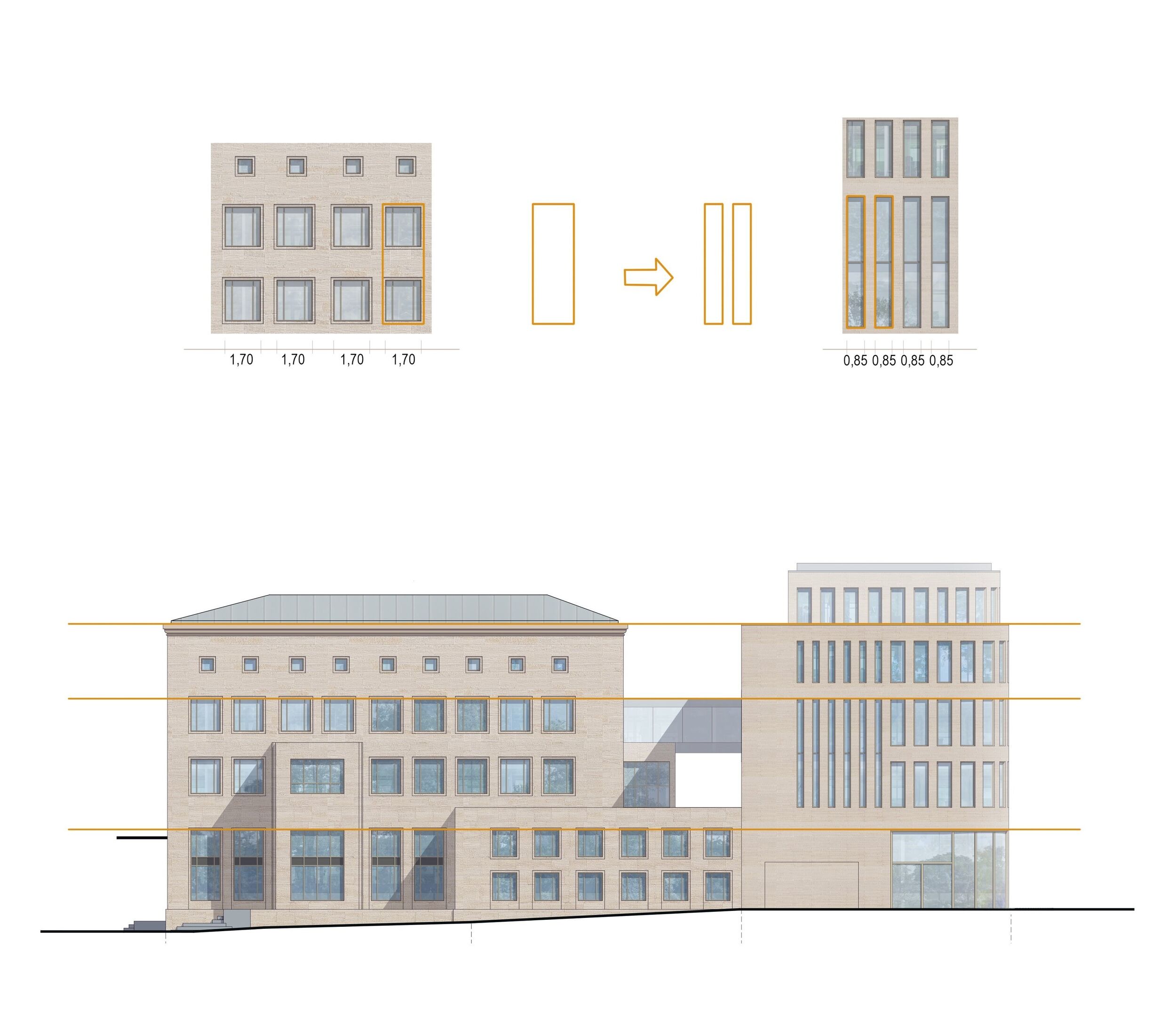 Der 4+ geschossige Baukörper nimmt Bezüge aus der Fassade des Denkmals und den Raumkanten der Nachbarn auf und entwickelt gleichzeitig seine eigenständige Präsenz. Als Reaktion auf die kleinteilige gegenüberliegende Bebauung wird die Fassade der neuen Längsansicht durch Rücksprünge entlang der Poststraße gegliedert. Das gewählte vertikale Fassadenkonzept interpretiert die Proportionen der Fenster des Denkmals neu und rhythmisiert mit verschiedenen Formaten die Fassade des Neubaus.
