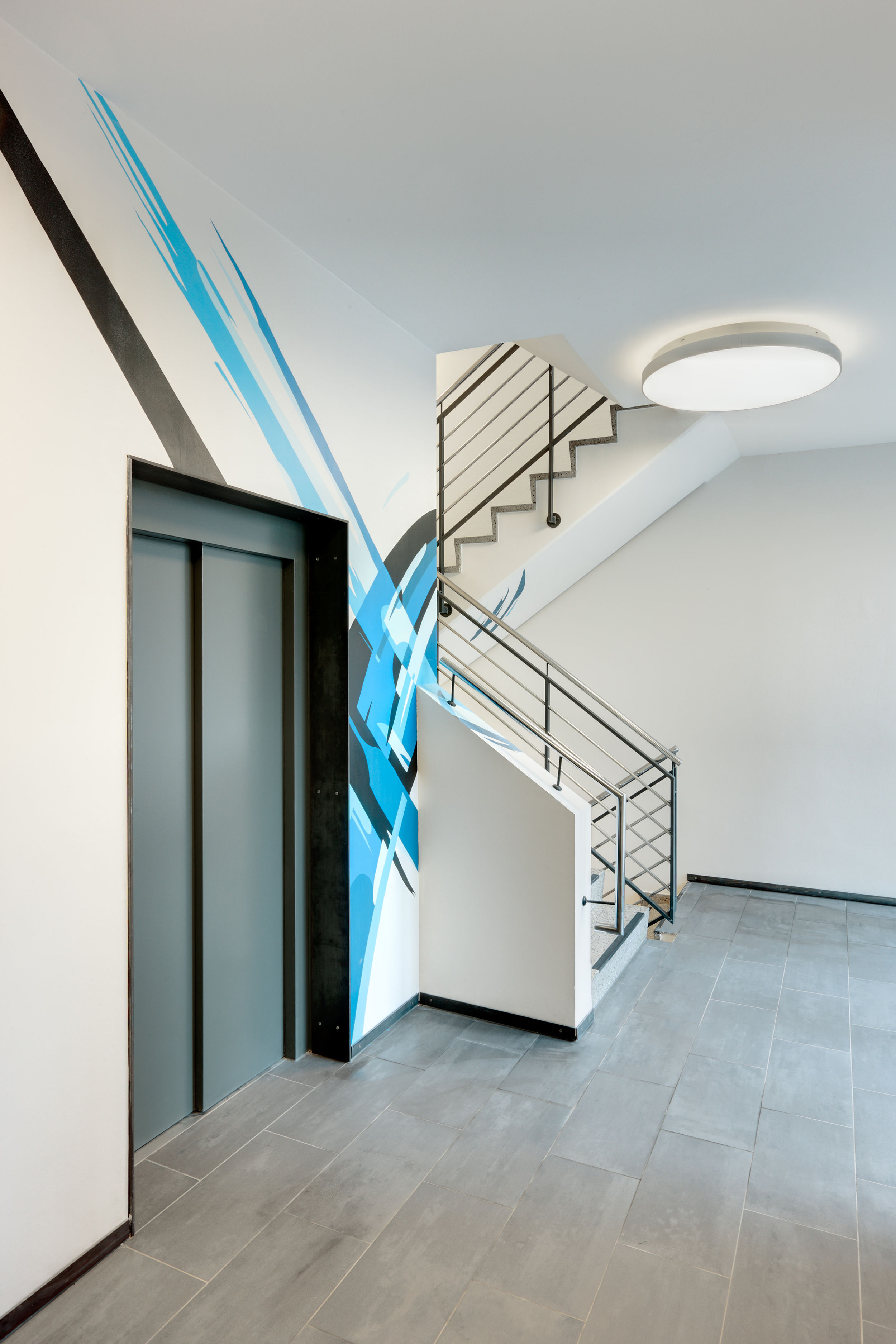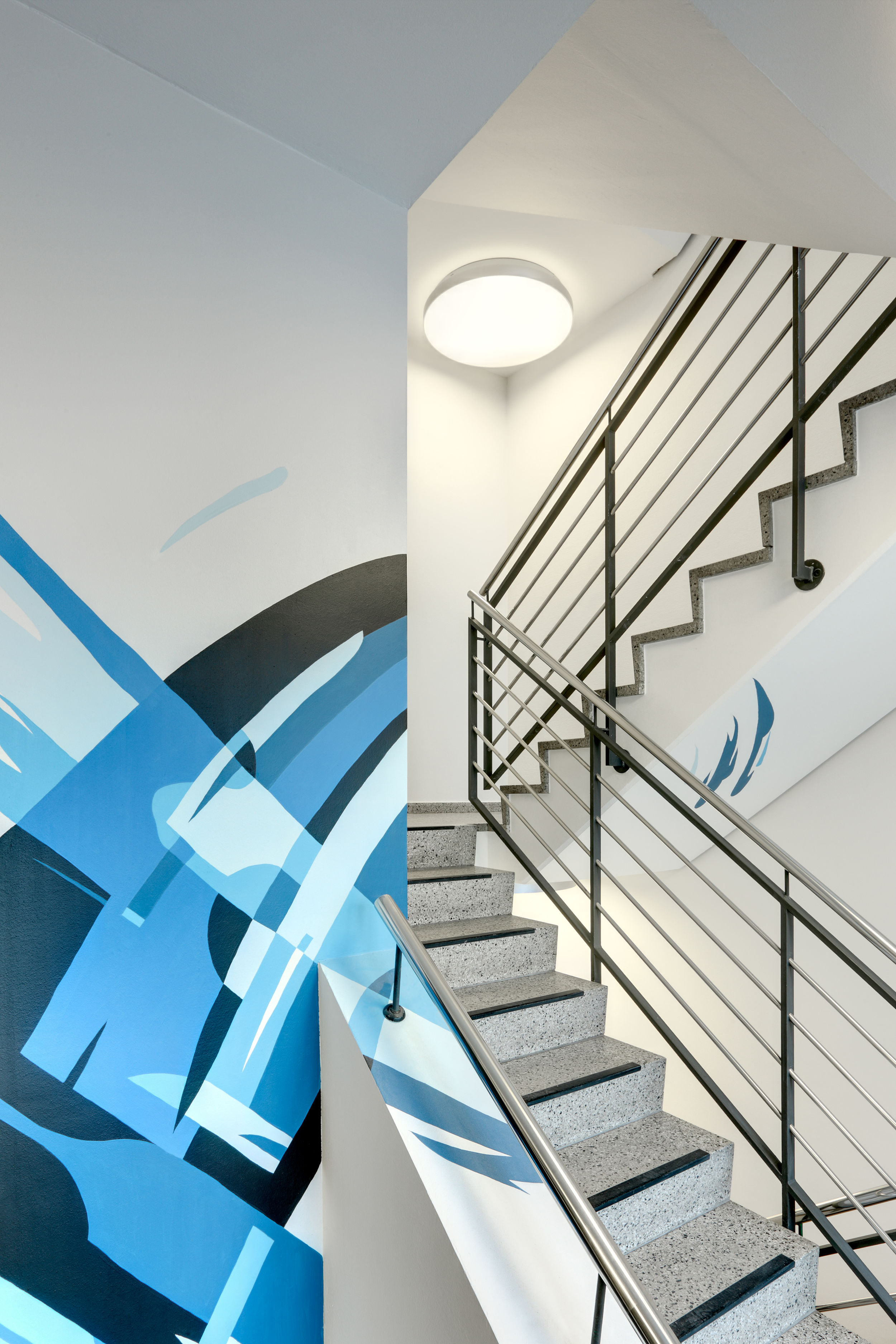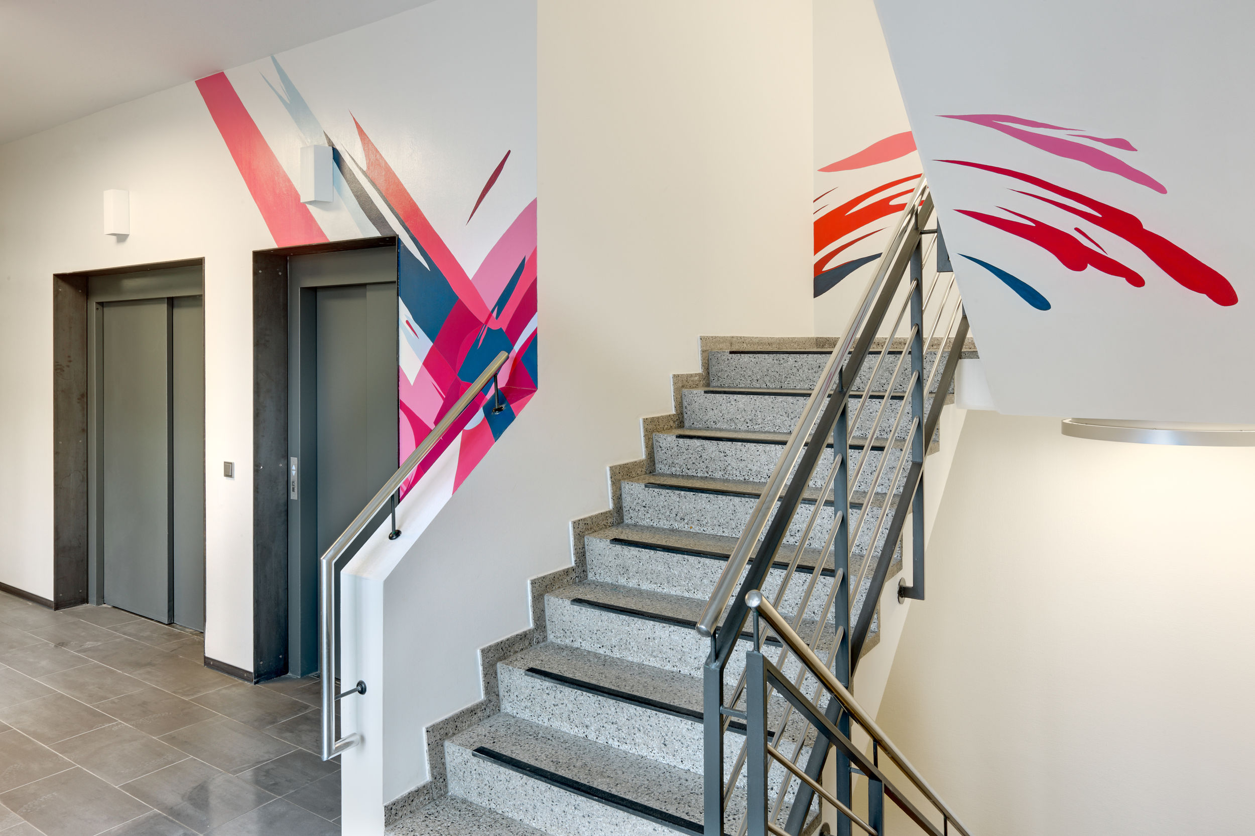 Ein individuelles Designkonzept für ein breites Nutzungsspektrum wurde entwickelt, welches effizientes und kreatives Arbeiten fördert. Ein spannender Kontrast zwischen den farbigen und dynamischen Formen im Treppenhaus und der Funktionalität der Büroetagen entstand. Das Miteinander von Kunst und Architektur findet im Außen- und Innenbereich ein harmonisches Zusammenspiel und bilden einen Arbeitsort zum Wohlfühlen.