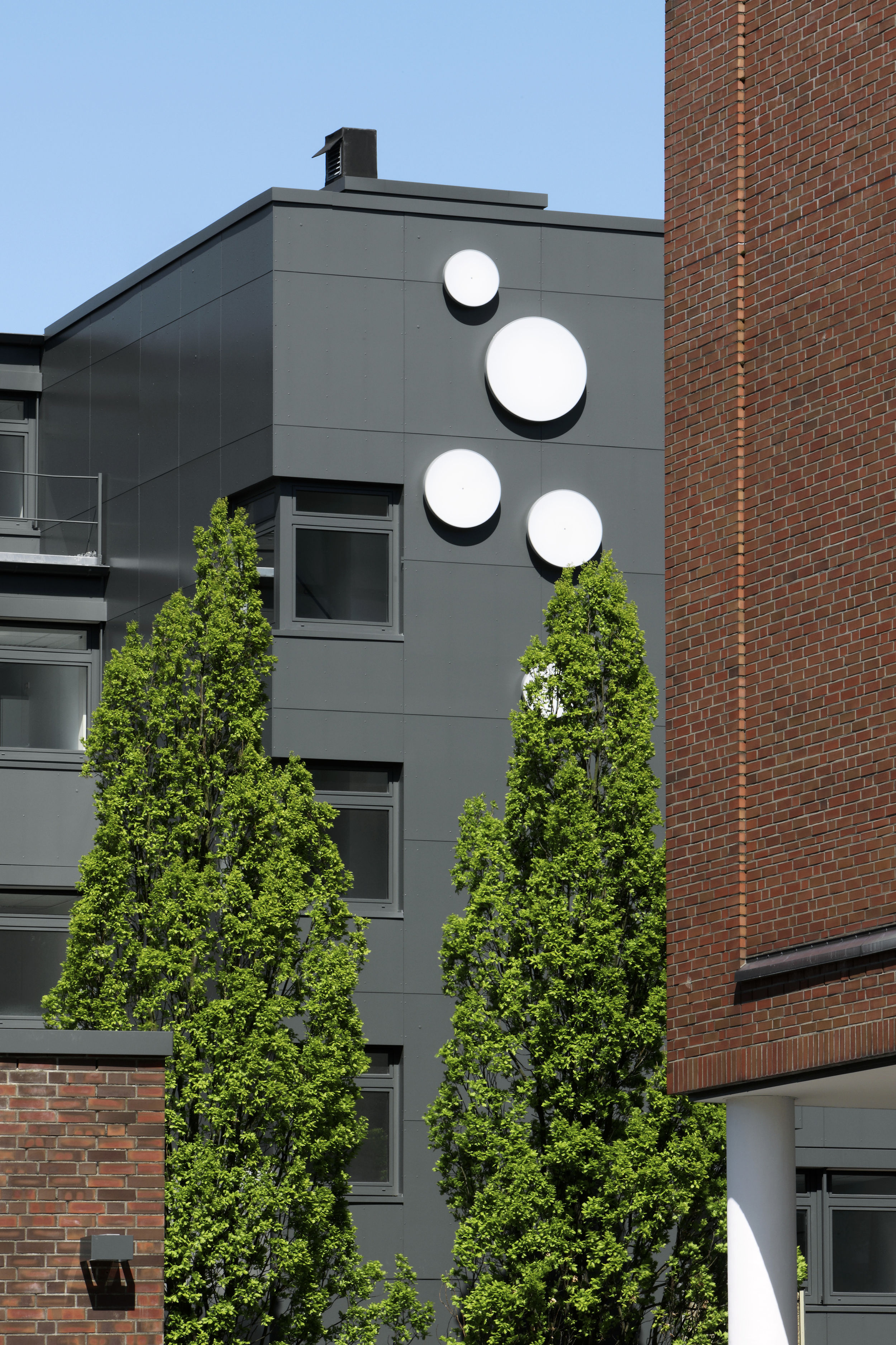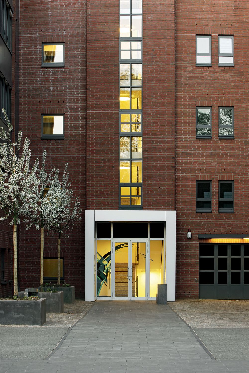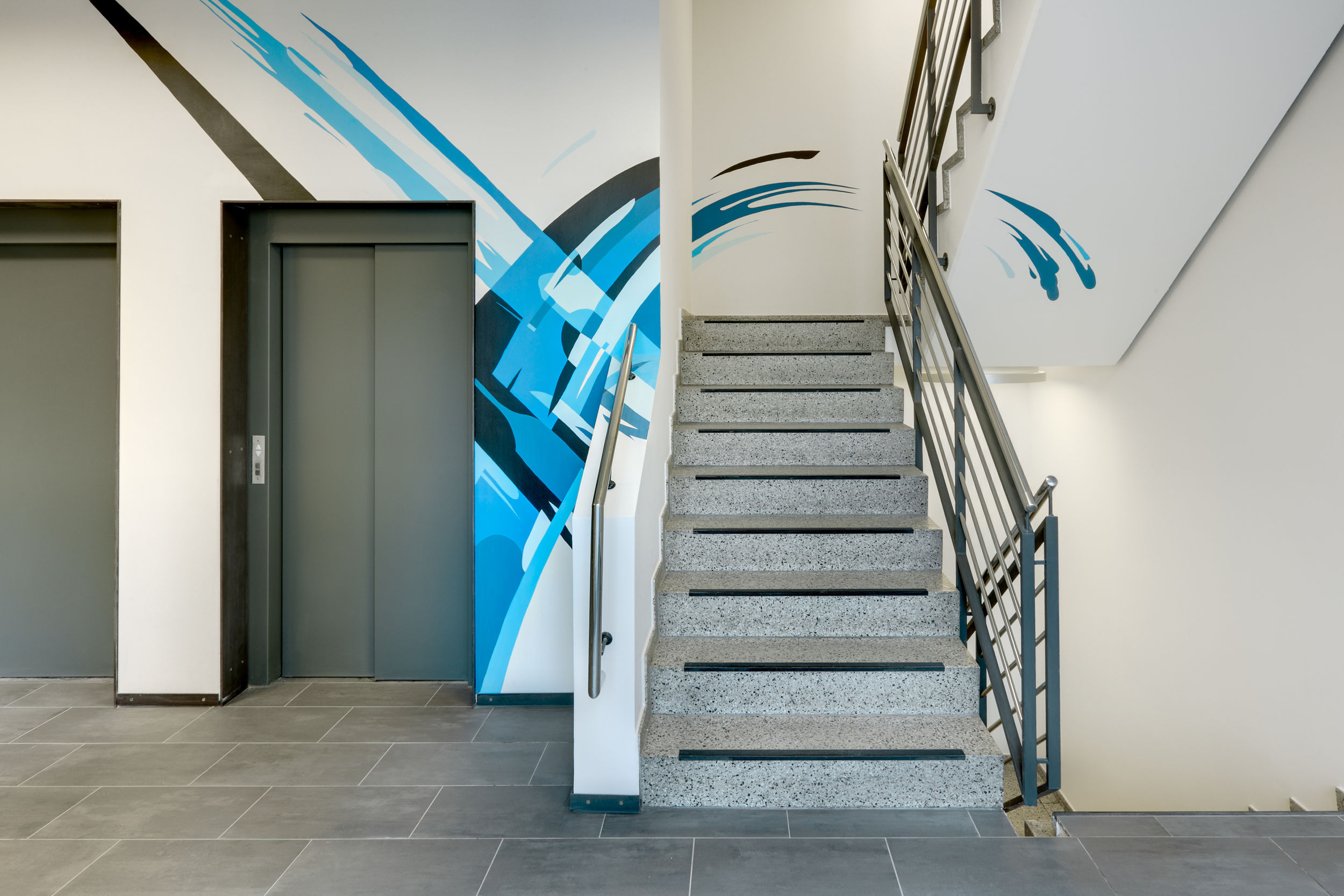 Ein individuelles Designkonzept für ein breites Nutzungsspektrum wurde entwickelt, welches effizientes und kreatives Arbeiten fördert. Ein spannender Kontrast zwischen den farbigen und dynamischen Formen im Treppenhaus und der Funktionalität der Büroetagen entstand. Das Miteinander von Kunst und Architektur findet im Außen- und Innenbereich ein harmonisches Zusammenspiel und bilden einen Arbeitsort zum Wohlfühlen.