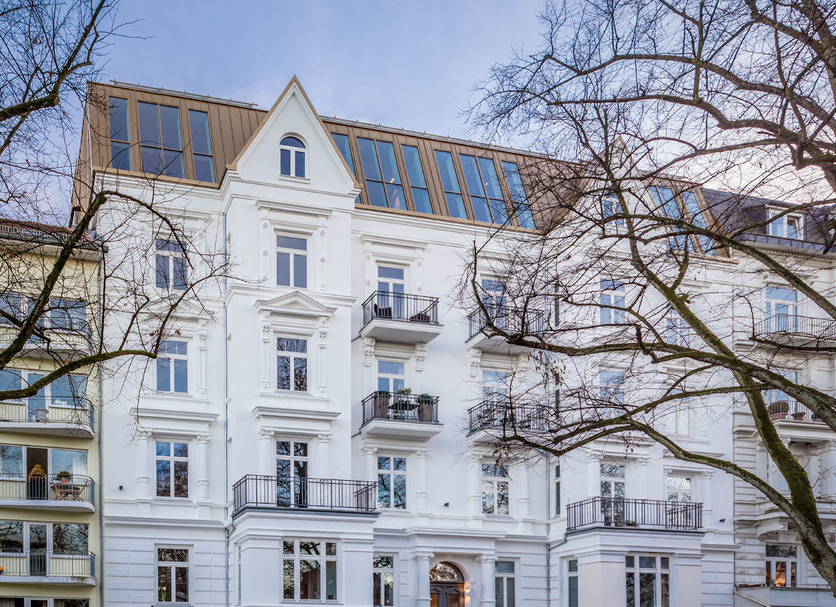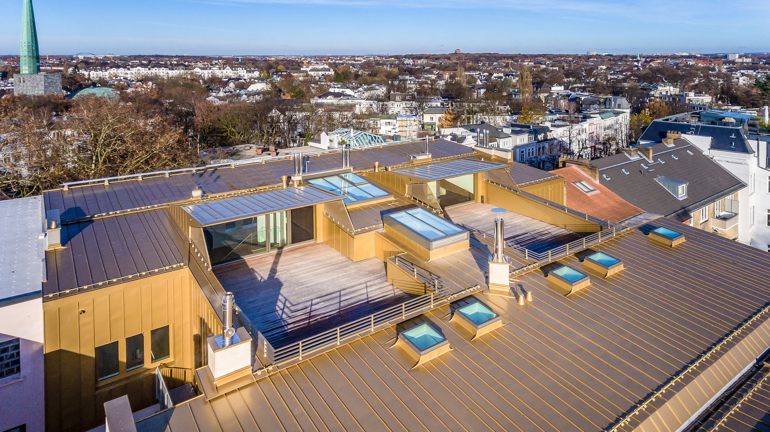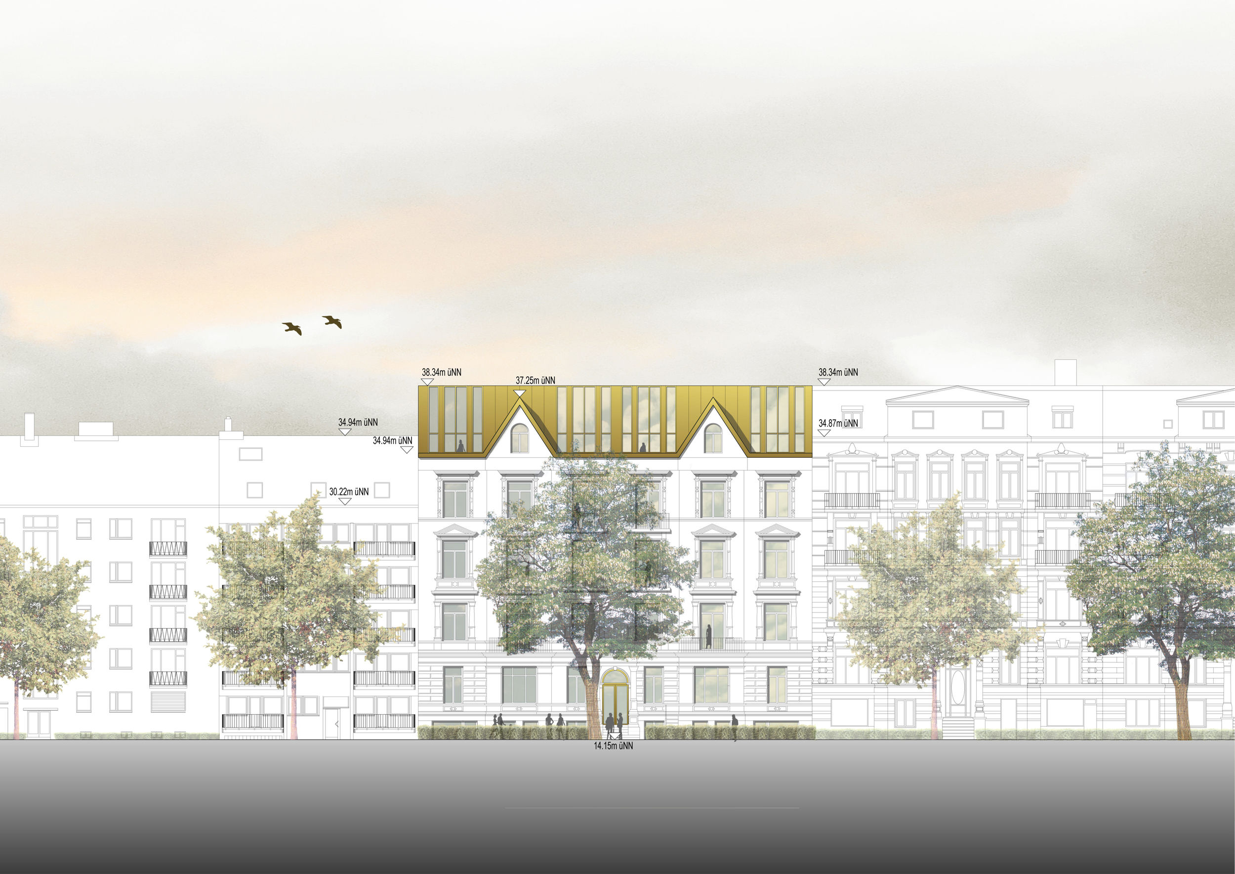 In Hamburg-Harvestehude, in der Hagedornstrasse 31, entstehen zwei hochwertige Penthouses auf dem historischen Mehrfamilienhaus aus dem Jahre 1889, das 1939 vom Architekten Werner Kallmorgen umgebaut wurde. Das viergeschossige Bestandsgebäude wurde als Mauerwerkskonstruktion mit Holzbalkendecken errichtet und erhält mit den zwei neu erstellten Penthouses einen neuen, dem Haus angemessenen Dachabschluss. Die zwei Penthouses sind über das gemeinschaftliche, innenliegende Treppenhaus und über den Personenaufzug erreichbar. Die Terrassen der Penthouses sind in die Dachhaut „eingedrückt“, so dass sie von der Straße aus nicht ersichtlich sind.
