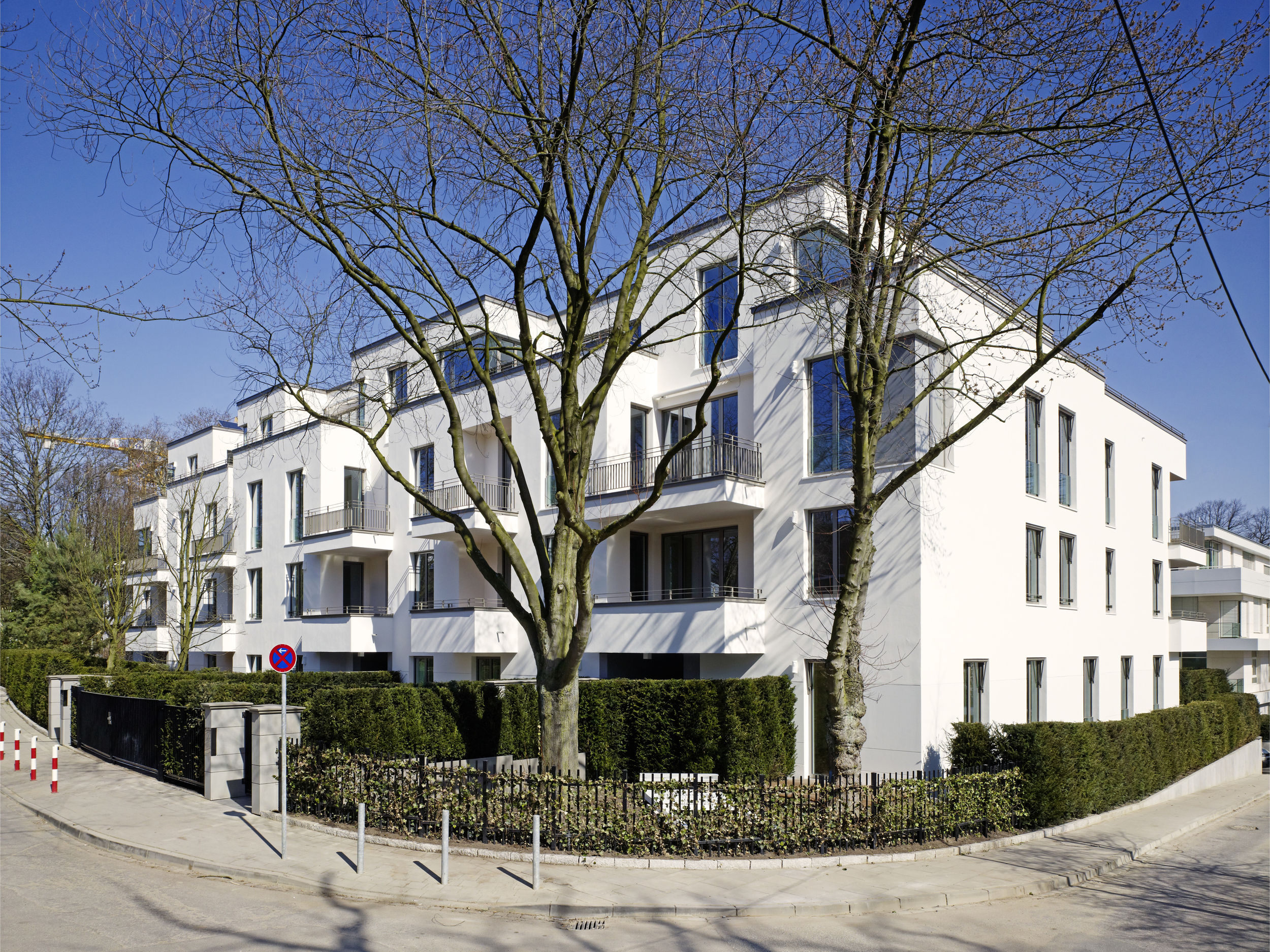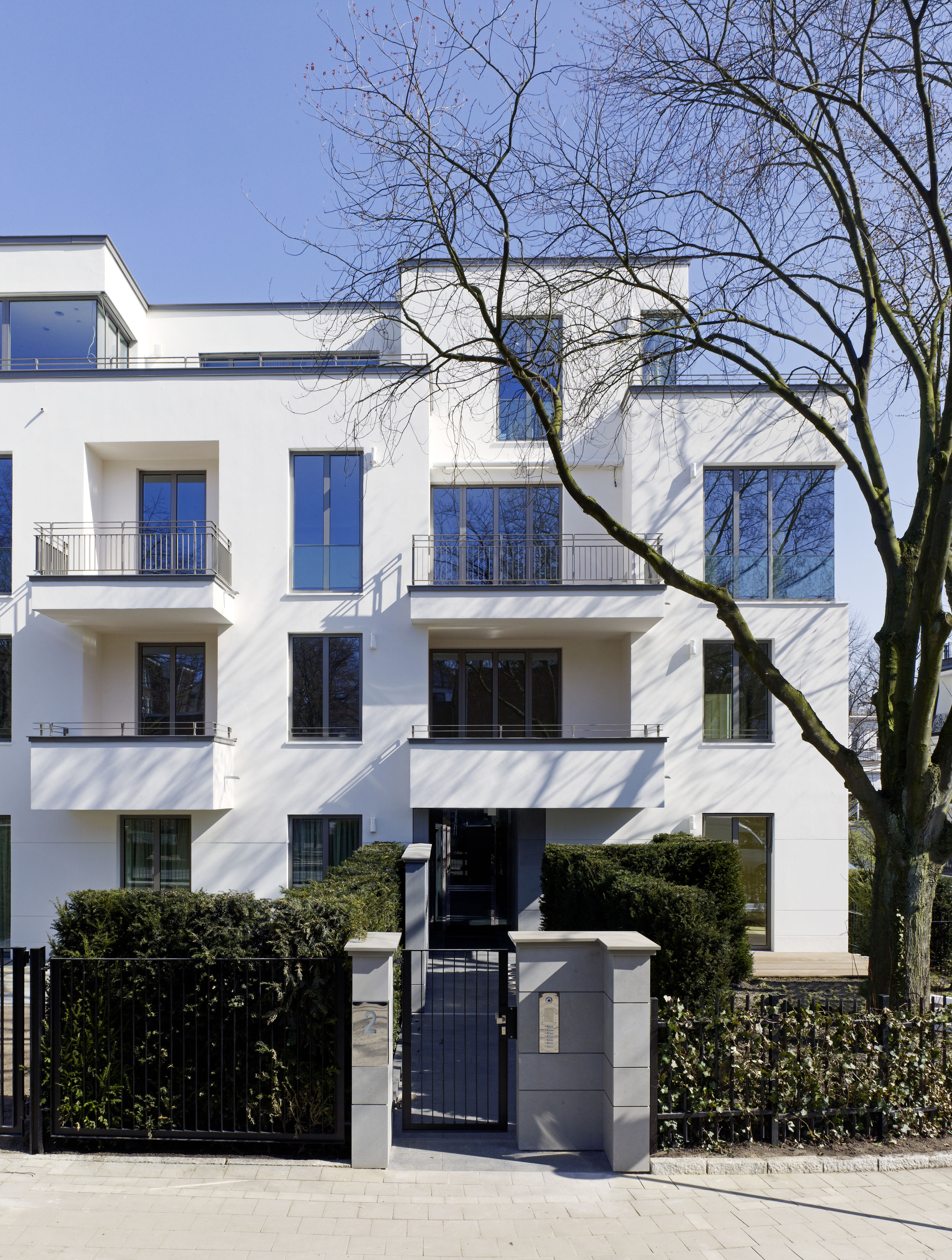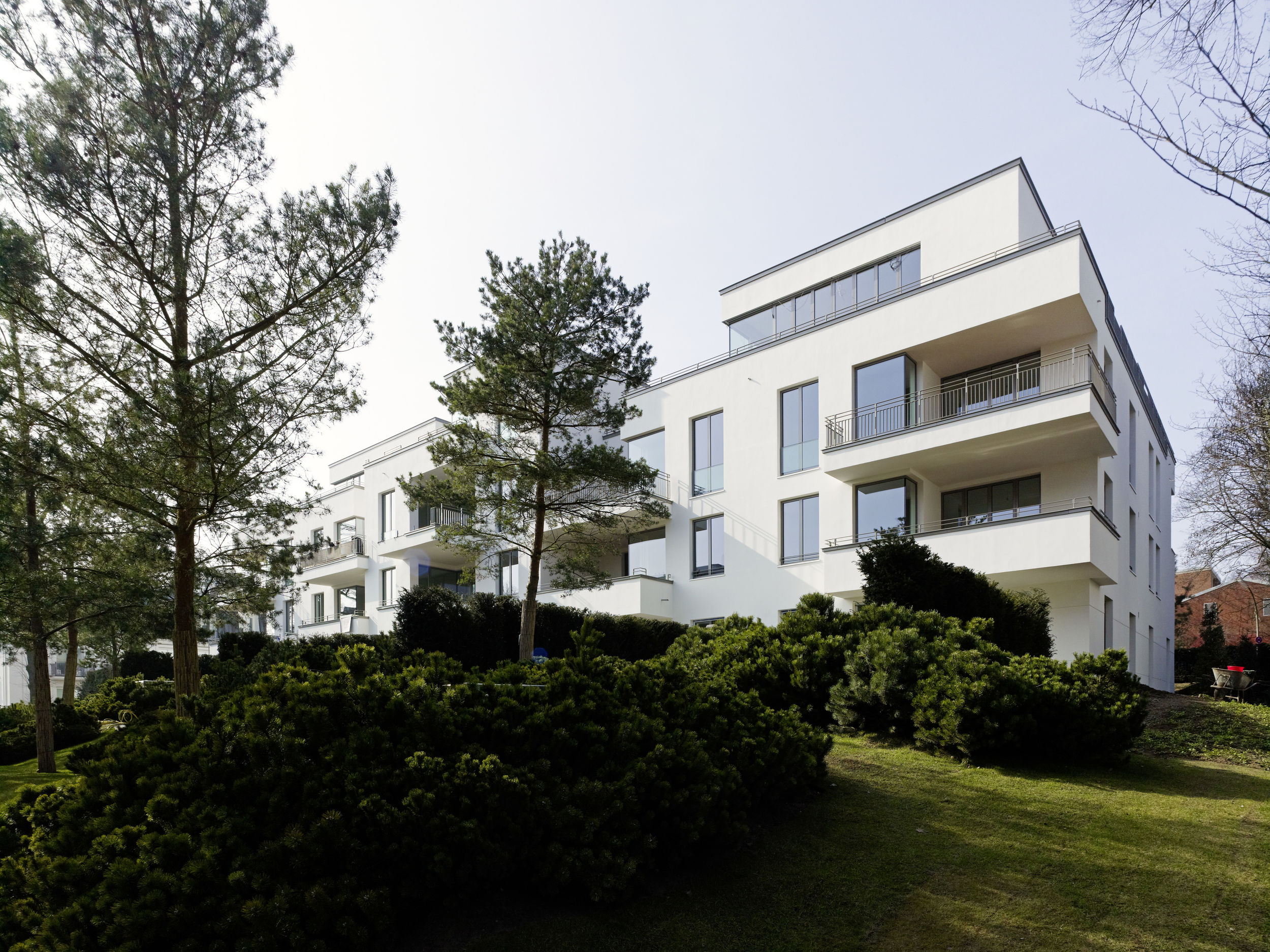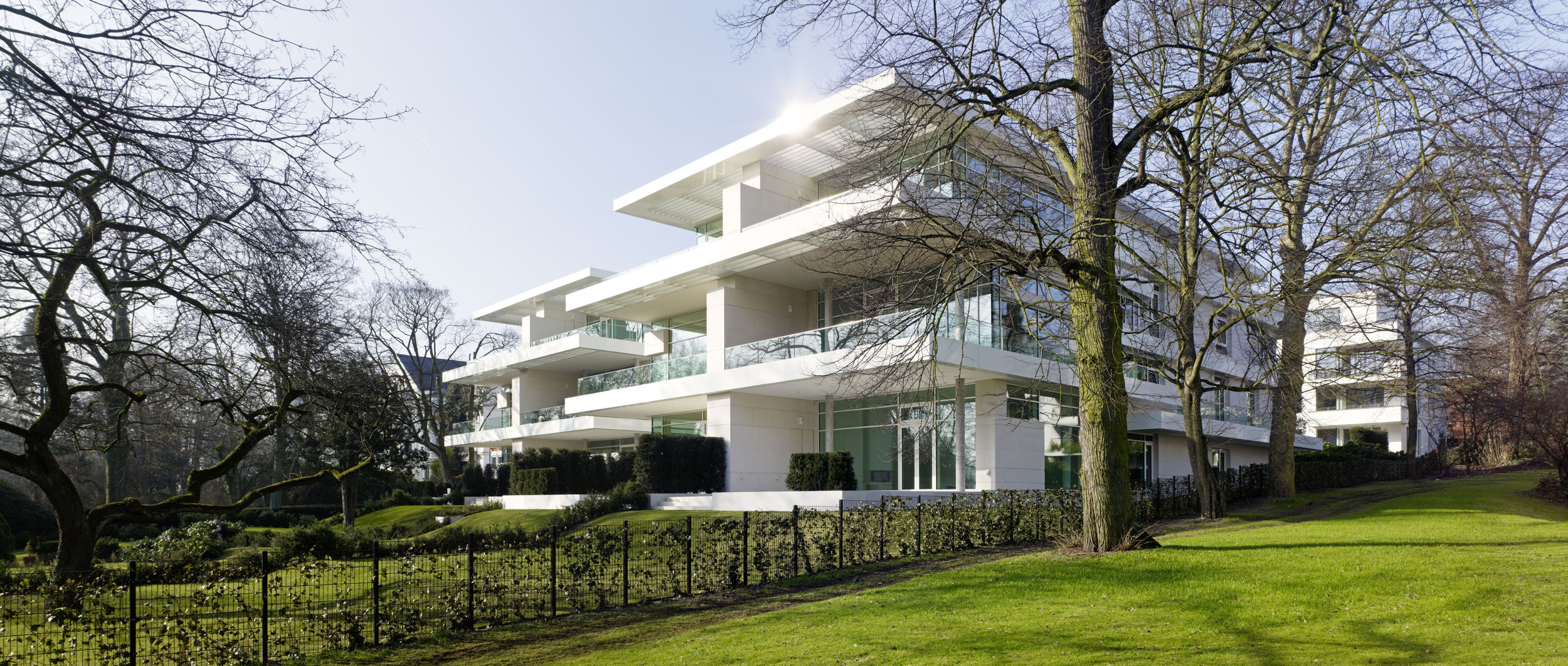 Die Besonderheit des Hamburger Stadtteils Harvestehude ist die ruhige begrünte Lage am Alsterpark. Das Ensemble besteht aus zwei Stadtvillen sowie einem Wohnpalais mit gesamthaft über 30 Wohneinheiten zwischen 145 und 300 m². Die Art des Bautyps der Stadtvilla an der wasserzugewandten Seite lässt den Blick zum Alsterpark auch für das höher gelegene Stadtpalais weitgehend zu. Die offene Bauweise lässt Innen- und Außenraum miteinander verschmelzen und erlaubt weite Blickachsen. Kleinmaßstäbliche Bauteile gliedern das kompakte Volumen der drei Wohnbauten; Vor- und Rücksprünge in der Fassade sowie Dachabstufungen unterstreichen dabei ihre vertikale Ausrichtung. Dem Projekt voran ging Ende 2009 ein mehrstufiger Wettbewerb, wobei sich die Büros BRT und BN Architekten den ersten Platz teilten. Die Realisierung aller dreier Gebäude und der exklusive Innenausbau der meisten Einheiten wurde BN Architekten übertragen.