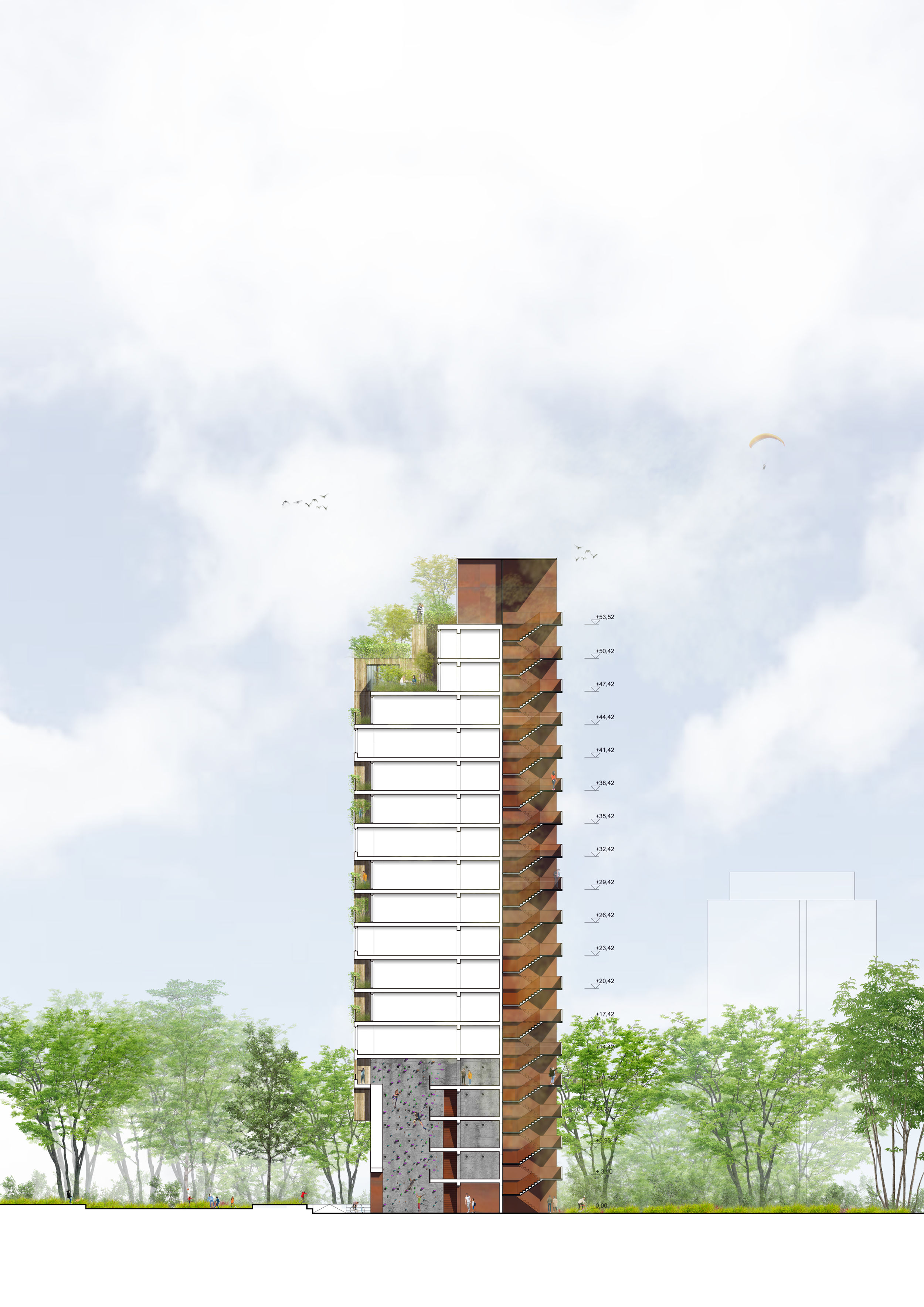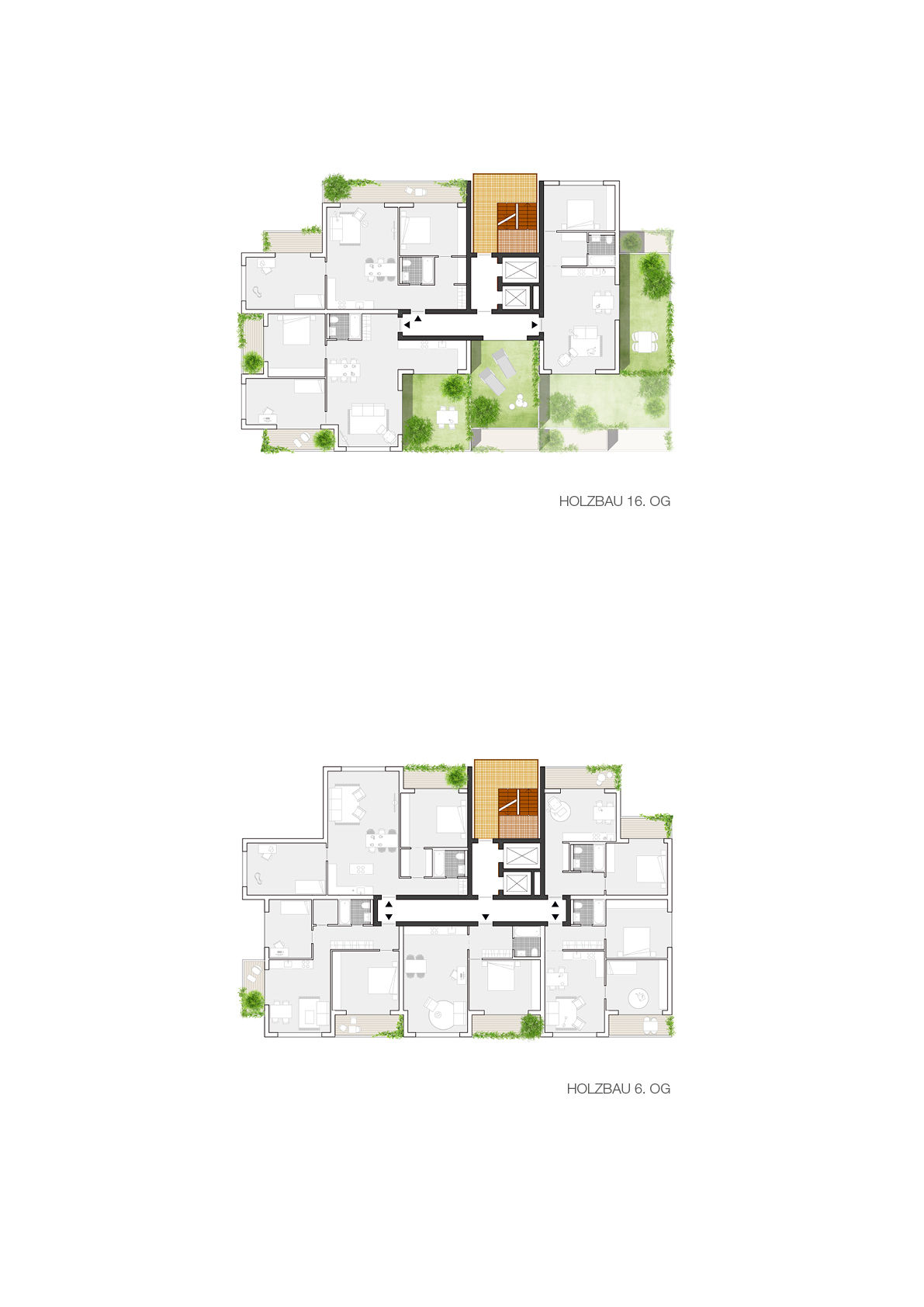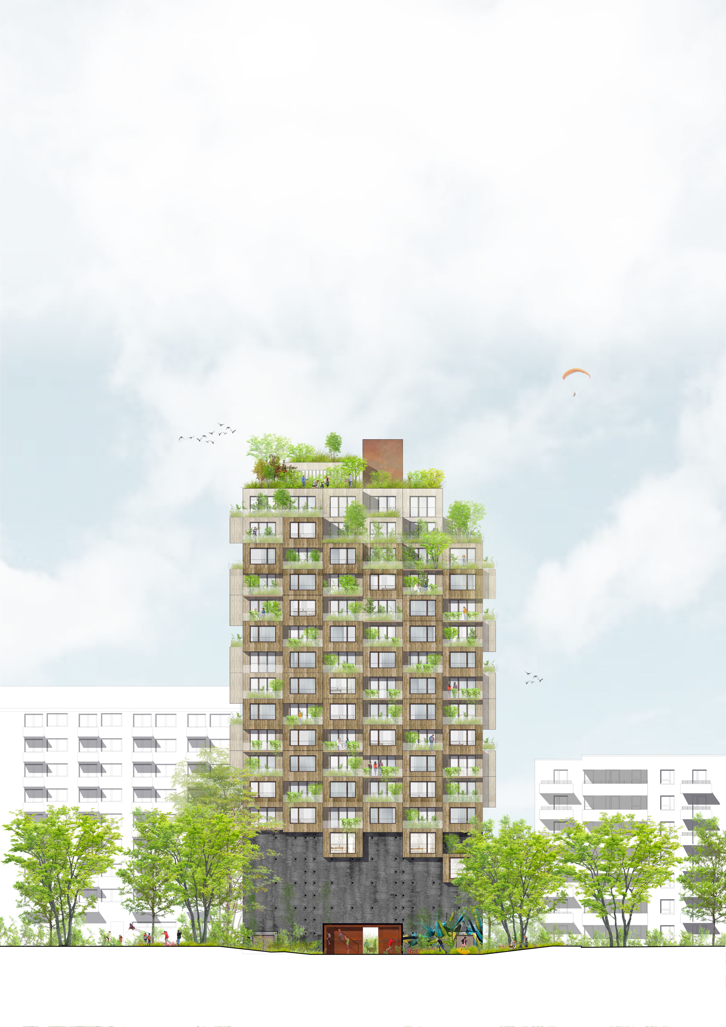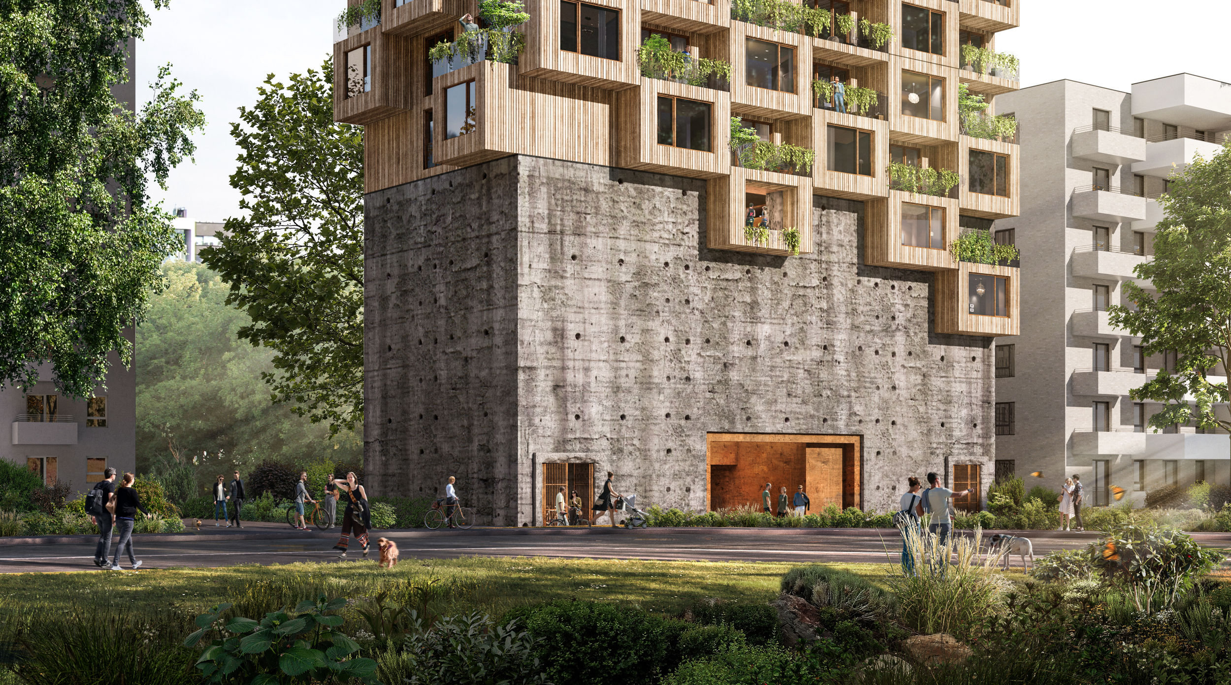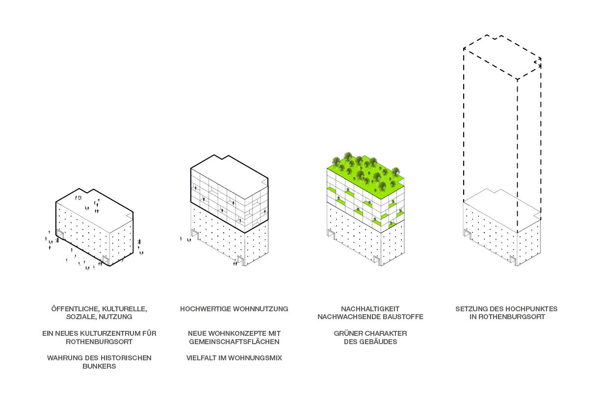 Der Bunker als Bestandsgebäude bietet ausreichend Volumen für eben dieses neue Stadtteilzentrum von Rothenburgsort und dient baulich zusätzlich als Fundament für ein markantes und weithin sichtbares Wohnhochaus in Holzbauweise. Die typisch spröde Betonoptik des Bunkers wird durch die funktional ablesbare und gelungene Architektur des neuen Wohnens aufgewertet. Der Kontrast der beiden maßgeblichen Baustoffe, Beton und Holz, verleiht dem Projekt ein gelungenes Maß an Spannung und fokussiert auf den in den oberen Etagen gewonnen Lebensraum für zahlreiche neue Bewohner des Quartiers. Das Projekt entspricht damit in jeder Hinsicht dem Gebot der Nachhaltigkeit und macht diese deutlich erlebbar.