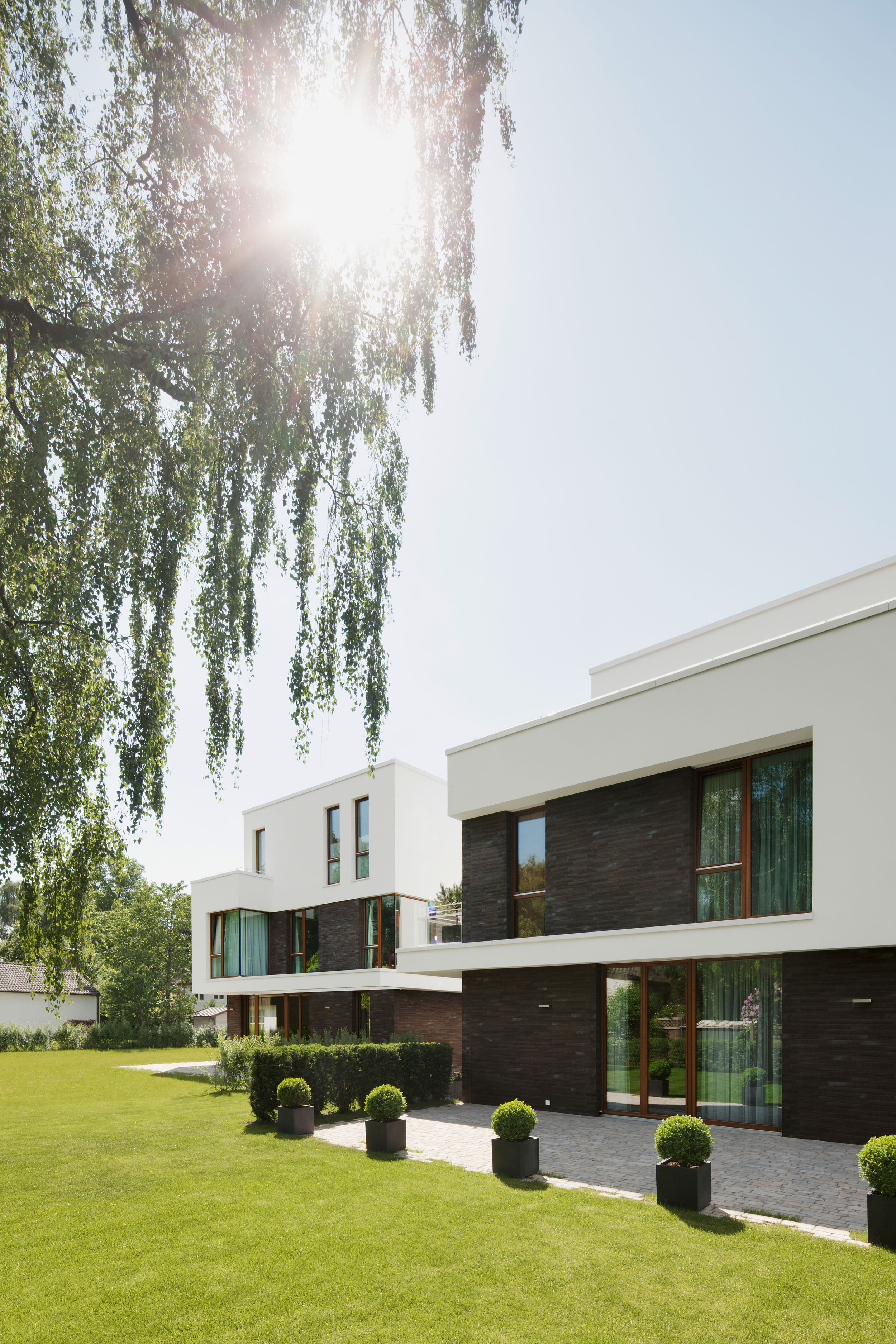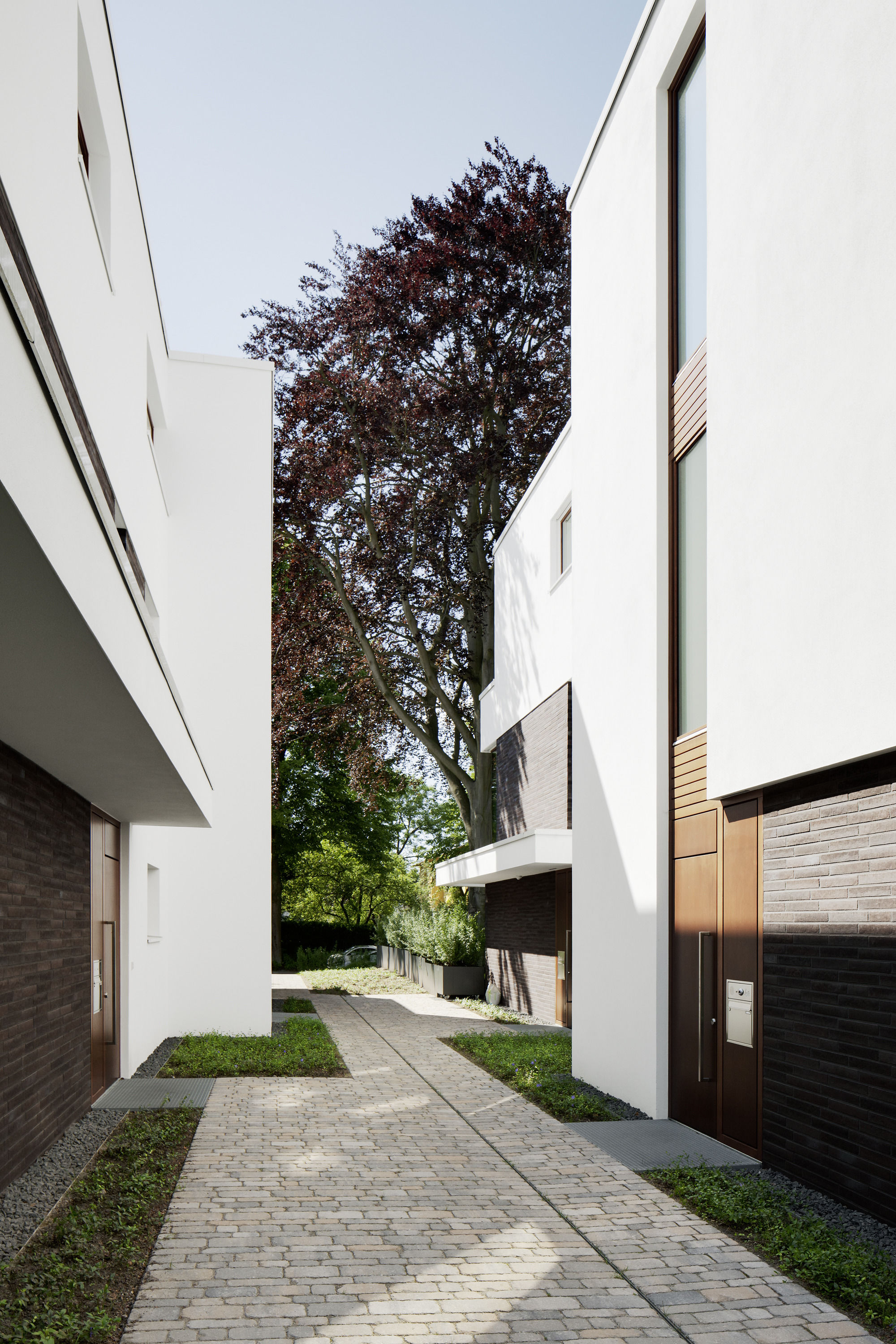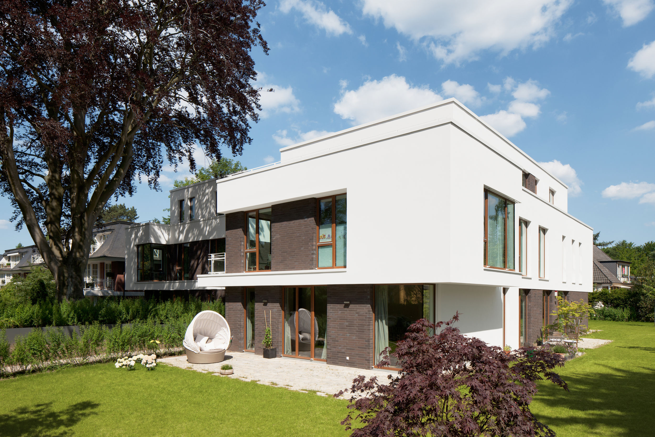 Auf einem Gartengrundstück im Westen Hamburgs entstanden zwei Villen in bester Lage. Die Anordnung der beiden Gebäude auf dem schmalen Grundstück wird durch die deutlich sichtbare Idee einer verbindenden Fassaden- und Strukturausformung unterstrichen. Mit einer genau abgestimmten Materialwahl schafft das Gesamtkonzept ein harmonisches und einladendes Wohnumfeld. Durch Vor- und Rücksprünge in der Fassade, private Eingänge für alle Wohneinheiten, sowie die Verschiebung der Balkone und Terrassen wird die Privatsphäre gesteigert und der Blick auf das Gartengrundstück ermöglicht.