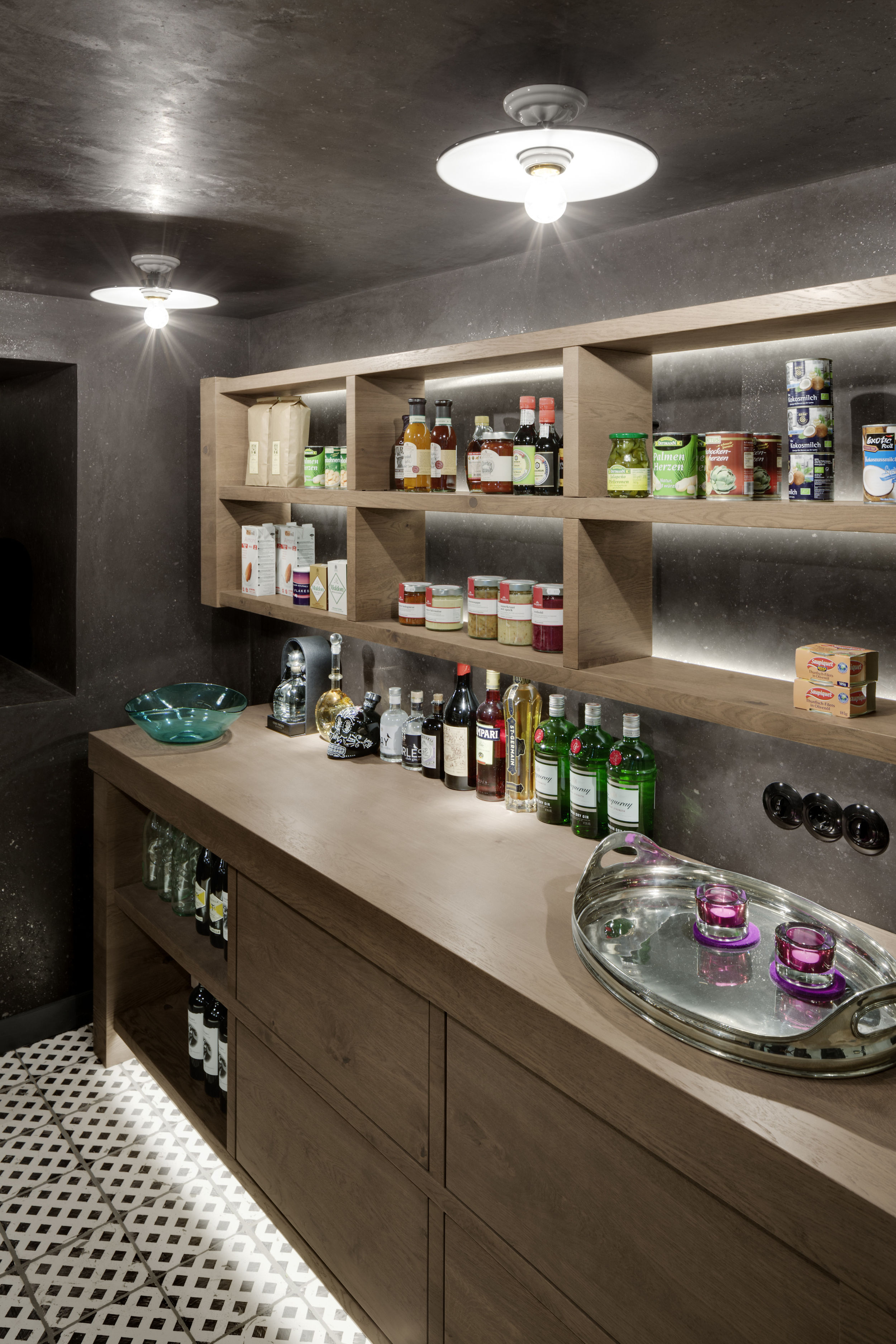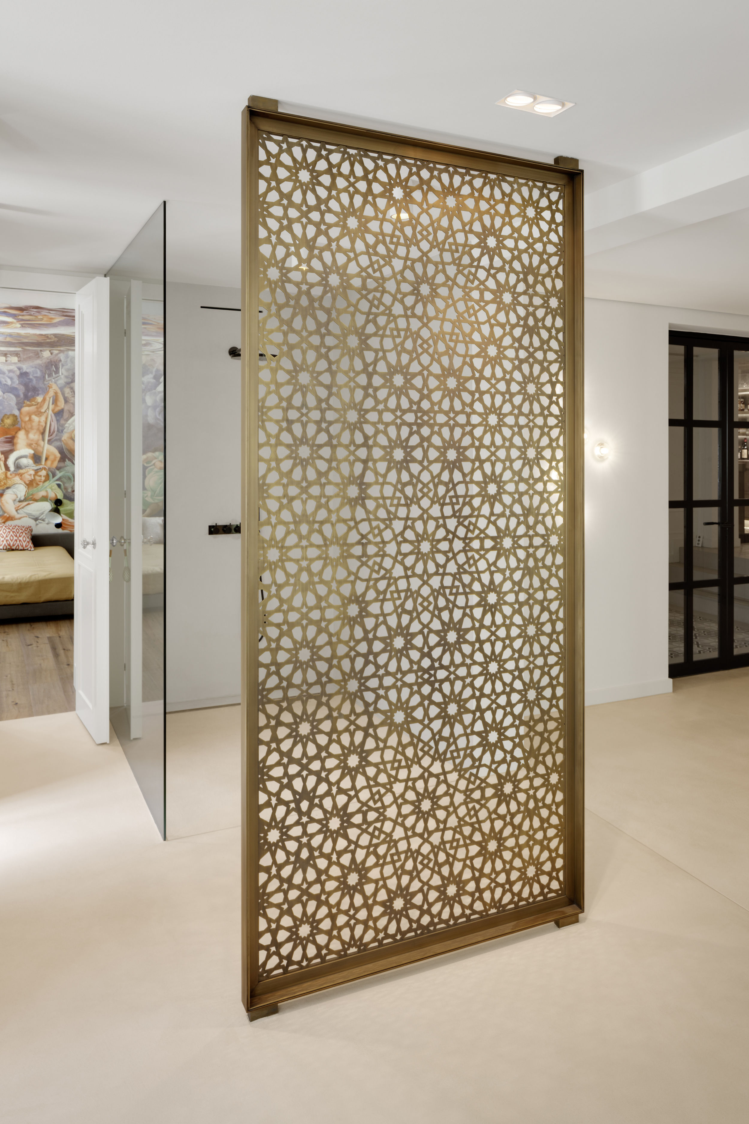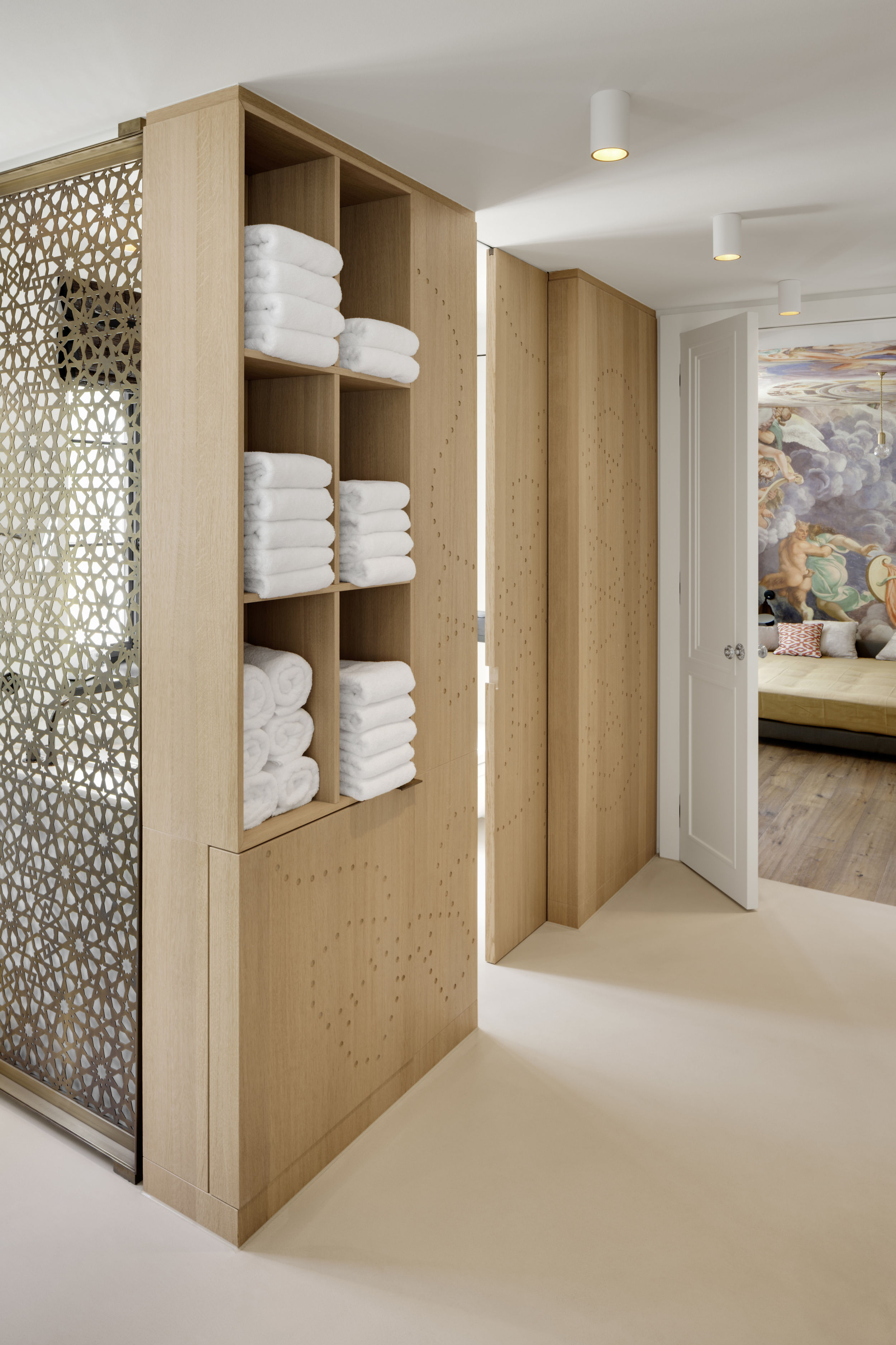 Die Sohle der denkmalgeschützten Villa in Hamburg Othmarschen wurde um 50 cm herab gesenkt, so dass ein neues vollwertiges Wohngeschoss entstand. Über eine schlichte, helle, moderne Treppe in SoloCalce-Technik, einer natürlichen Kalkputztechnik alter italienischer Palazzi, gelangt man in das großzügige Entrée des Untergeschosses. Links fällt der Blick auf den monolithischen Marmorkubus - die Dampfsauna. Die Dampfsauna erscheint von außen in einem opulenten, polierten, hellen Marmor - dem Stratuario - mit hellen markanten und feinen grauen Adern. Die Sitzelemente in einem dunklen Mosaik erinnern an das flirrende Farbenspiel einer Libelle. Den Loungebereich bestimmt eine großzügige Sitzlandschaft, sowie ein opulenter Kronleuchter an der Decke. Aus dem Entrée kommend, gelangt man ins Gästezimmer.