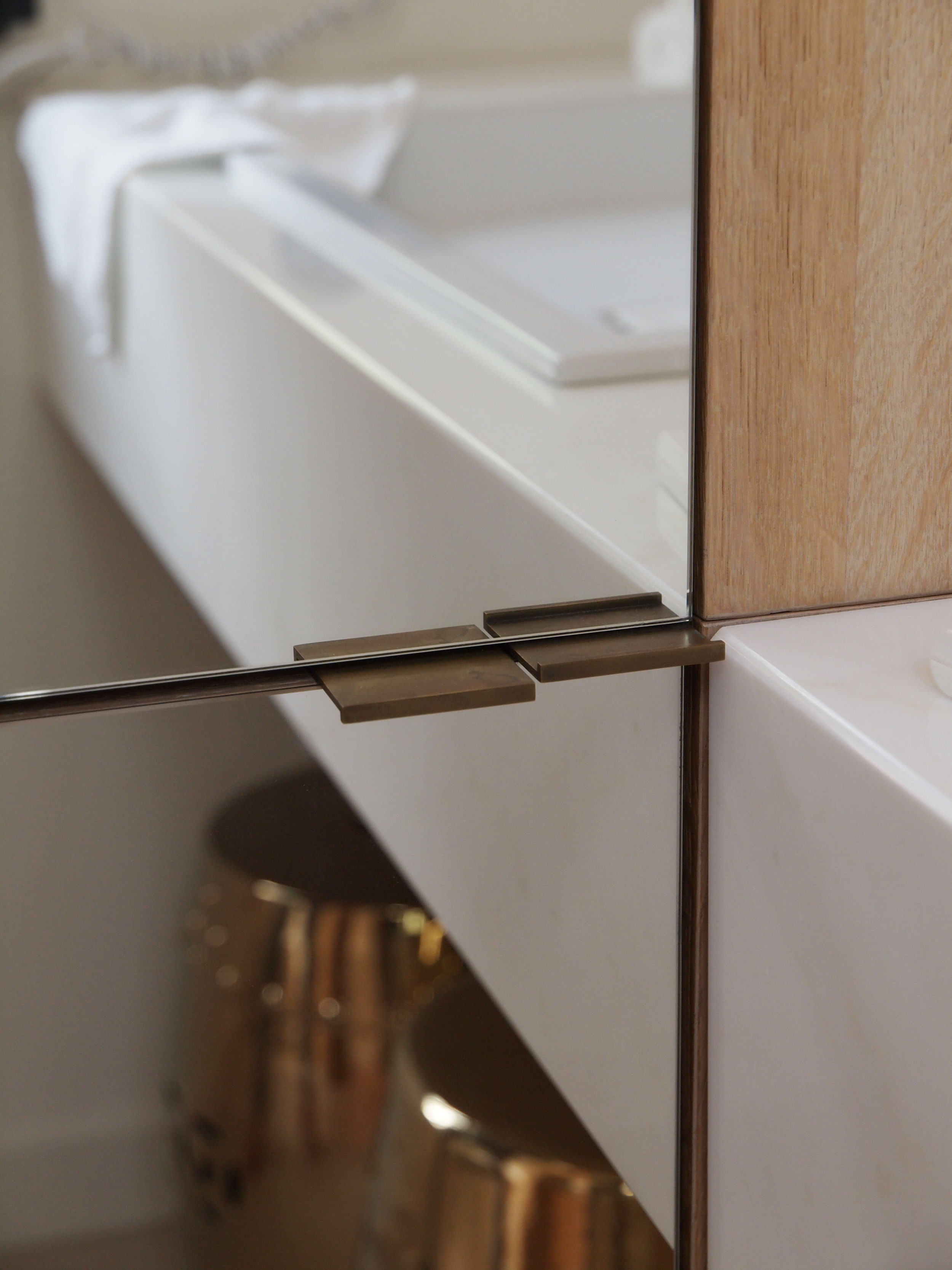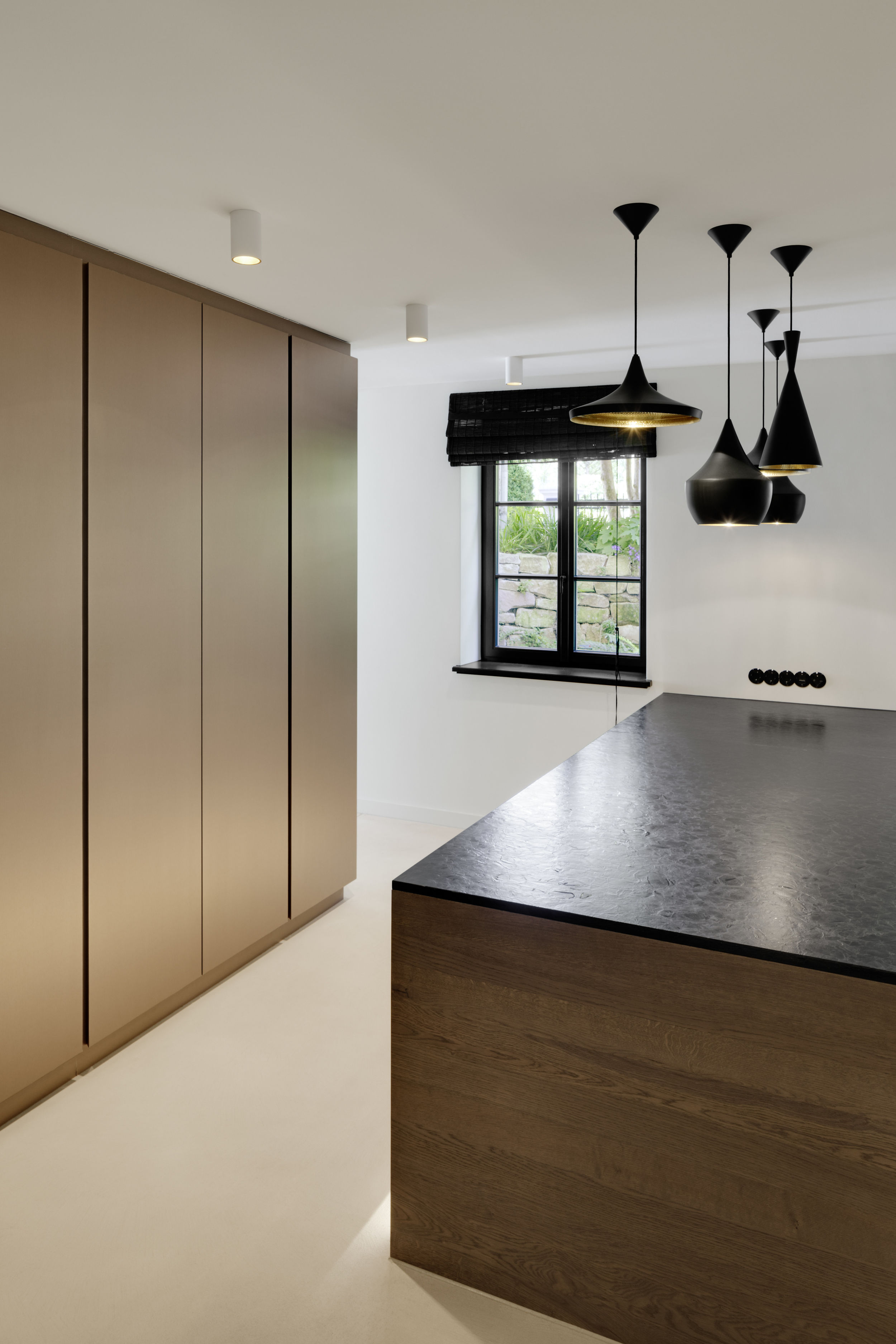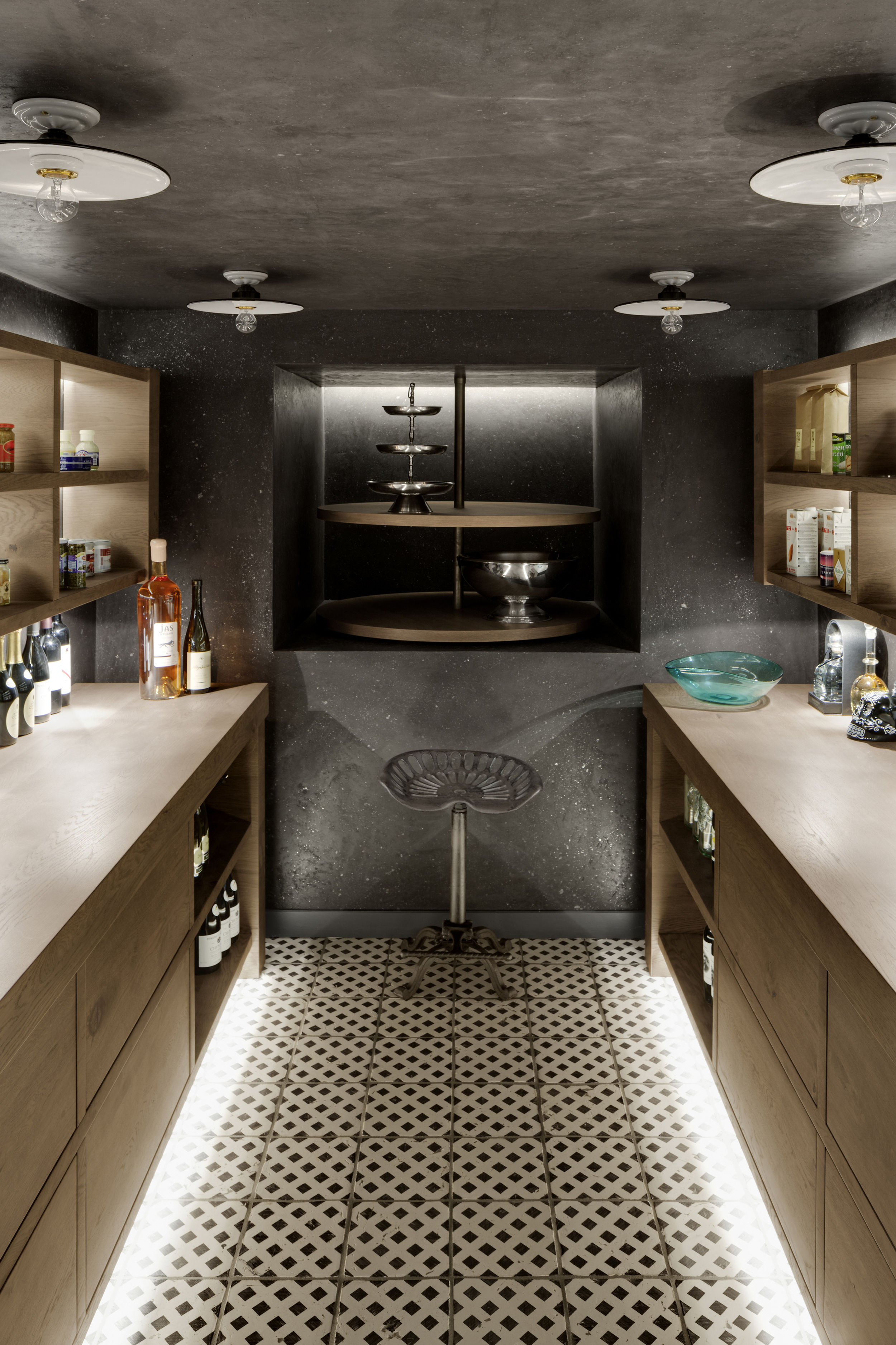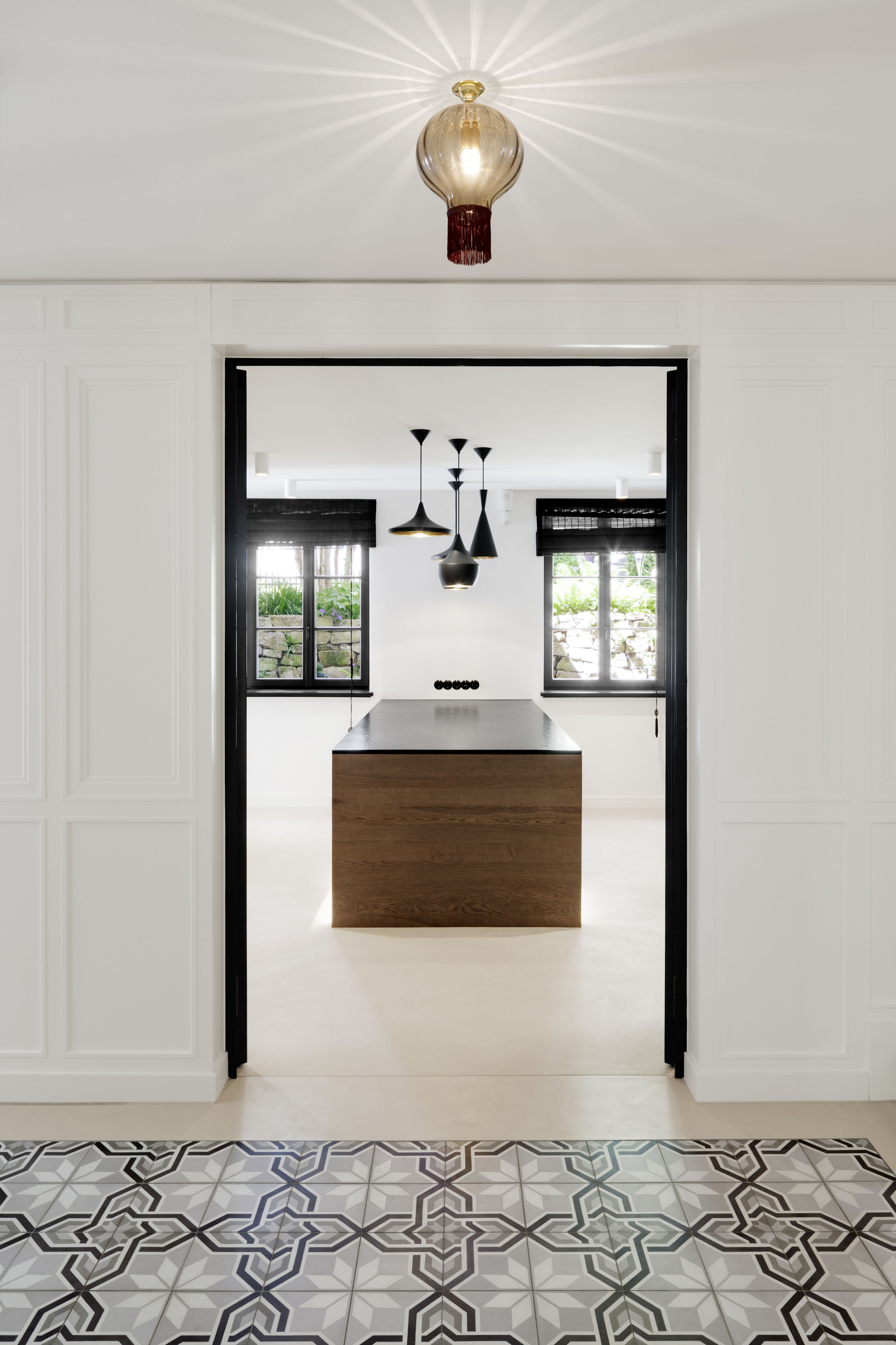 Die Sohle der denkmalgeschützten Villa in Hamburg Othmarschen wurde um 50 cm herab gesenkt, so dass ein neues vollwertiges Wohngeschoss entstand. Über eine schlichte, helle, moderne Treppe in SoloCalce-Technik, einer natürlichen Kalkputztechnik alter italienischer Palazzi, gelangt man in das großzügige Entrée des Untergeschosses. Links fällt der Blick auf den monolithischen Marmorkubus - die Dampfsauna. Die Dampfsauna erscheint von außen in einem opulenten, polierten, hellen Marmor - dem Stratuario - mit hellen markanten und feinen grauen Adern. Die Sitzelemente in einem dunklen Mosaik erinnern an das flirrende Farbenspiel einer Libelle. Den Loungebereich bestimmt eine großzügige Sitzlandschaft, sowie ein opulenter Kronleuchter an der Decke. Aus dem Entrée kommend, gelangt man ins Gästezimmer.